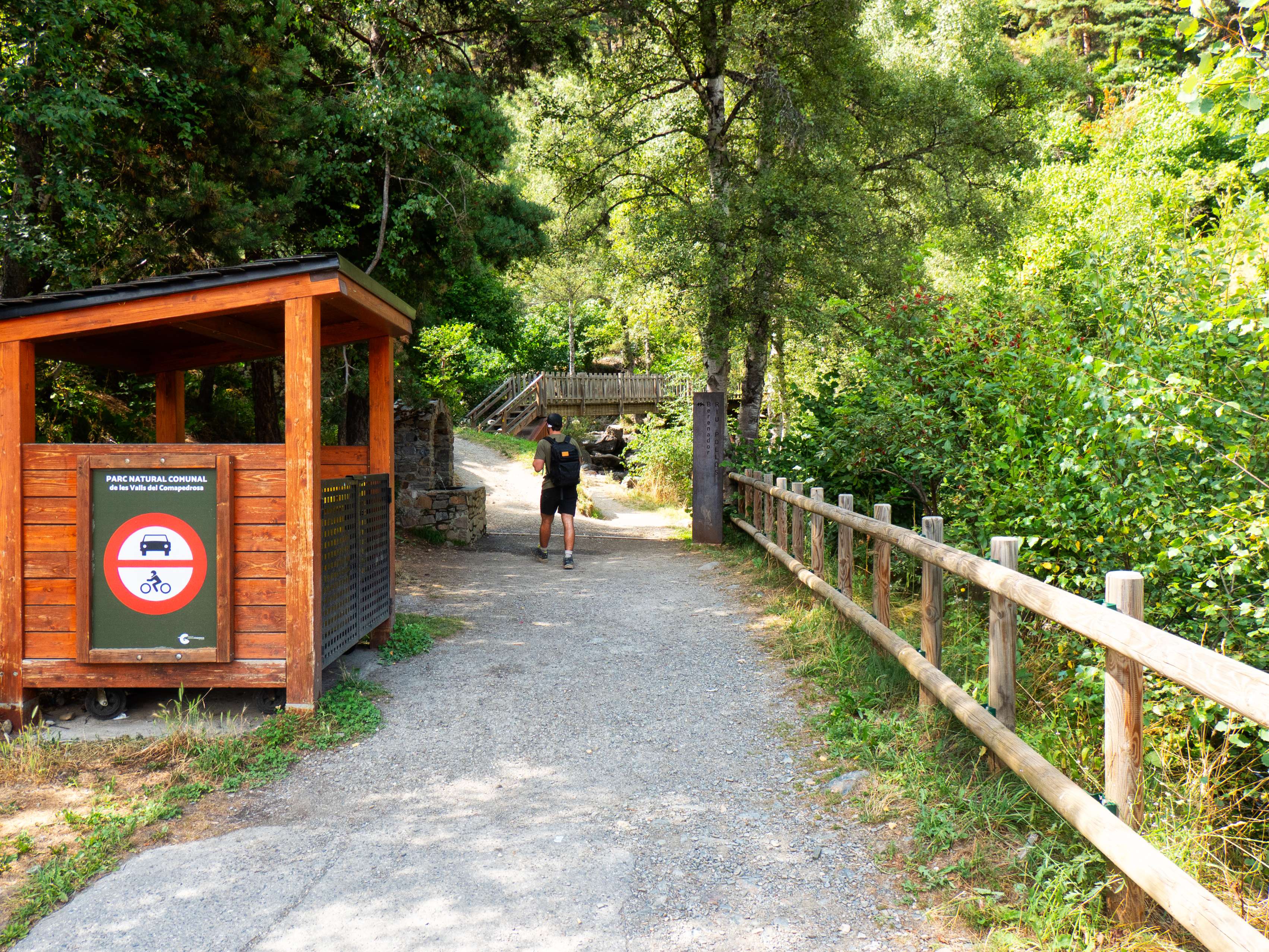 Tras descender por la carretera hasta llegar a la confluencia con el Riu Pollós, también llamado Riu d'Arinsal, tomamos la pista que se adentra en el Parc Natural Comunal de les Valls de Comapedrosa.