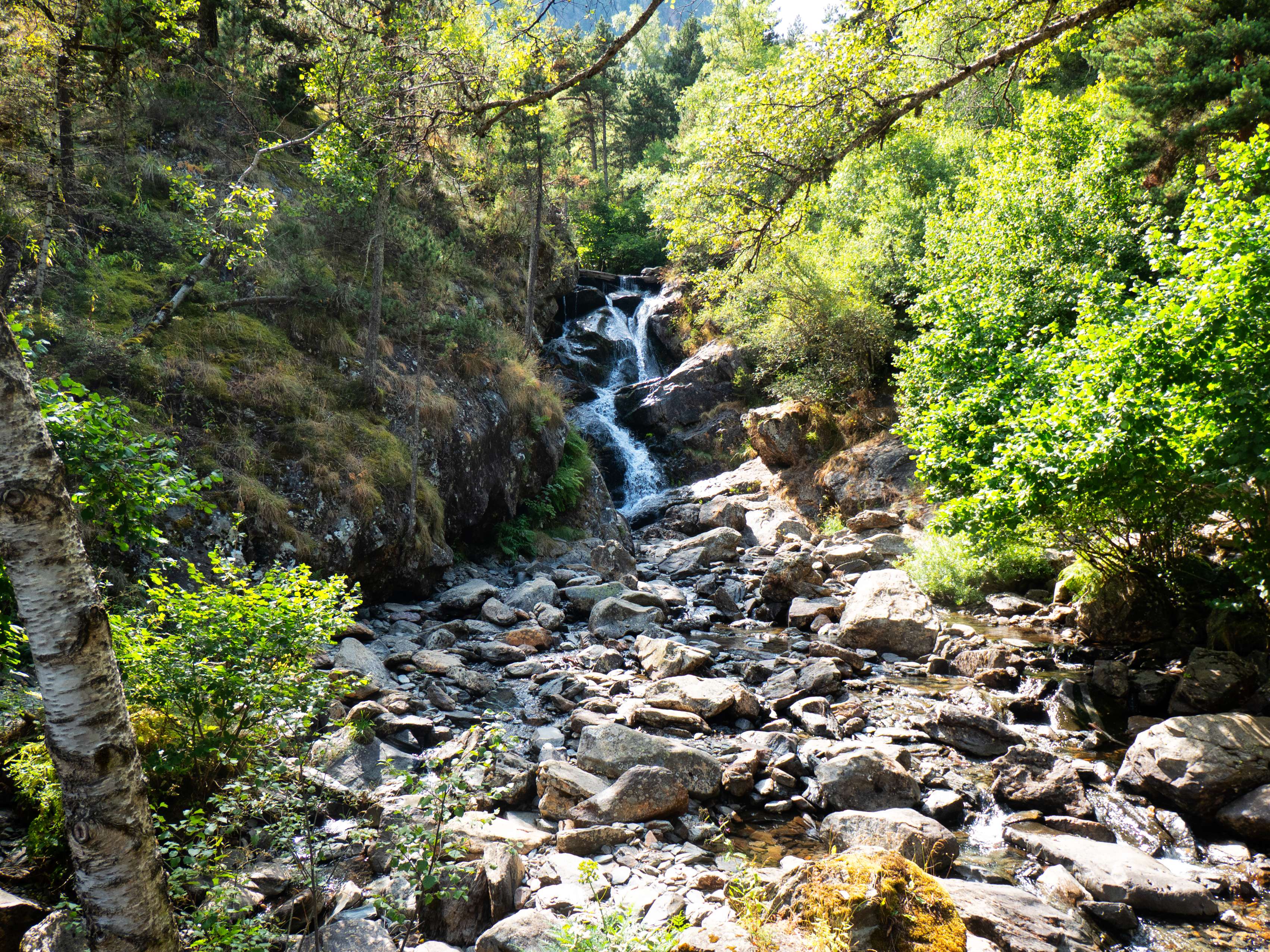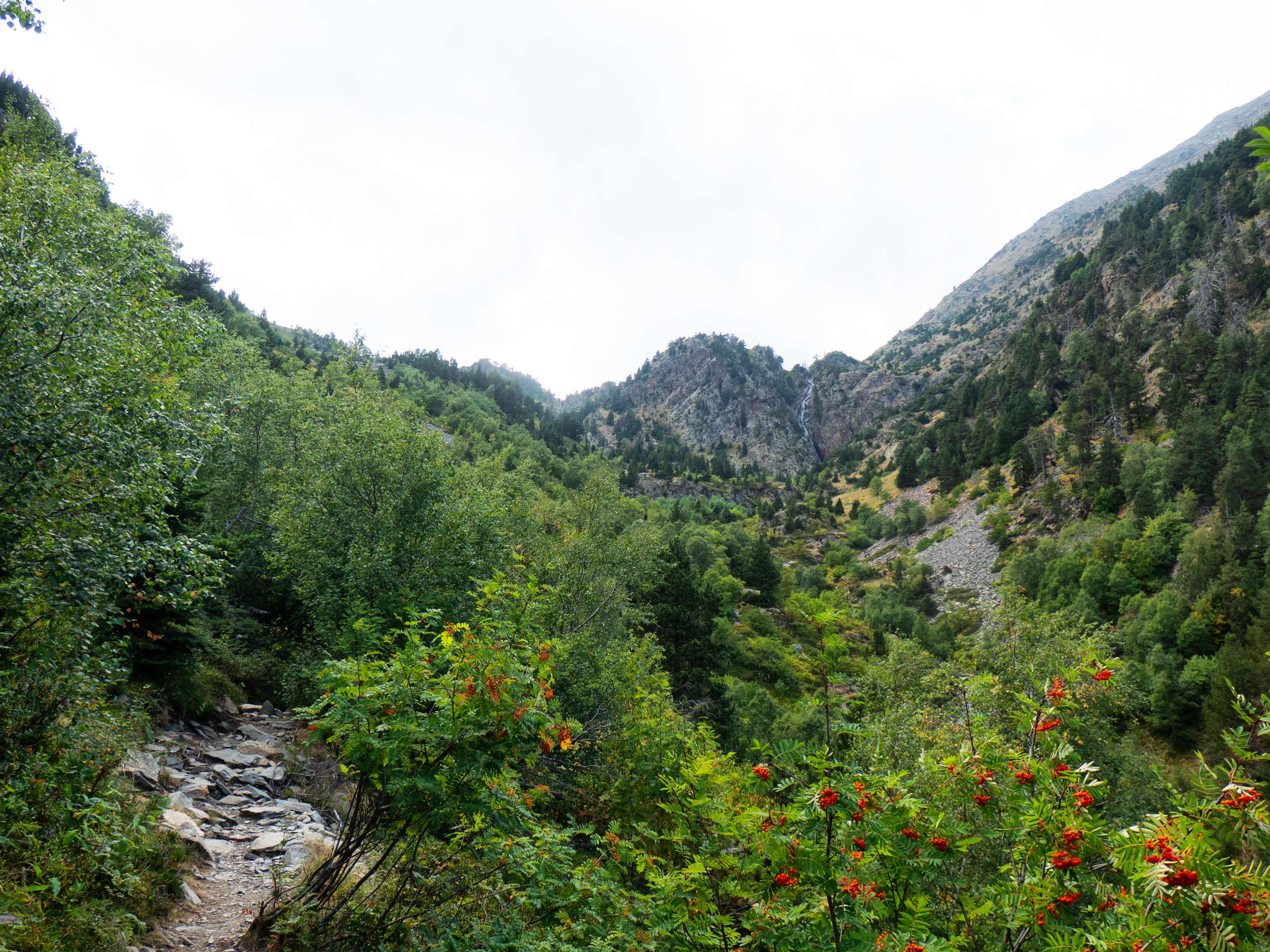 Nosotros, poco a poco, vamos adentrándonos por el brazo izquierdo del mencionado valle, avanzando junto al torrente de Comapedrosa, que más arriba se precipita formando una bella cascada. El camino asciende, ahora más suavemente, hacia el promontorio rocoso situado a la izquierda de la cascada.