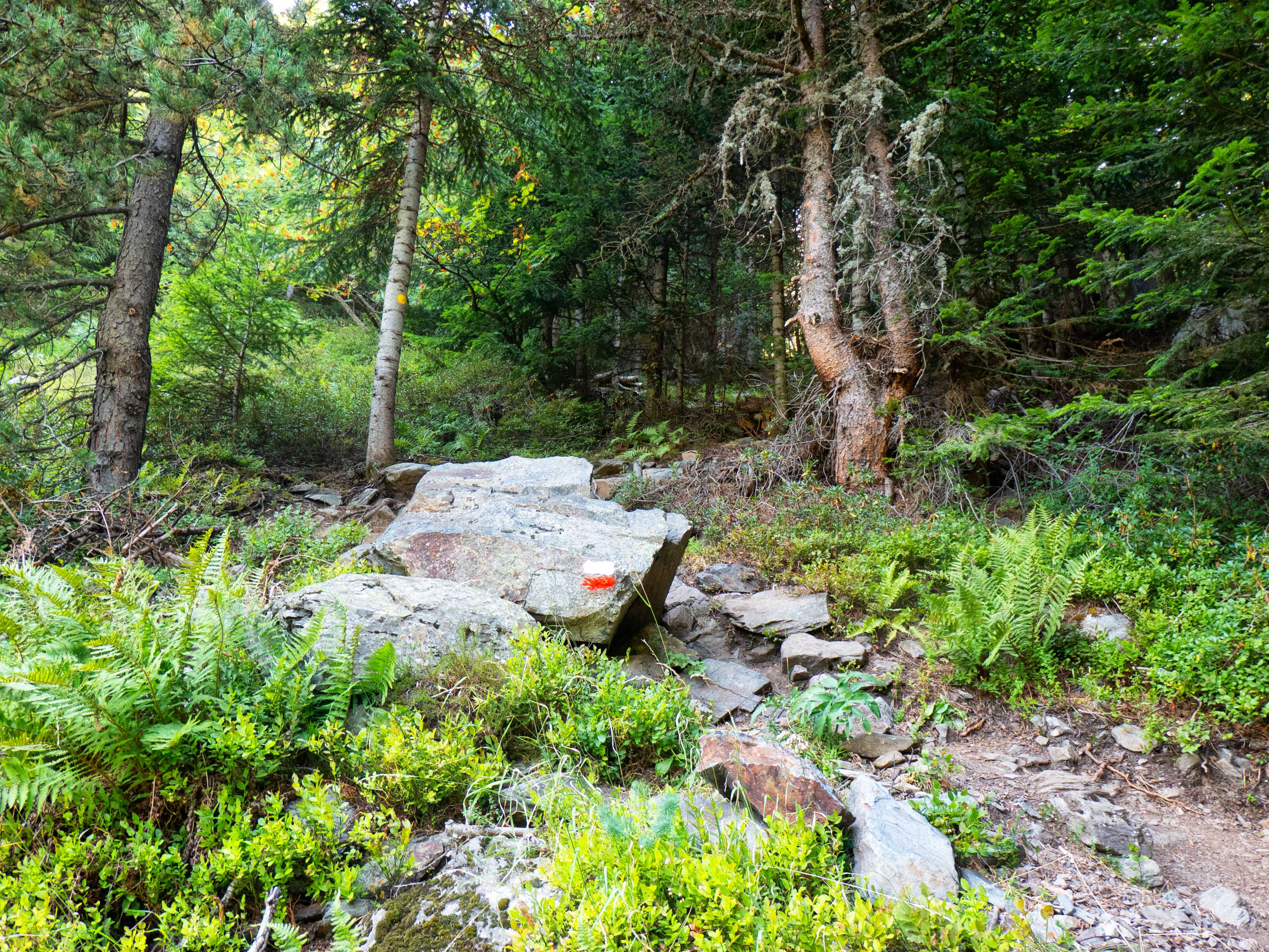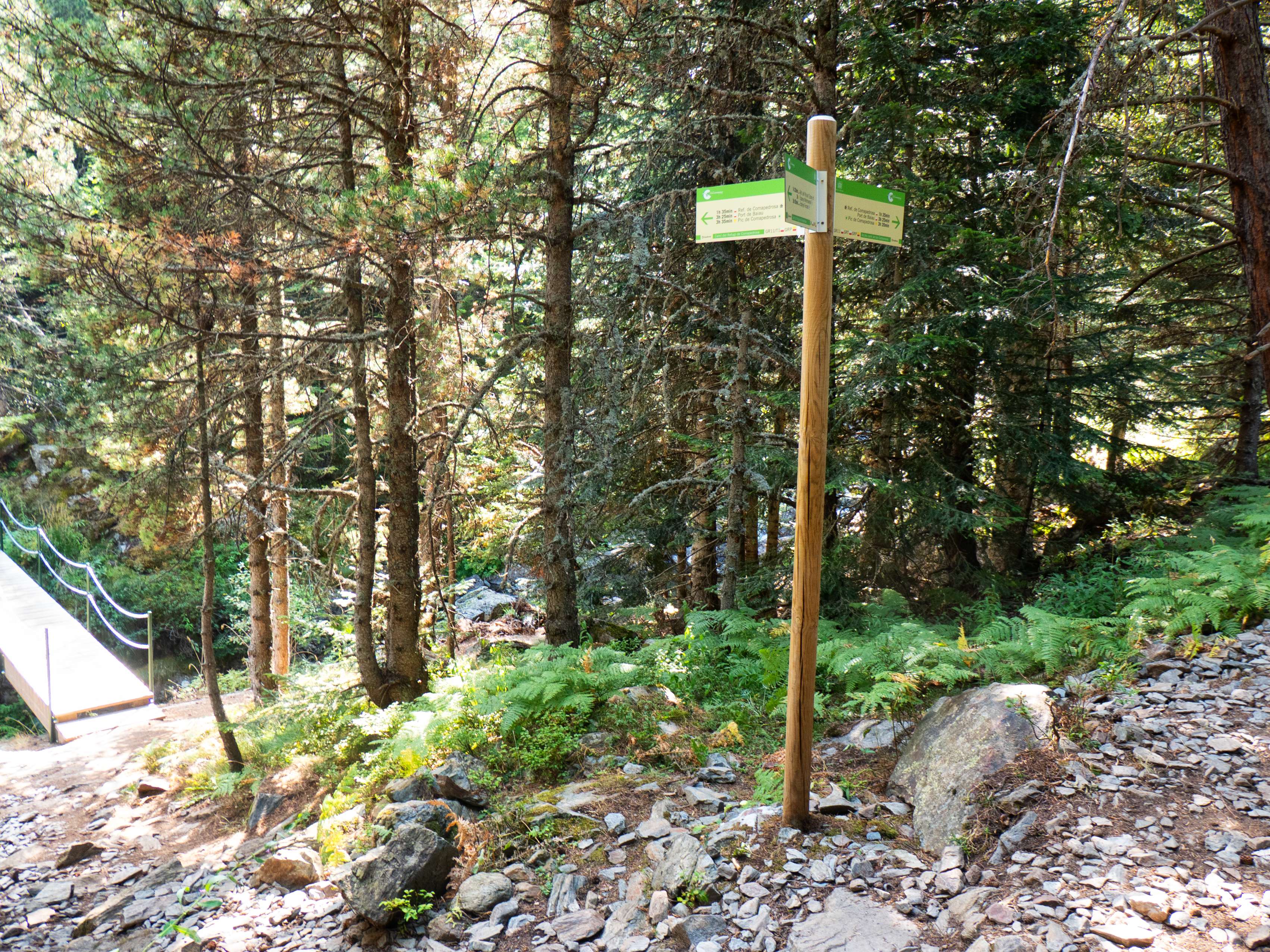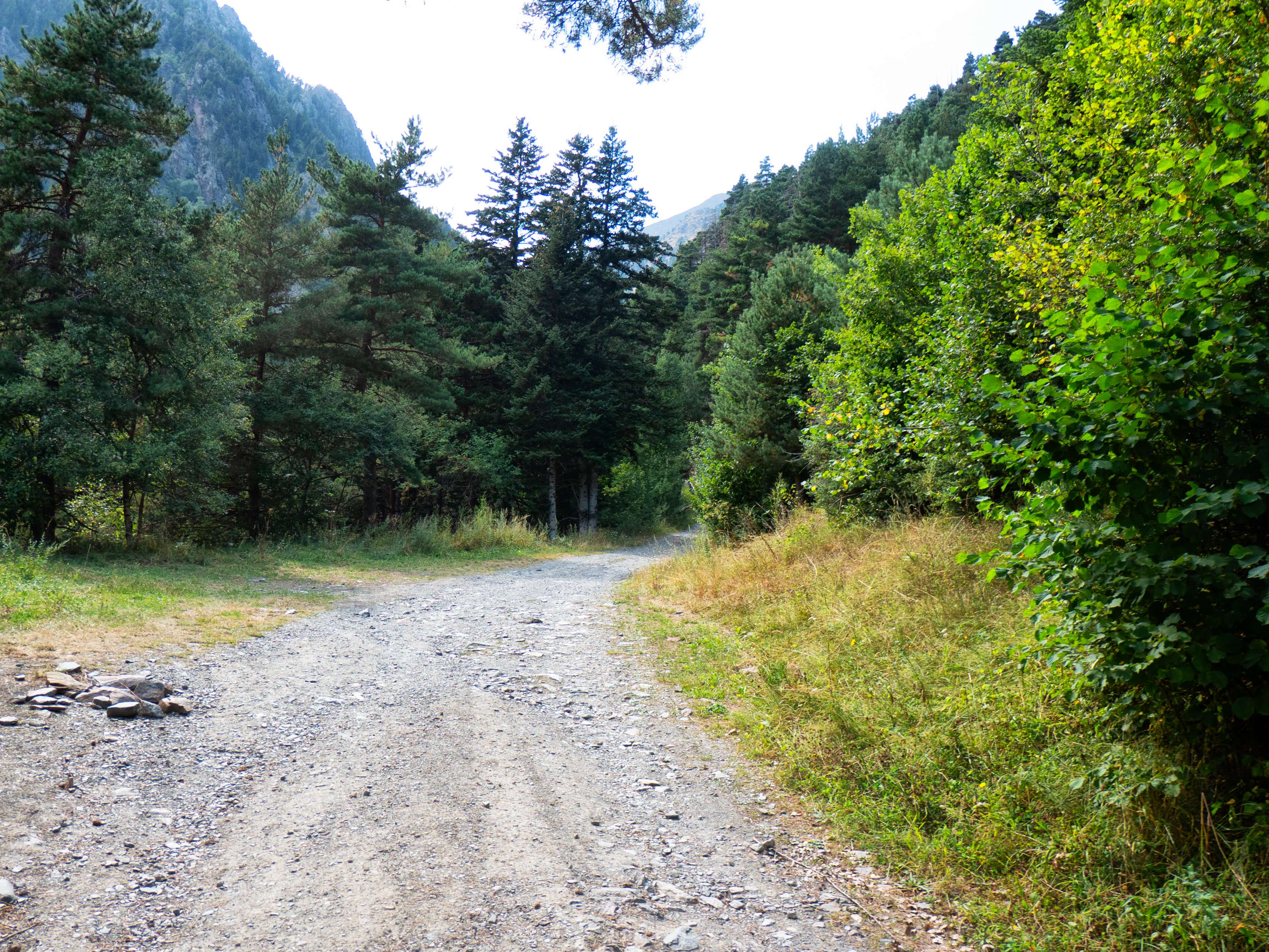 Existen varias opciones, todas bien señalizadas (incluso en exceso, pues pueden llegar a confundir), para alcanzar el refugio de Comapedrosa, donde pretendemos pasar la noche. Nosotros, en la ida, optamos por el GR que, después de remontar una cincuentena de metros junto al río, gira bruscamente a la derecha en fuerte pendiente para unirse a la pista que sube al Pla de l'Estany.