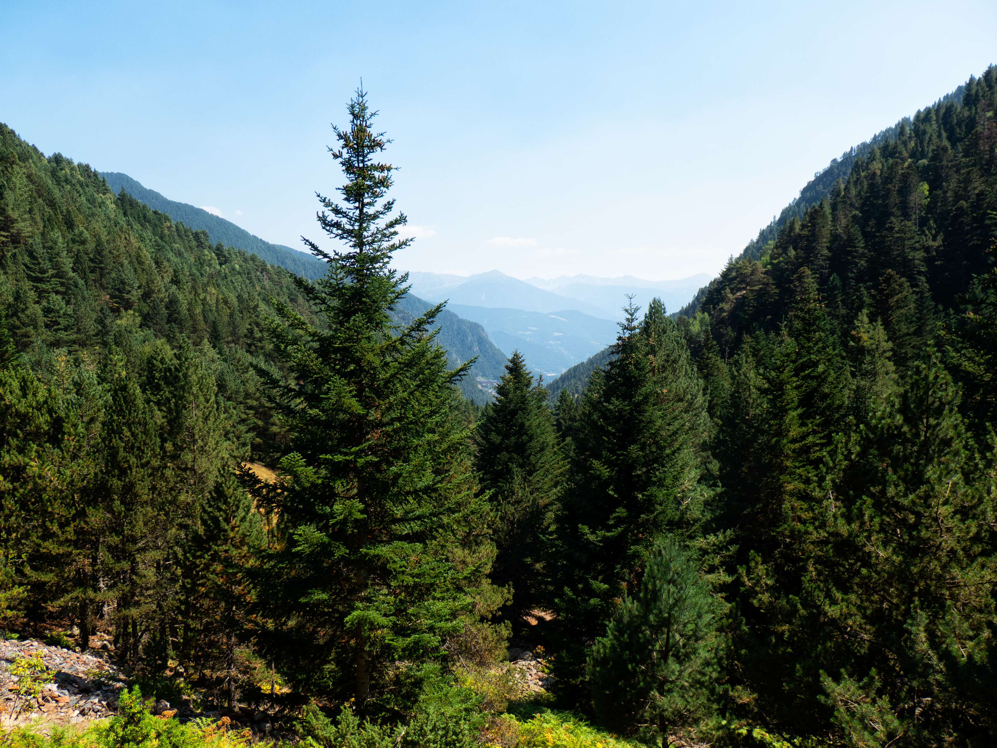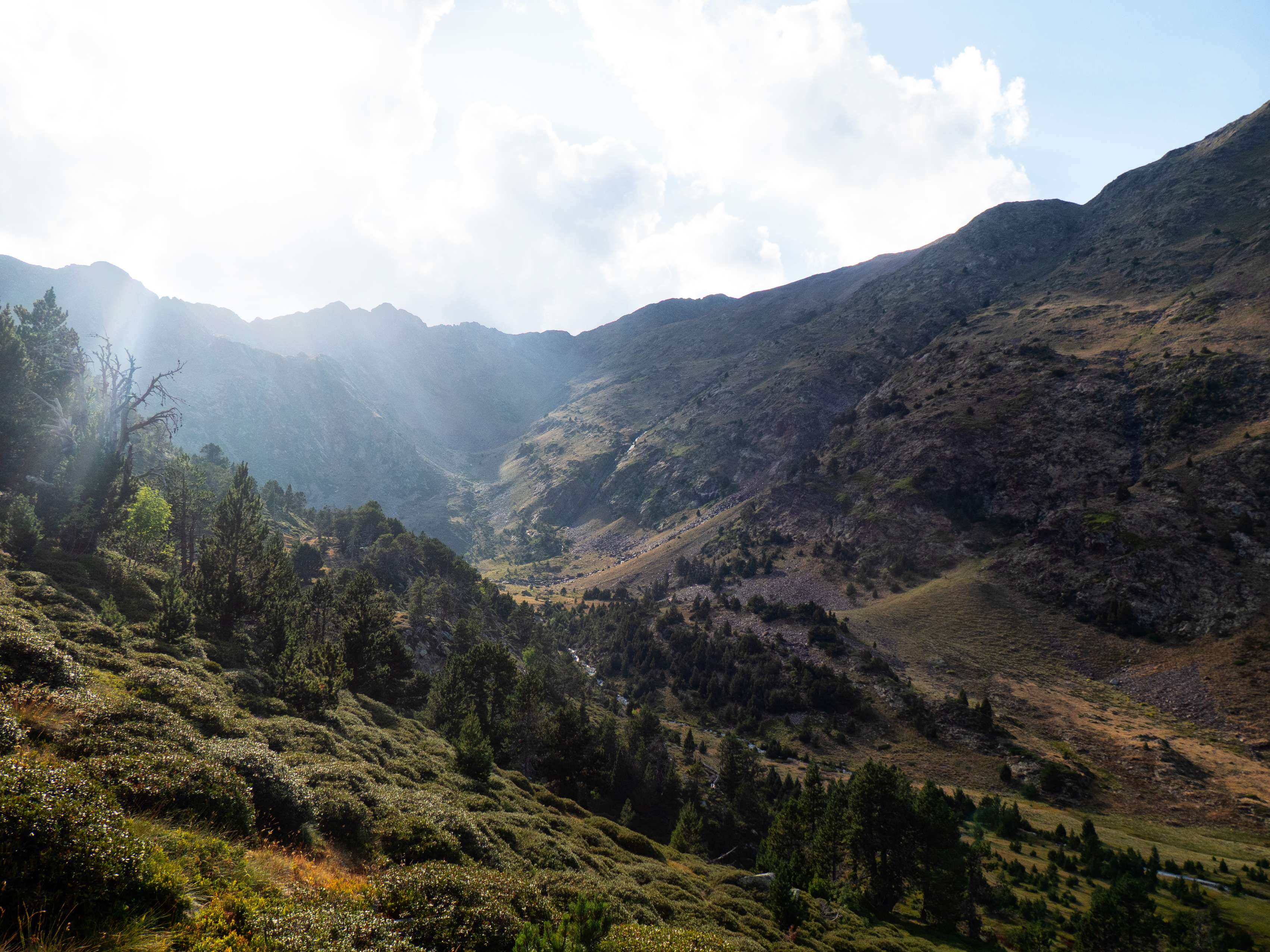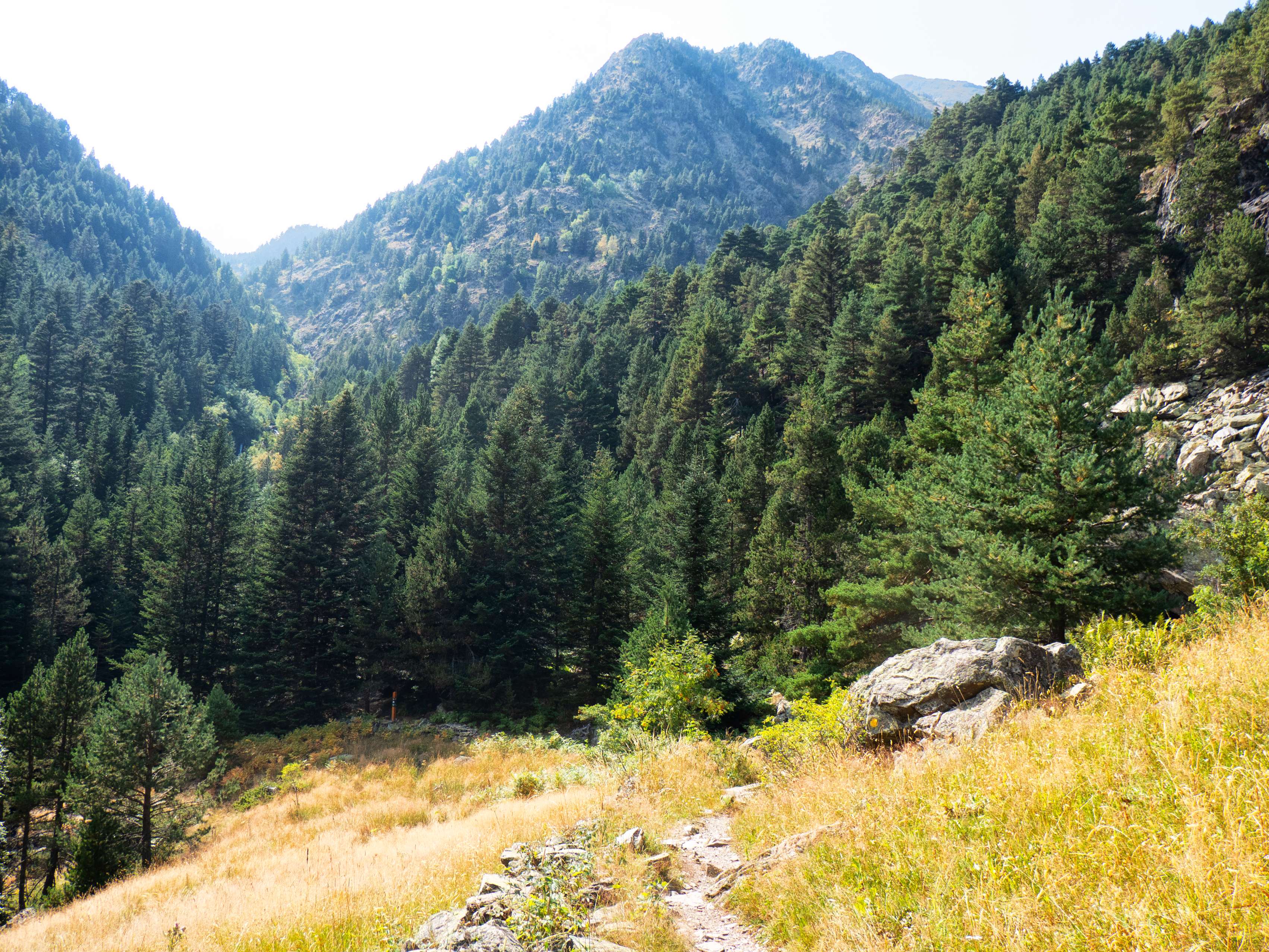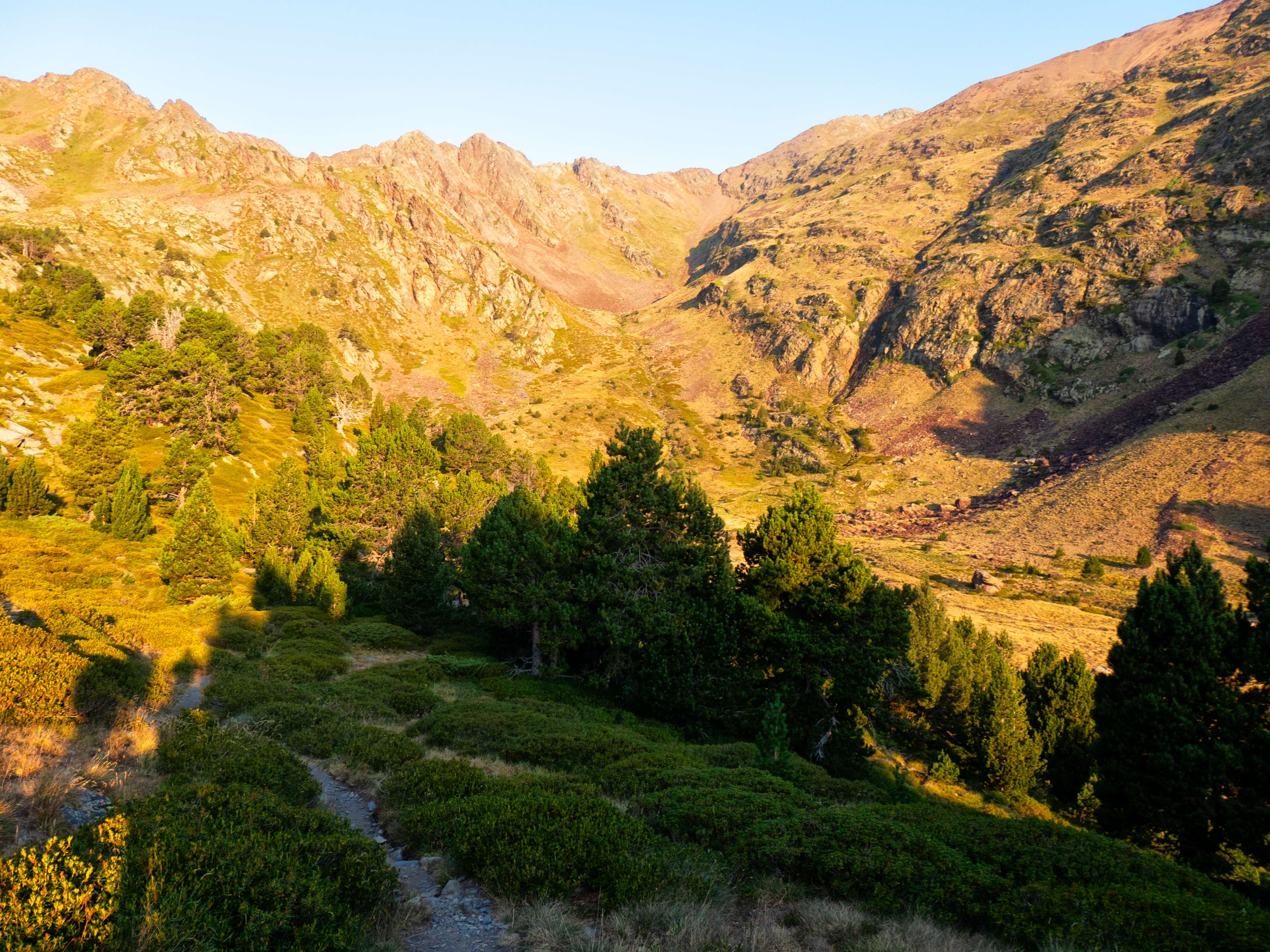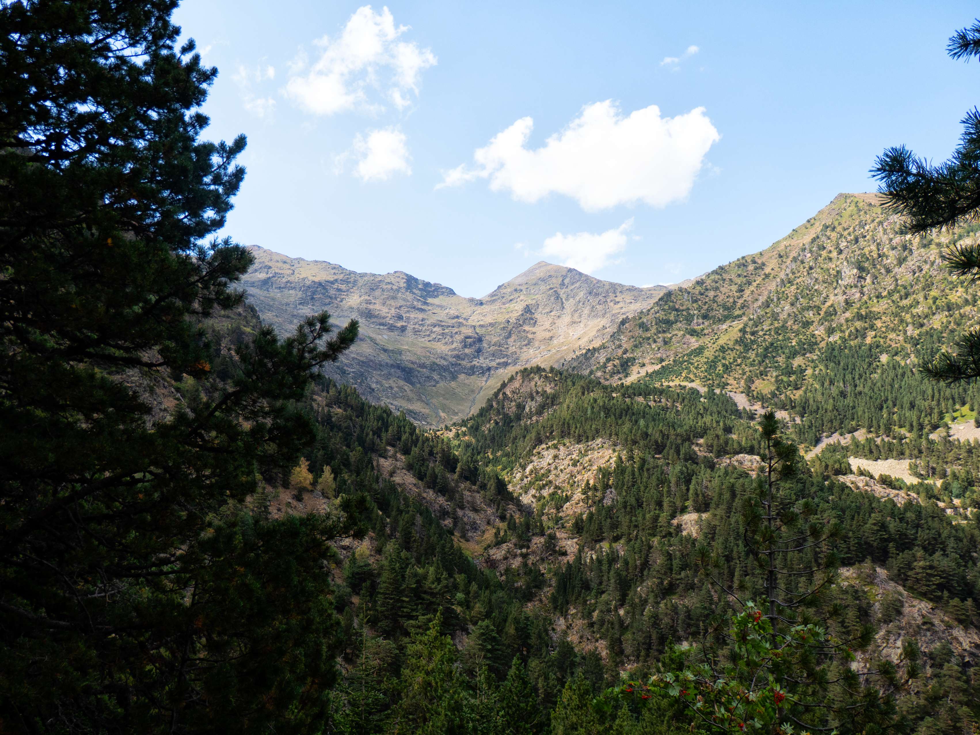 Aunque el bosque es bastante cerrado, ocasionalmente se abren claros que permiten ver la pared que cierra el Pla de l'Estany, el brazo derecho del valle de Arinsal, con el pico homónimo mostrando su elegante forma piramidal.