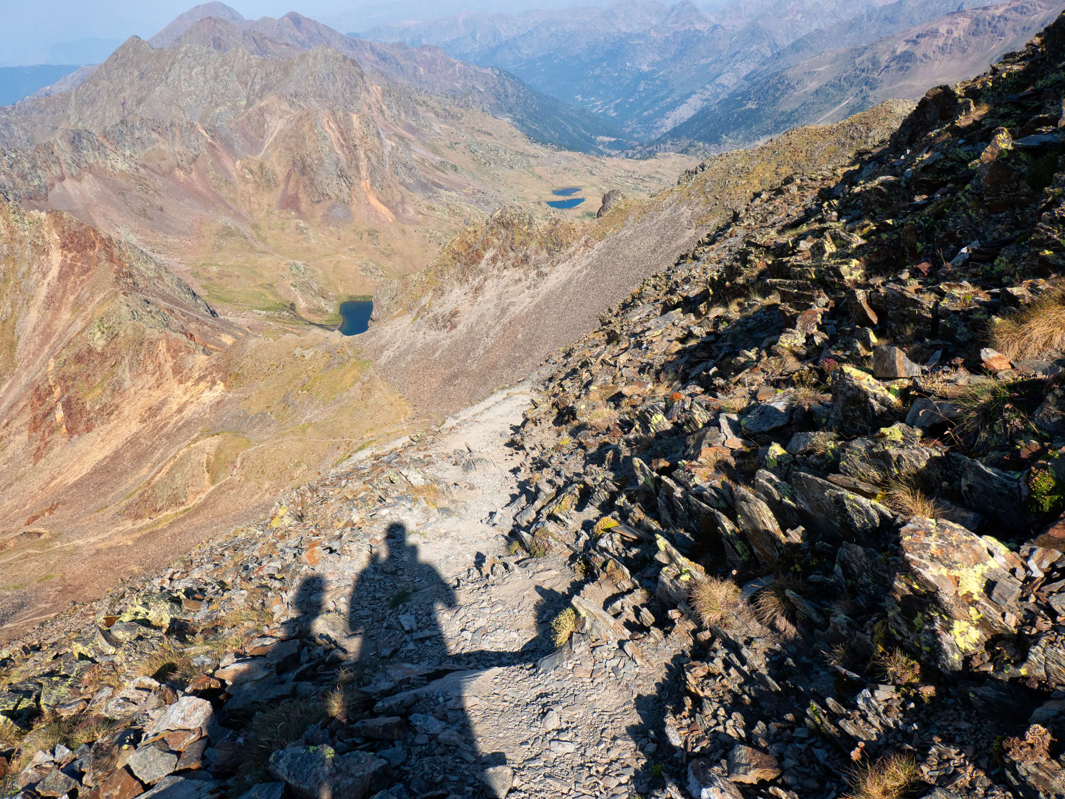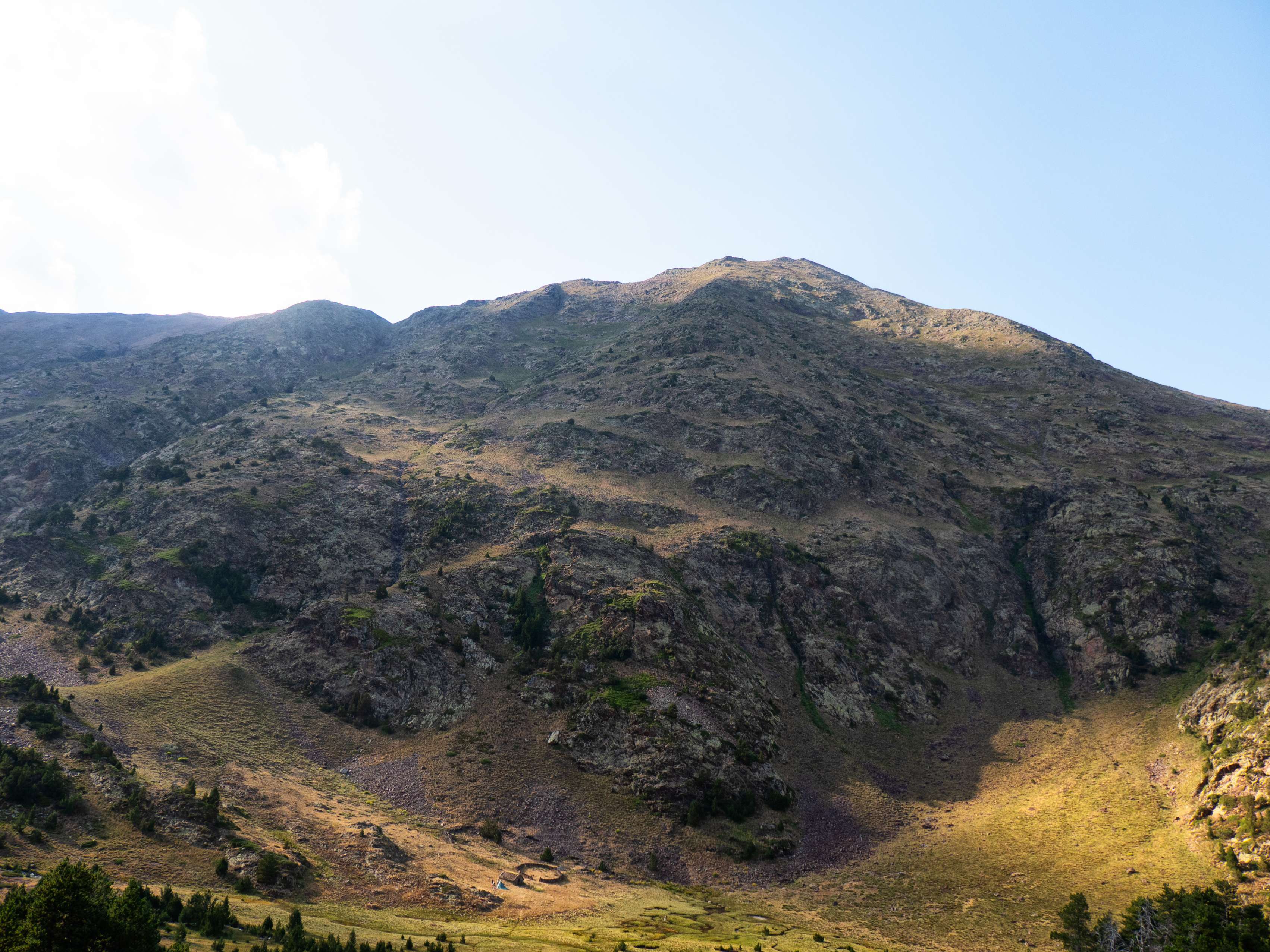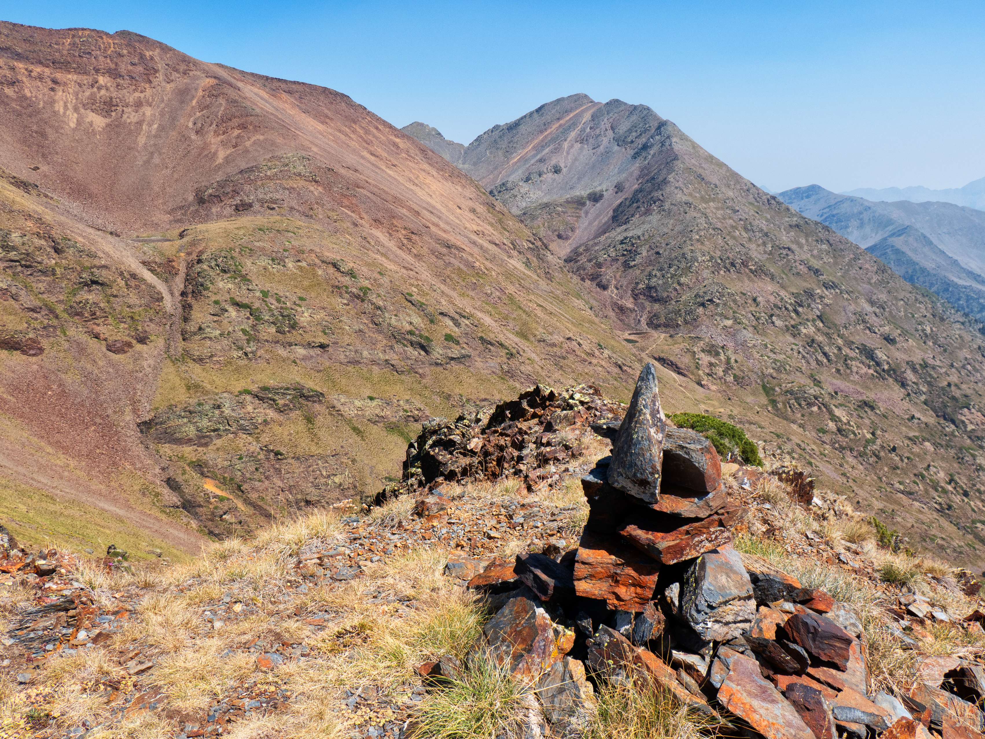 Tras superar una última punta, llegamos al collado previo a la cima, que alberga un vivac para los que quieran ser los más altos de Andorra durante toda una noche. A ambos lados del collado se descuelgan las tarteras de color ocre tan características de esta montaña, que la hacen inconfundible desde distancias lejanas.
