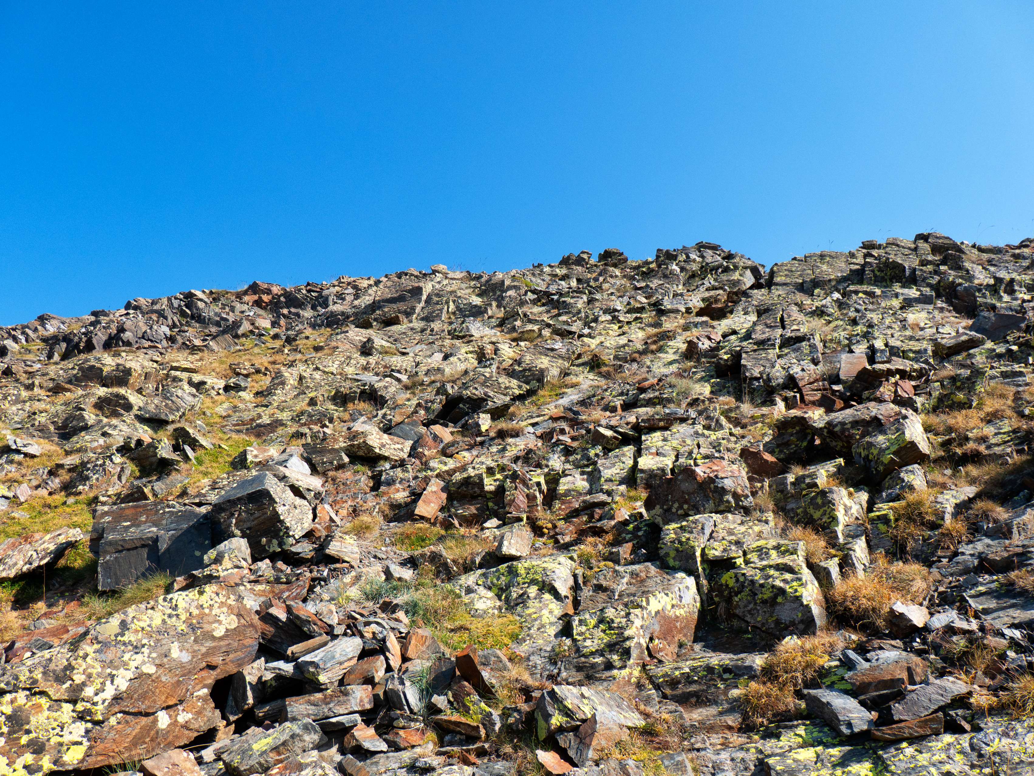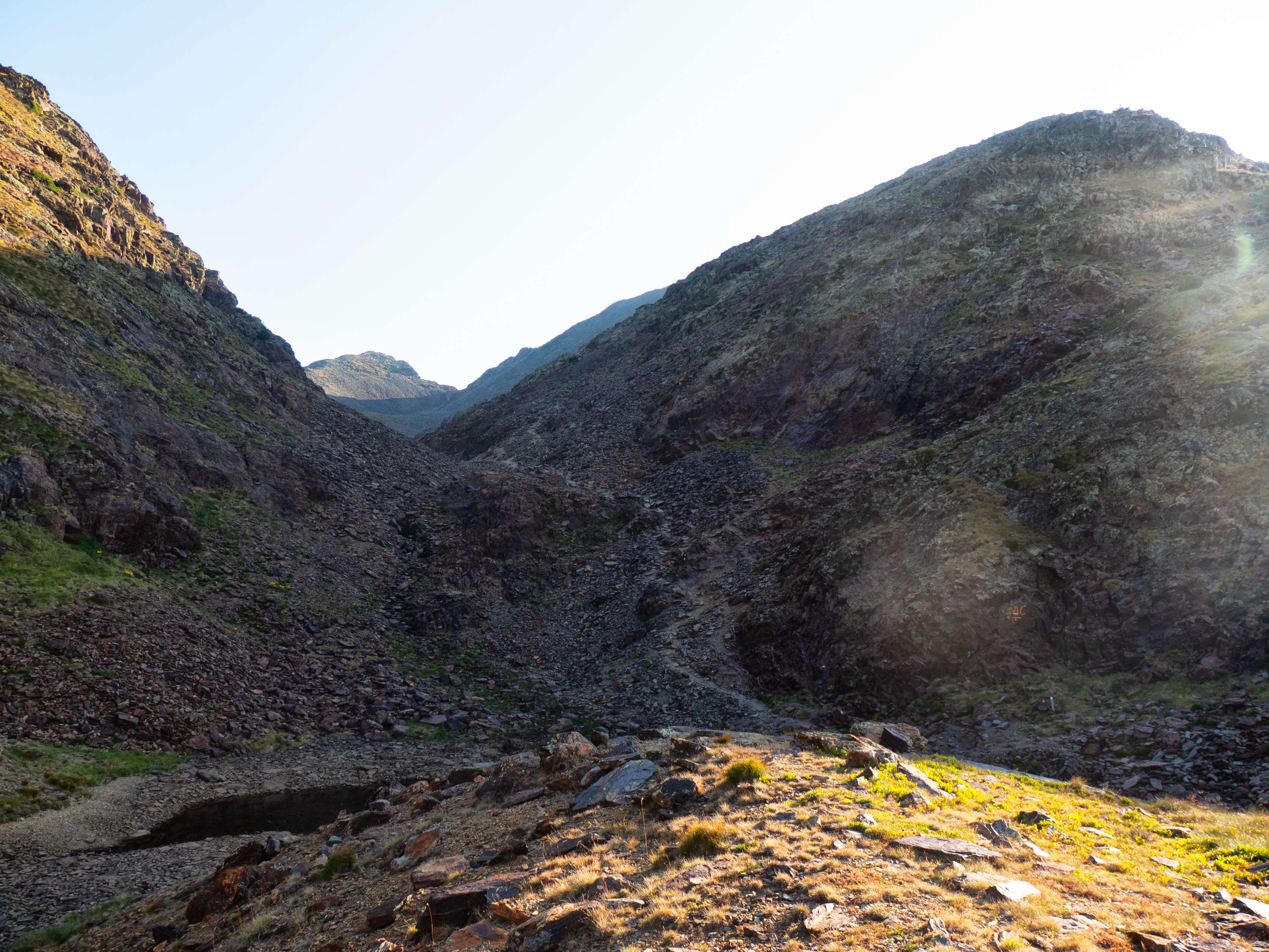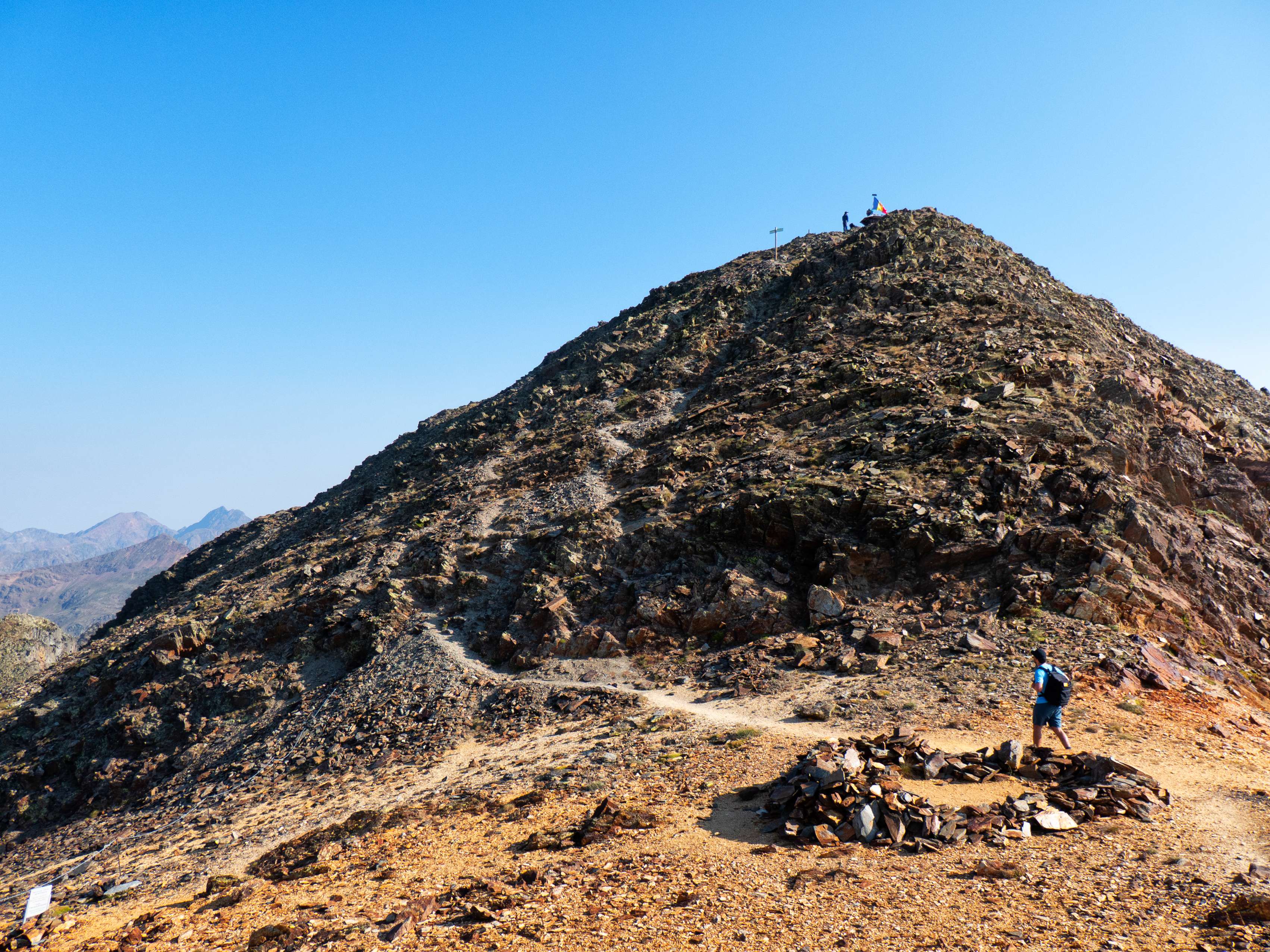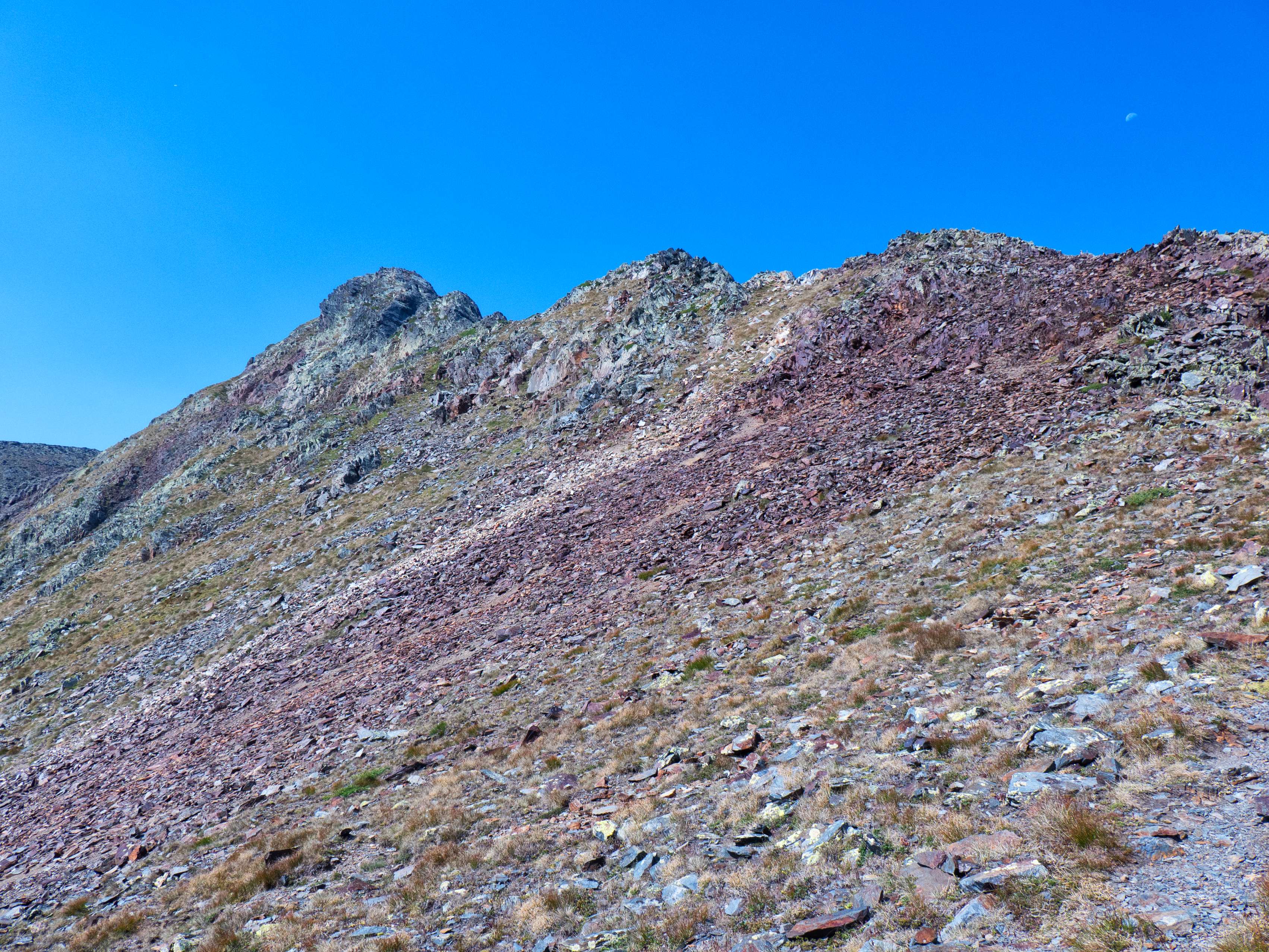 Tras superar una última punta, llegamos al collado previo a la cima, que alberga un vivac para los que quieran ser los más altos de Andorra durante toda una noche. A ambos lados del collado se descuelgan las tarteras de color ocre tan características de esta montaña, que la hacen inconfundible desde distancias lejanas.