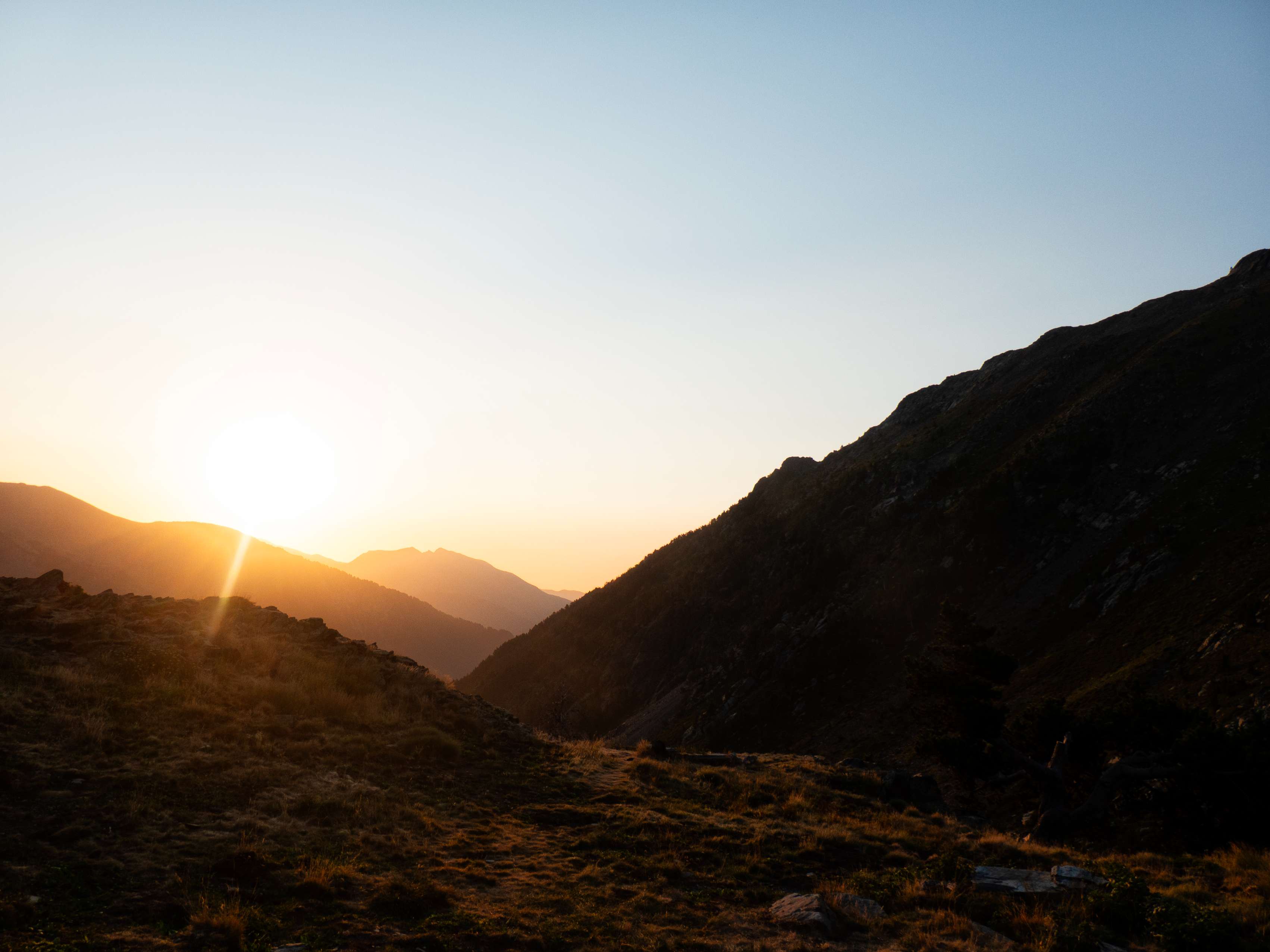 El Sol amanece por encima de las crestas del Casamanya, tiñendo el cielo de un tono anaranjado que anuncia un tórrido día. Conviene empezar bien temprano para ahorrarnos en lo posible la calor que sufriremos unas horas más tarde.