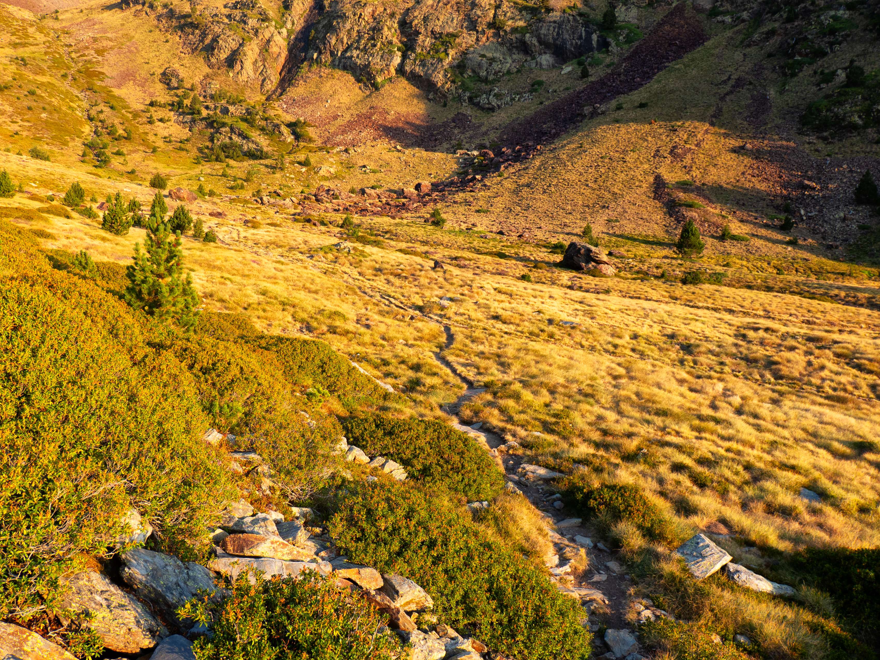 Finalmente, tras atravesar una ladera de boj, desembocamos en la bucólica pradera, de intenso color dorado debido a las luces del amanecer, donde retomamos el buen sendero que dejamos ayer al desviarnos hacia el refugio.