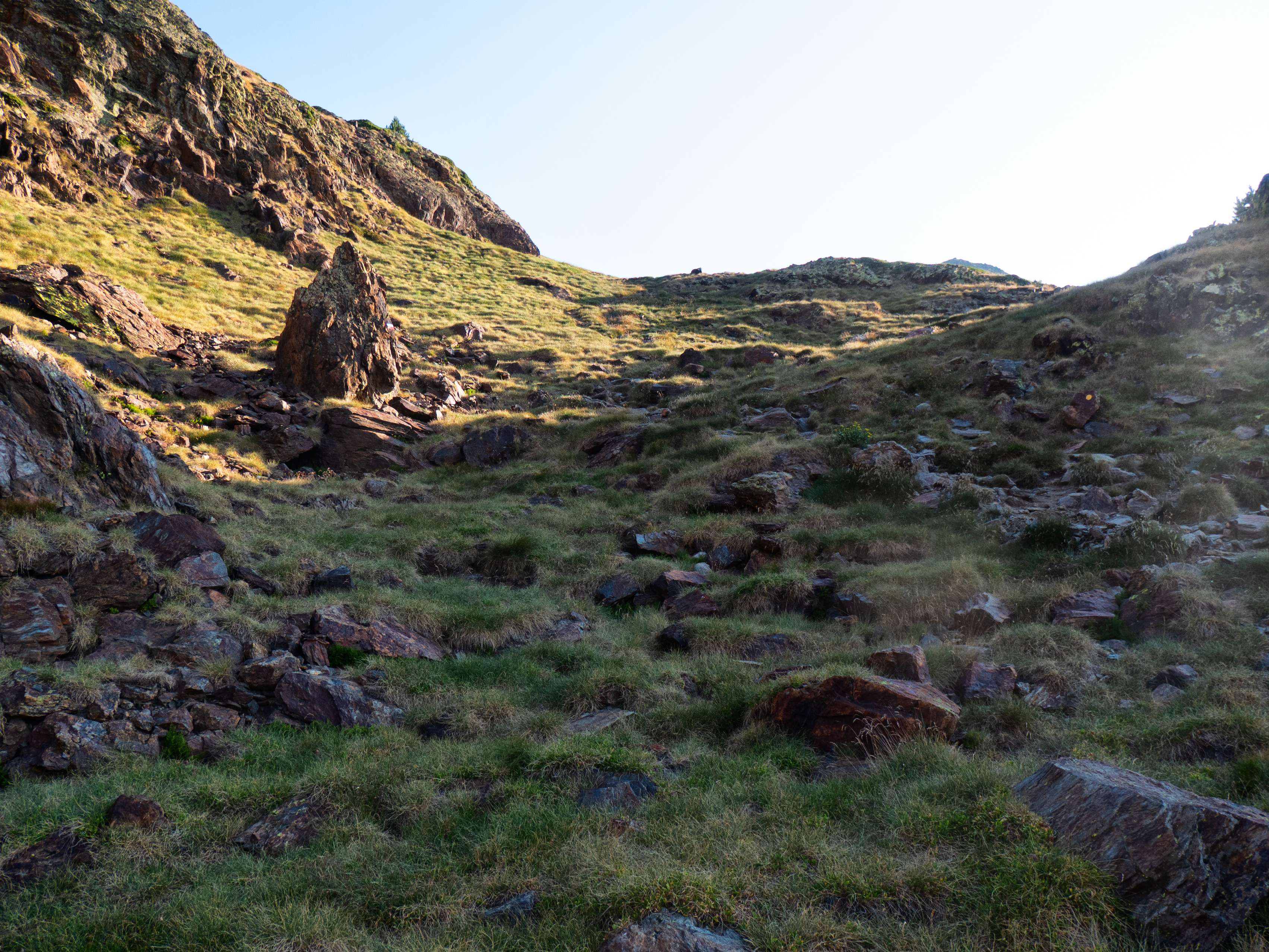 El sendero de bajada, bastante pedregoso, sortea varios resaltes para ir a buscar una canal que nos permite alcanzar...