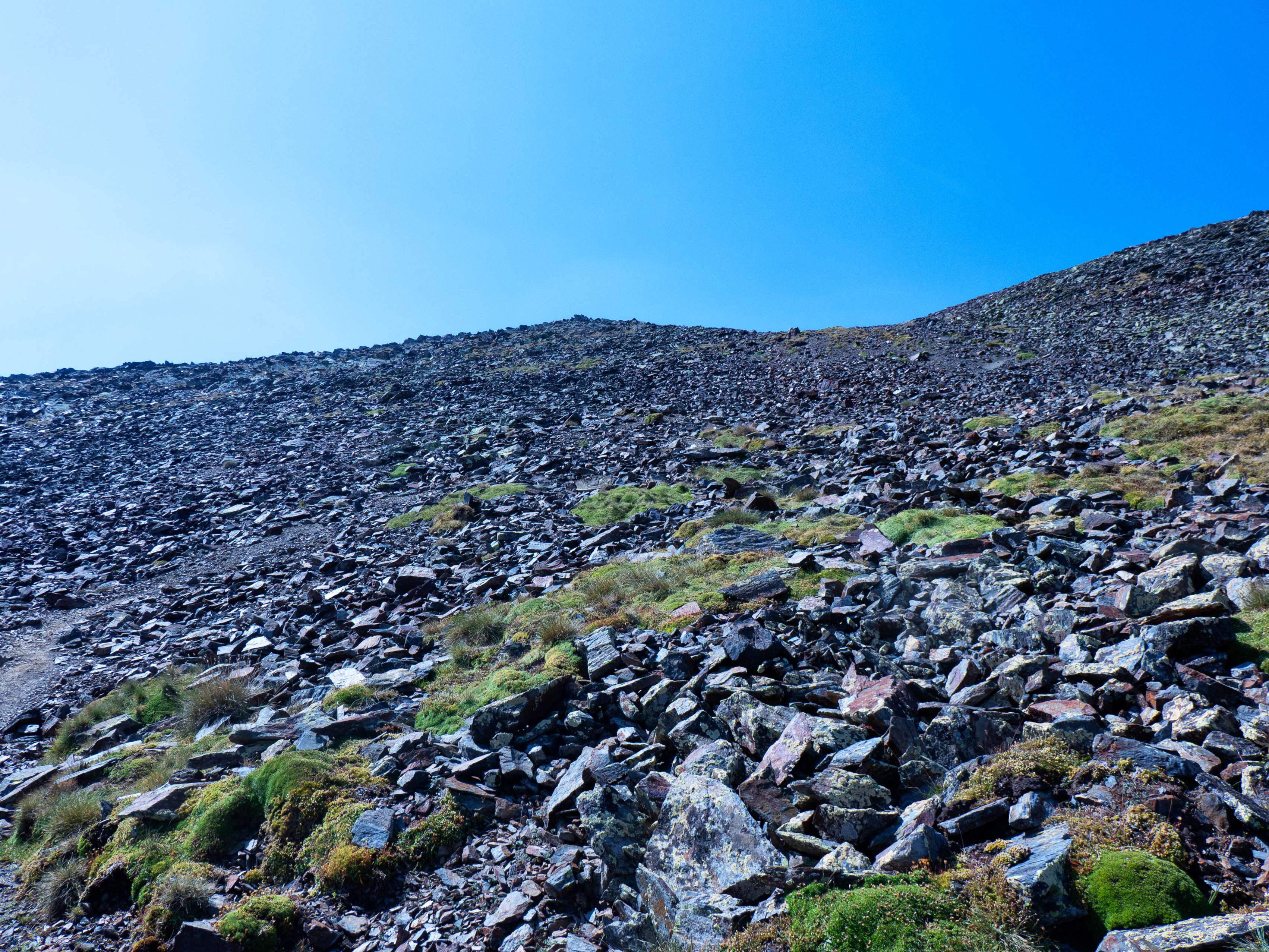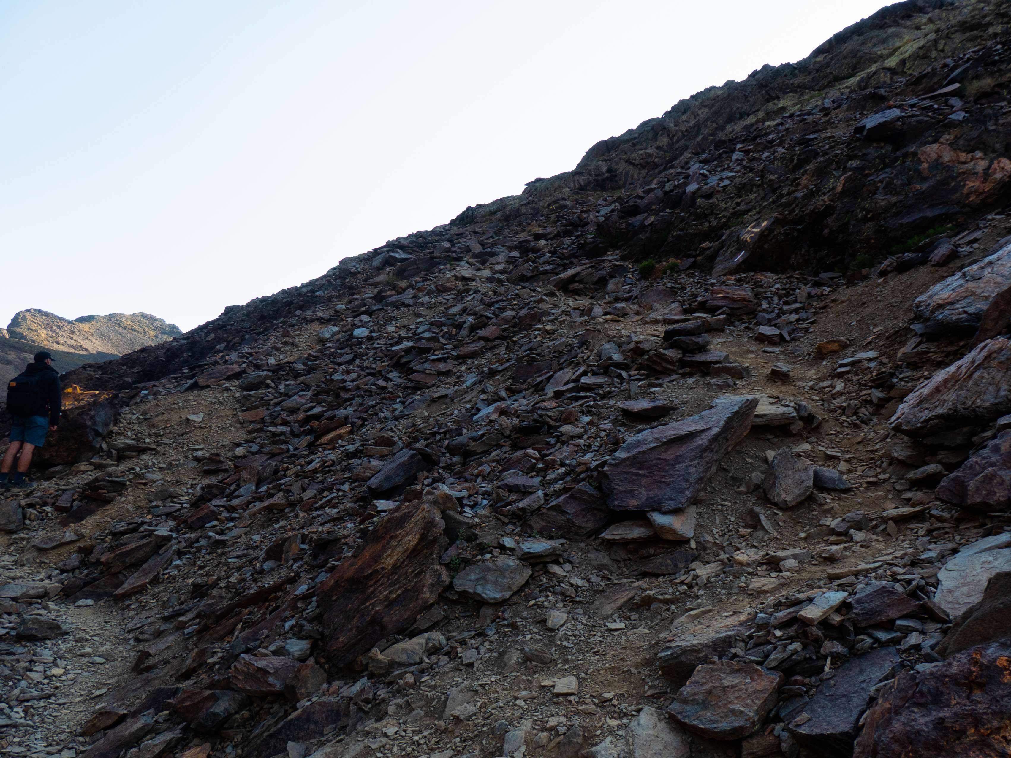 La subida es inestable pero está bien trazada, con el objetivo puesto en una brecha que se abre en la cresta, el mismo que distinguíamos desde el refugio.