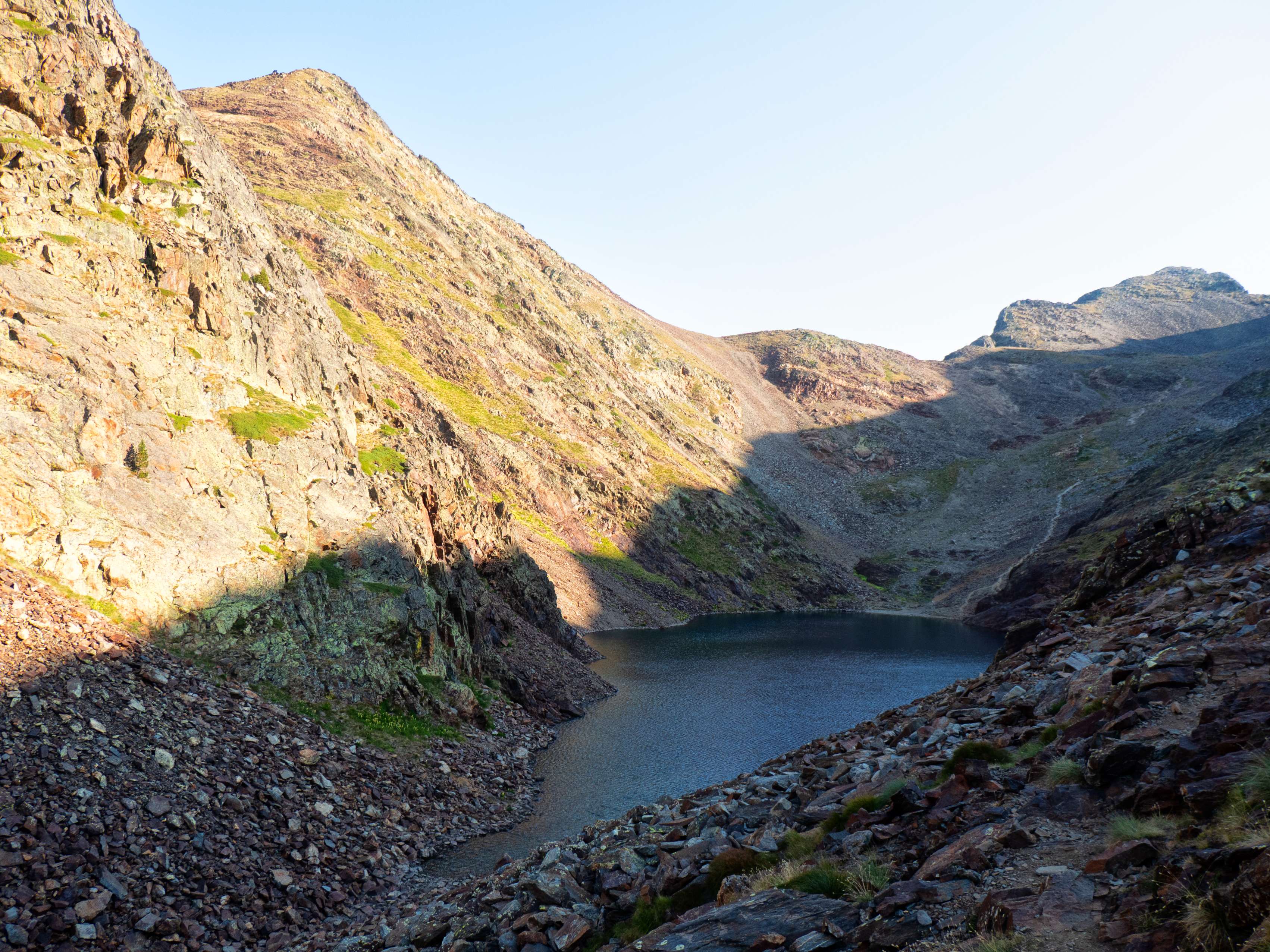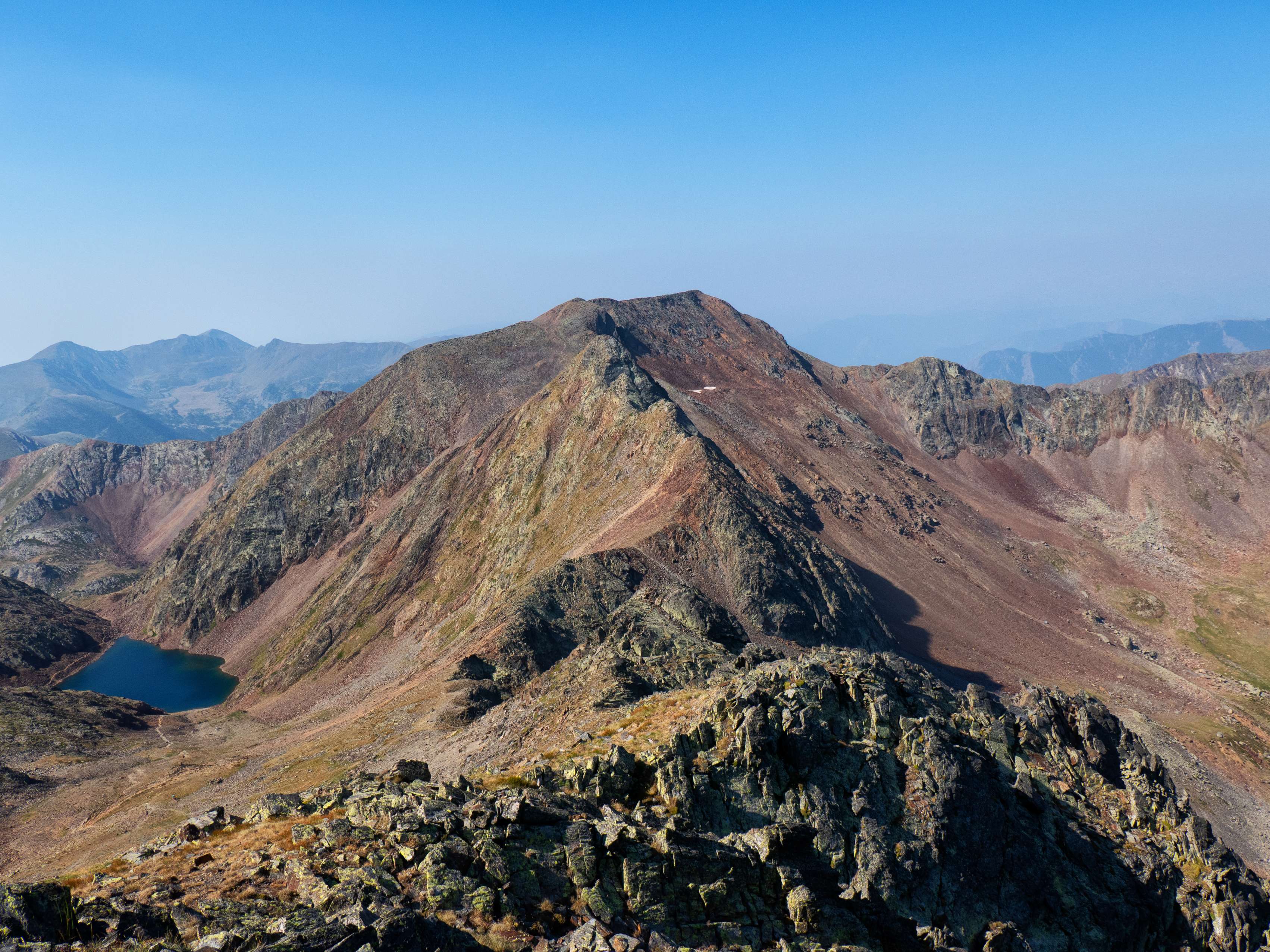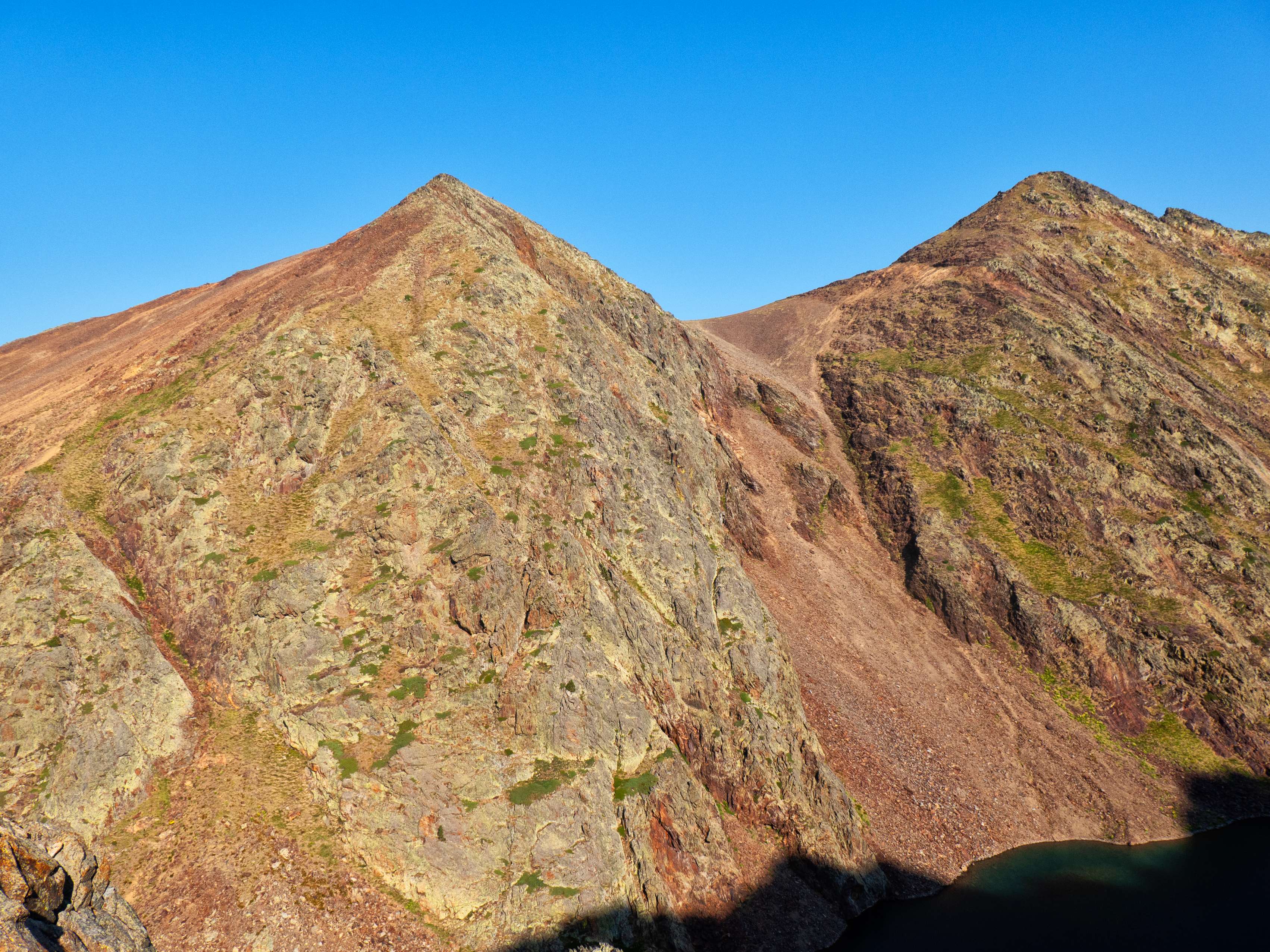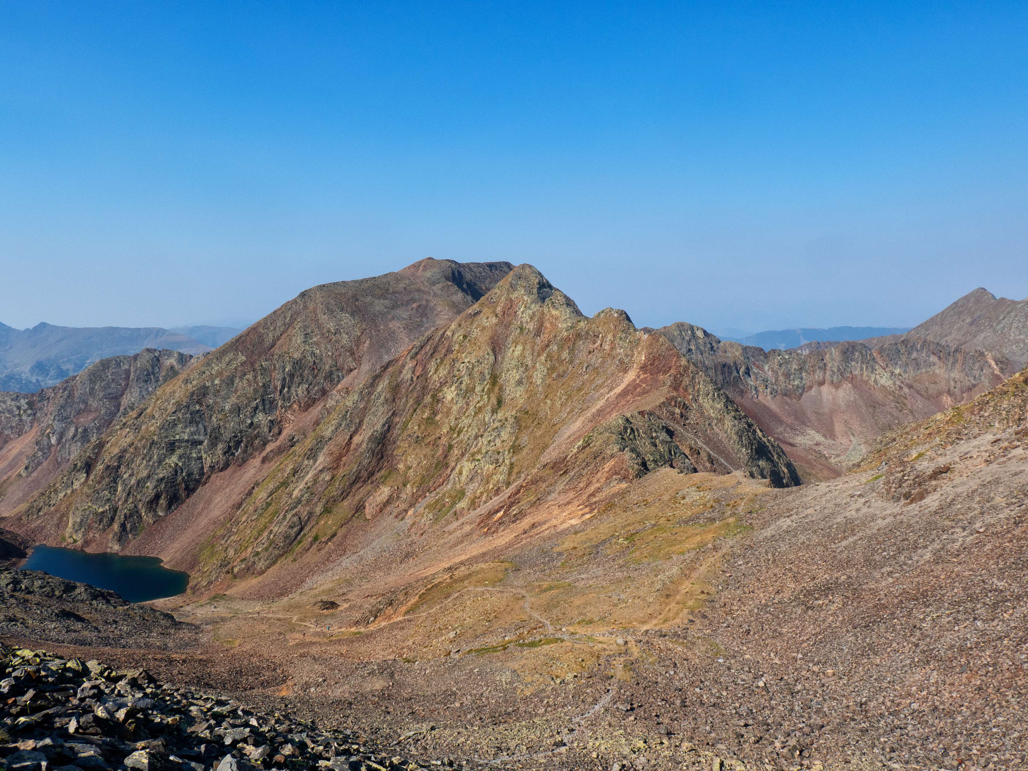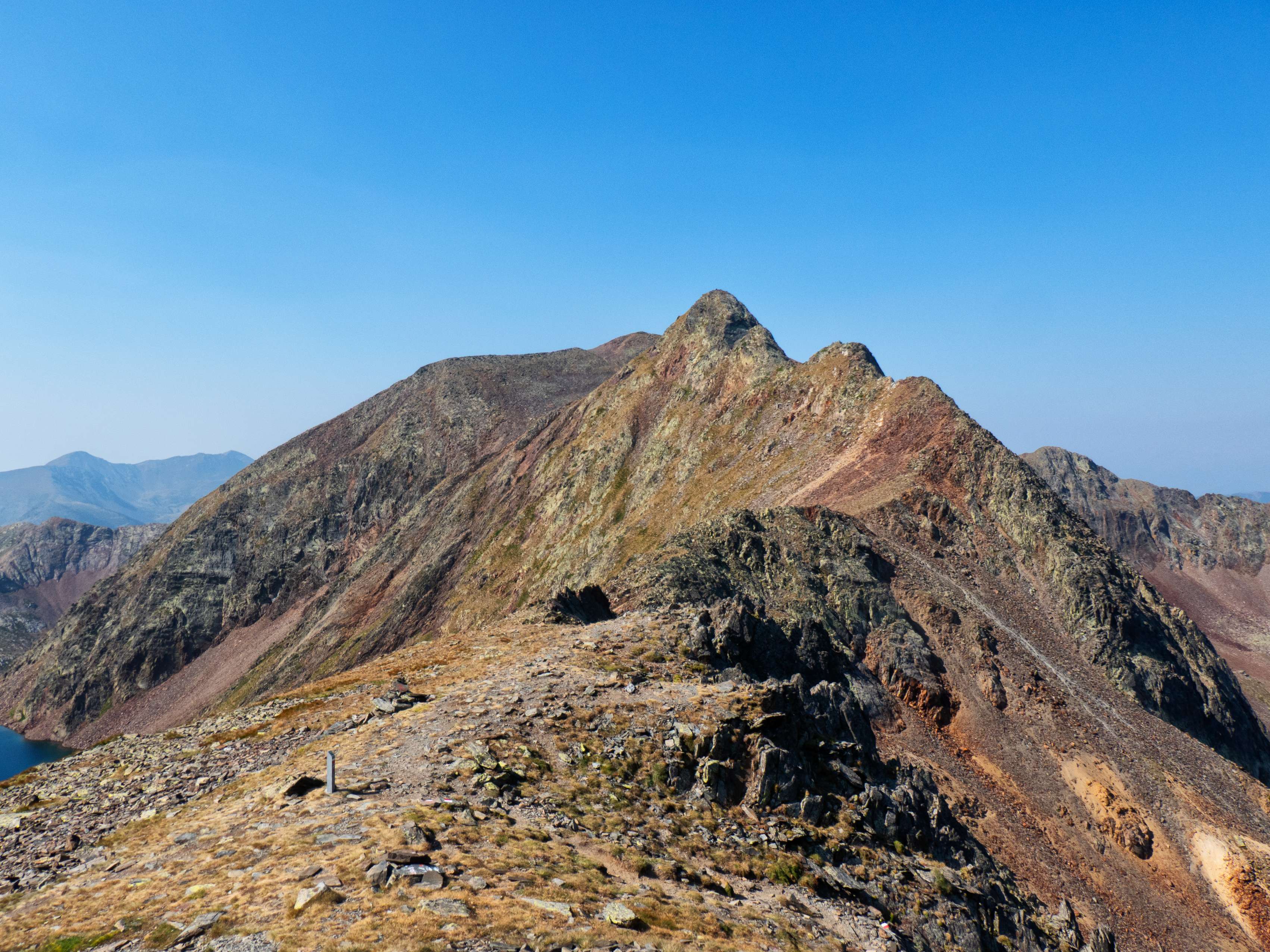 Curiosamente, la montaña más elevada de todas las de este salvaje enclave del Pirineo se encuentra fuera de la línea fronteriza. El Comapedrosa nos muestra aquí su desolada cara oeste, con su característica raja rojiza presente también en la vertiente opuesta de la montaña.