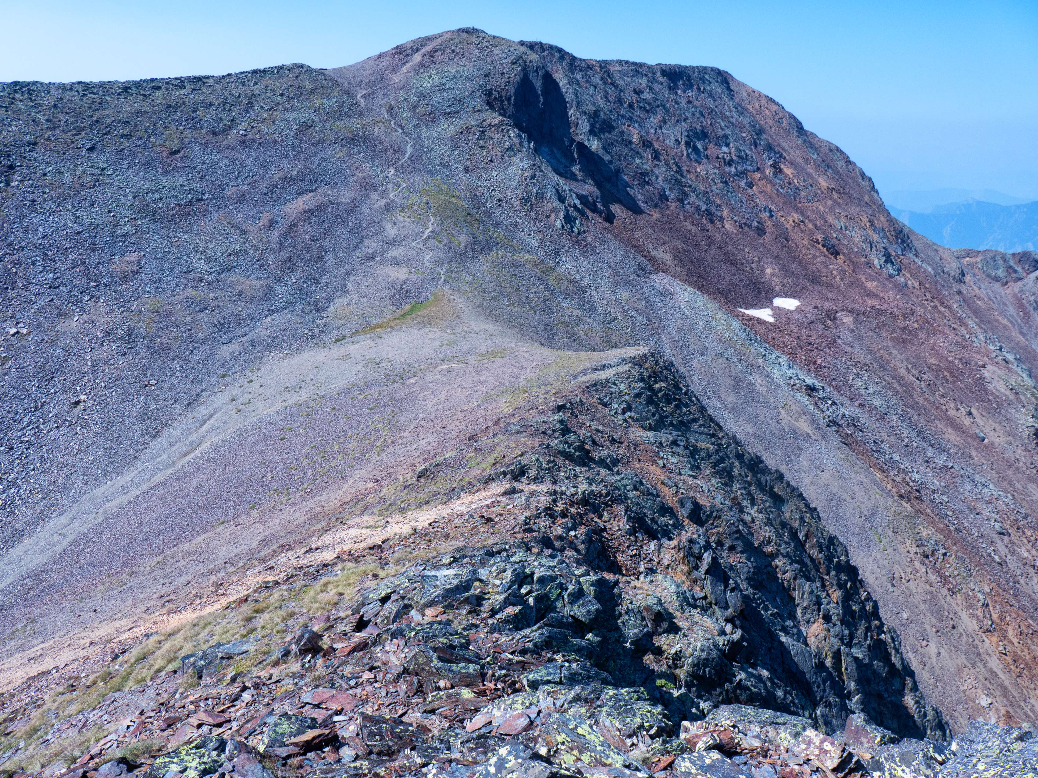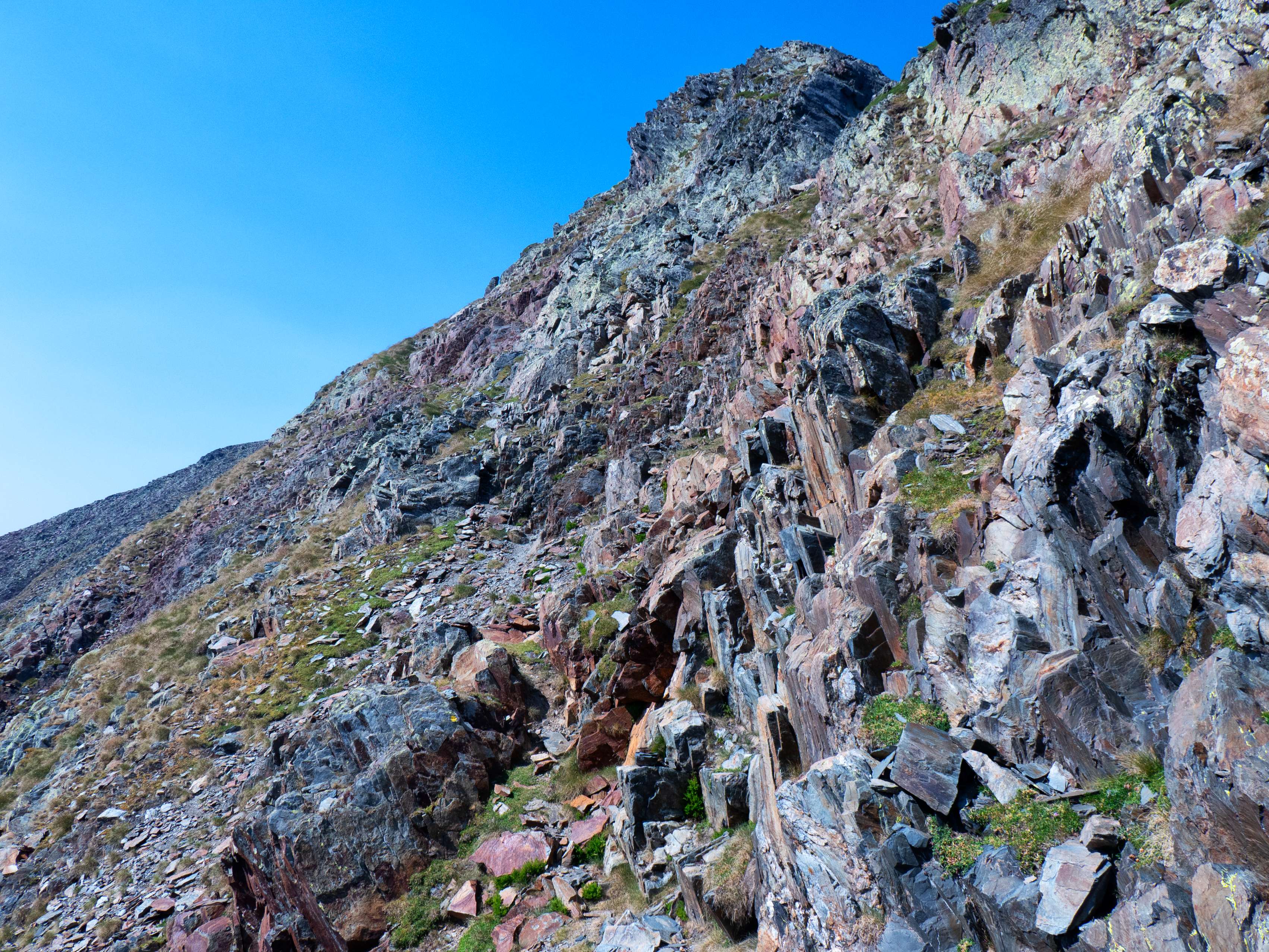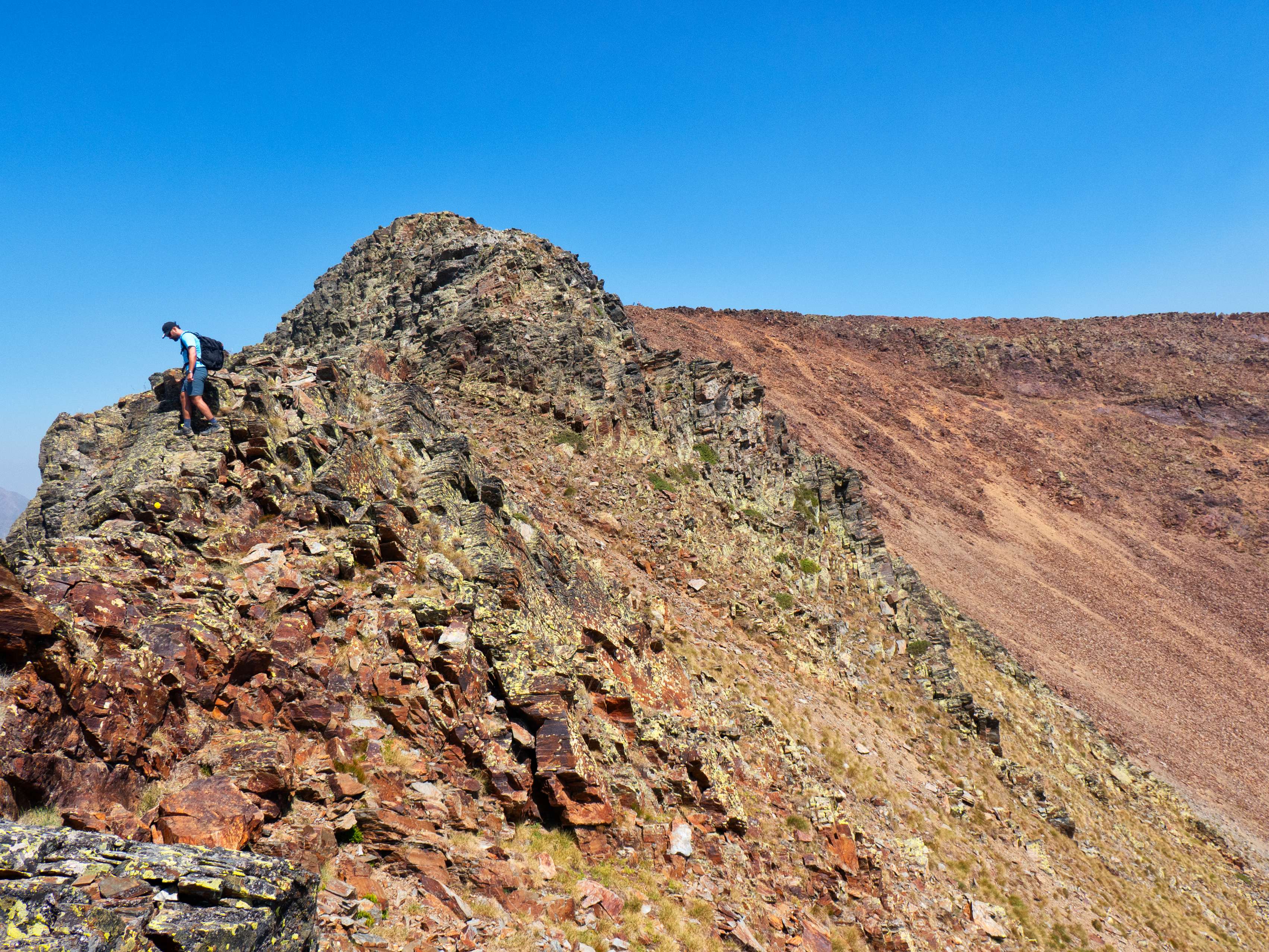 Al igual que la cima, esta arista engaña a la vista, puesto que resulta más exigente de lo que aparenta desde lejos. El primer tramo de cresta es especialmente accidentado, obligándonos a destrepar repetidamente por afilada roca metamórfica a causa de los numerosos resaltes que jalonan la arista.