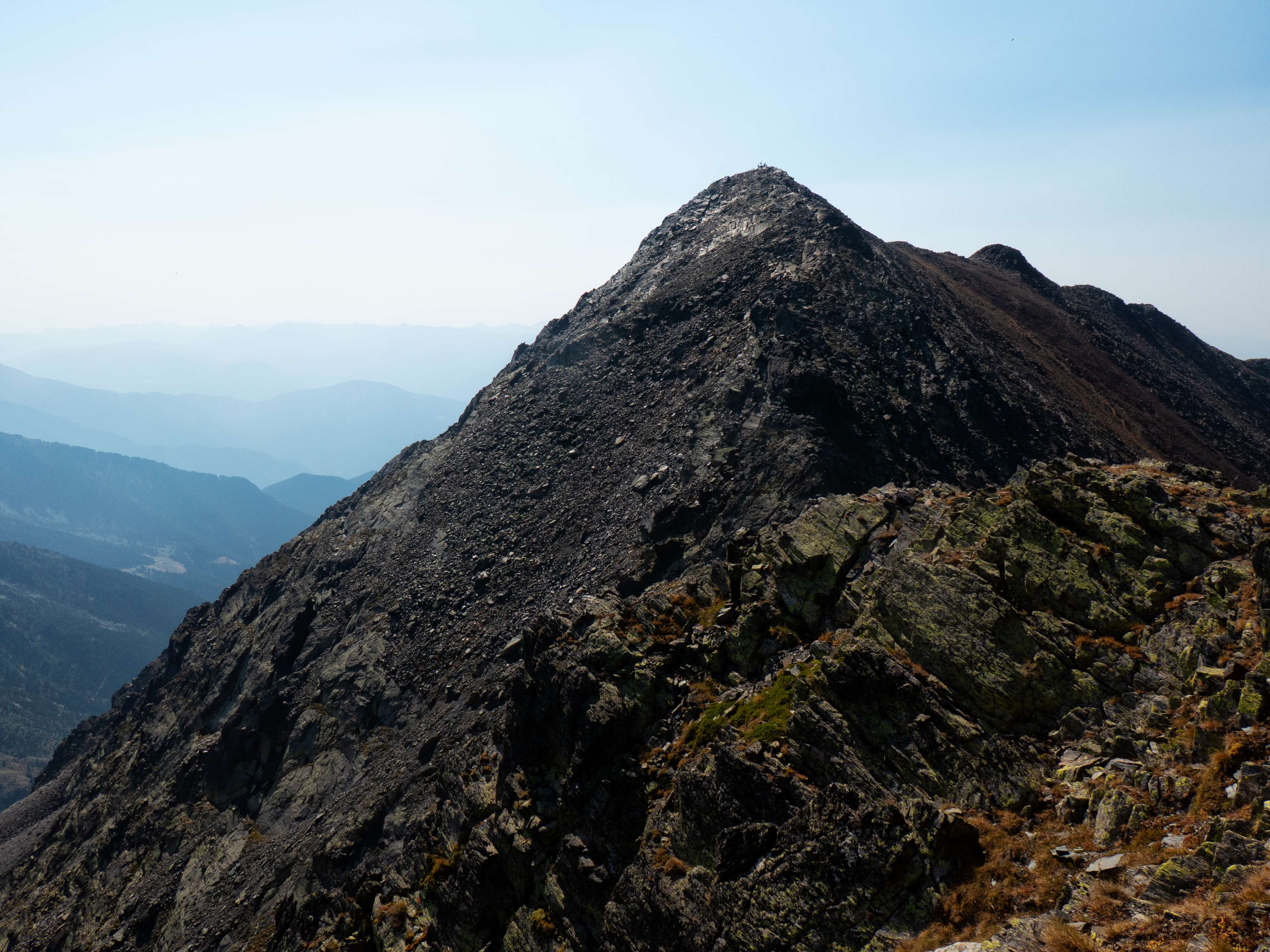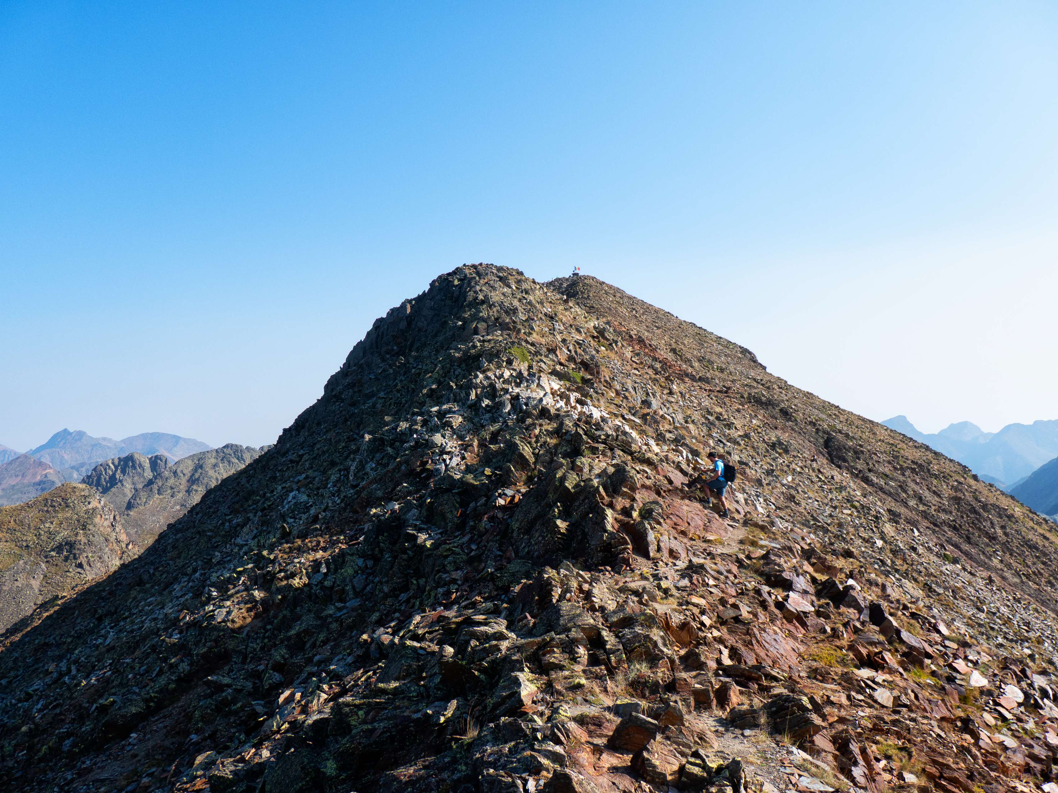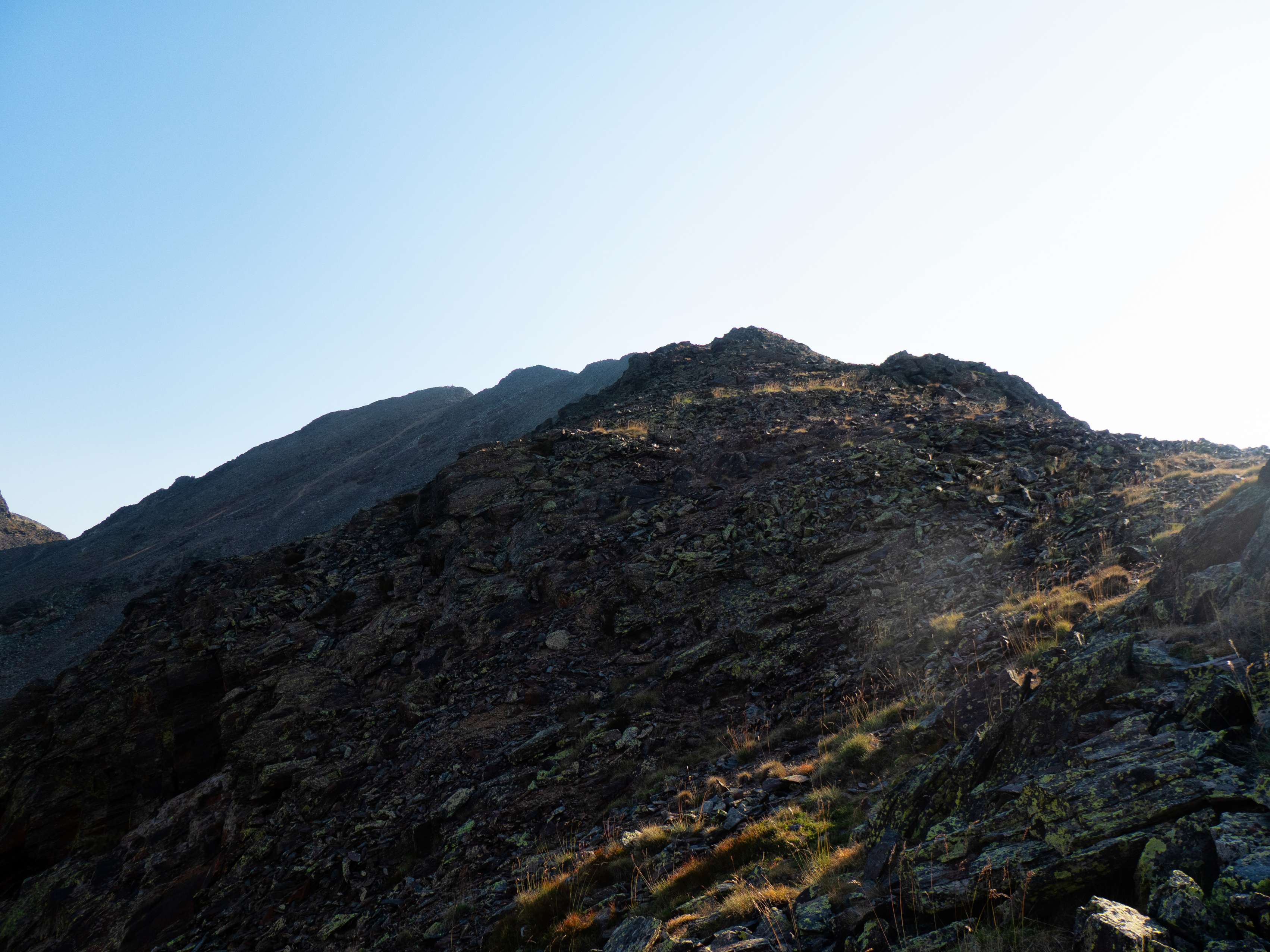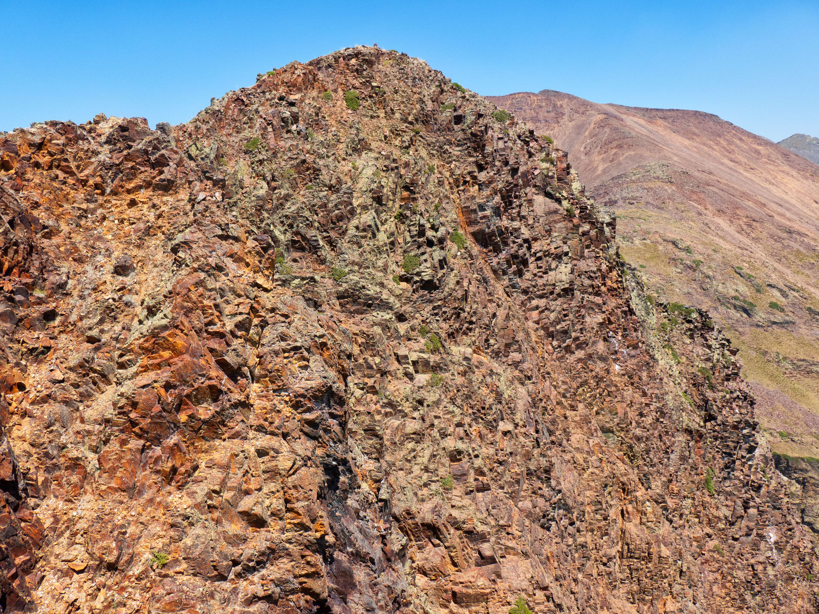 Al igual que la cima, esta arista engaña a la vista, puesto que resulta más exigente de lo que aparenta desde lejos. El primer tramo de cresta es especialmente accidentado, obligándonos a destrepar repetidamente por afilada roca metamórfica a causa de los numerosos resaltes que jalonan la arista.