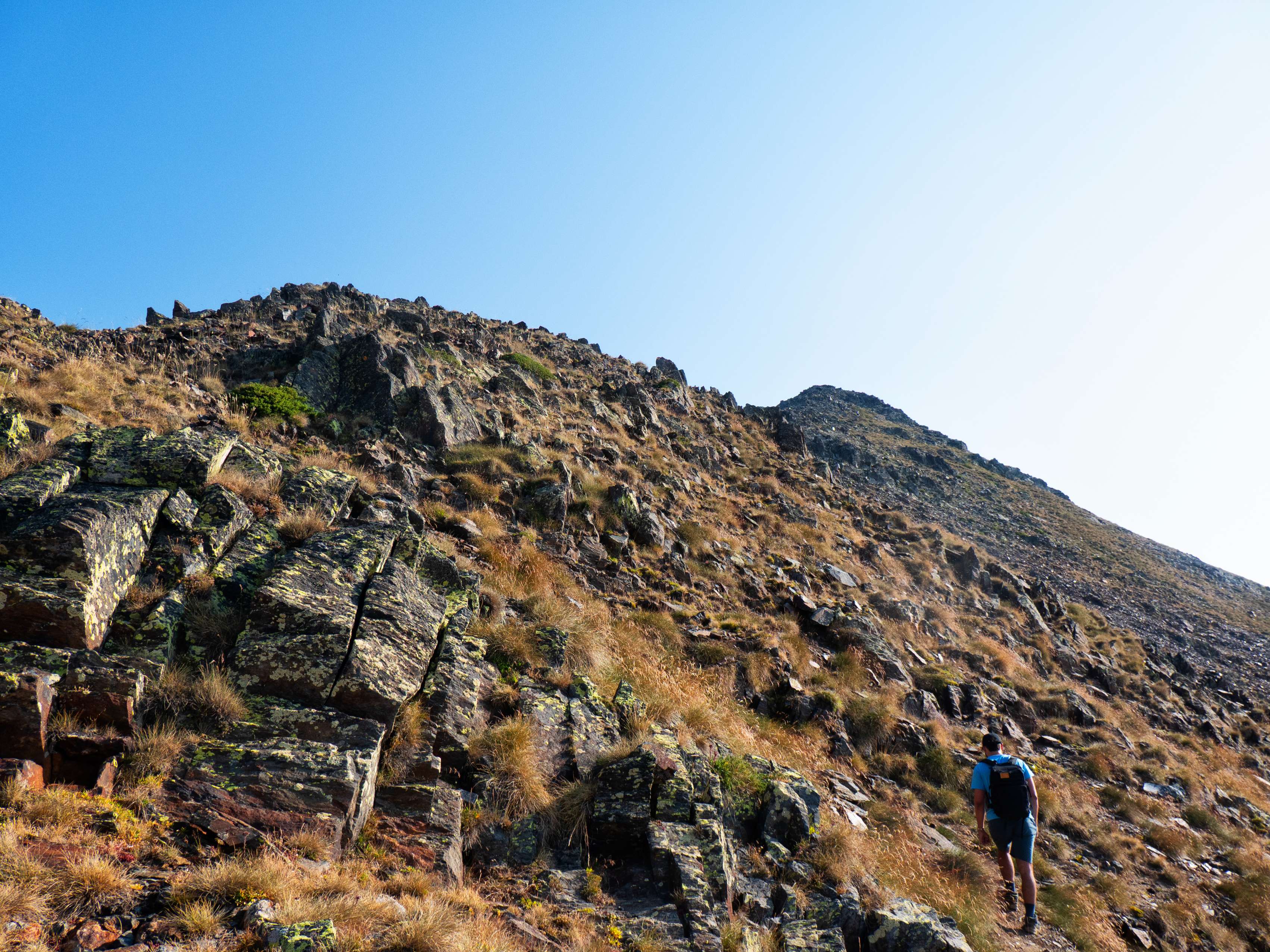 Tras el primer lago, el sendero entra ya en terreno pedregoso y descompuesto, típico de la naturaleza metamórfica de estos macizos del Alt Pirineu. Alcanzamos una pequeña horcada y aquí el sendero se bifurca. El trazado que sigue recto bordea el Estany Negre para dirigirse a la Portella de Baiau. A la derecha, el sendero que seguimos nosotros asciende con decisión para ganar la cresta meridional del Comapedrosa.