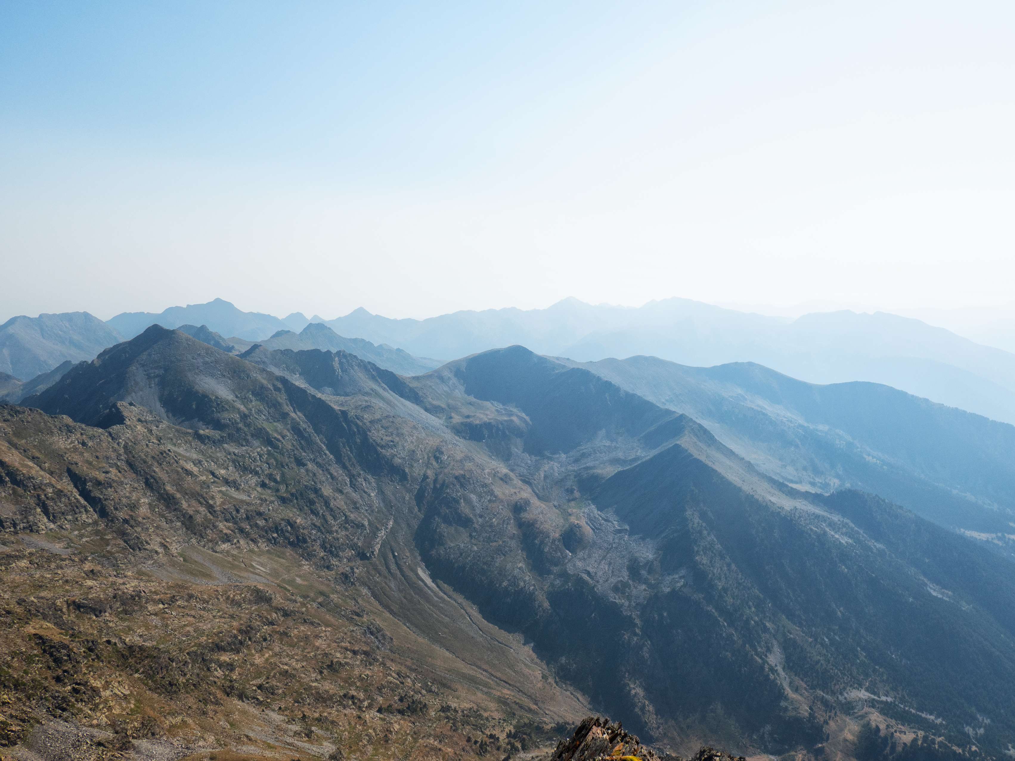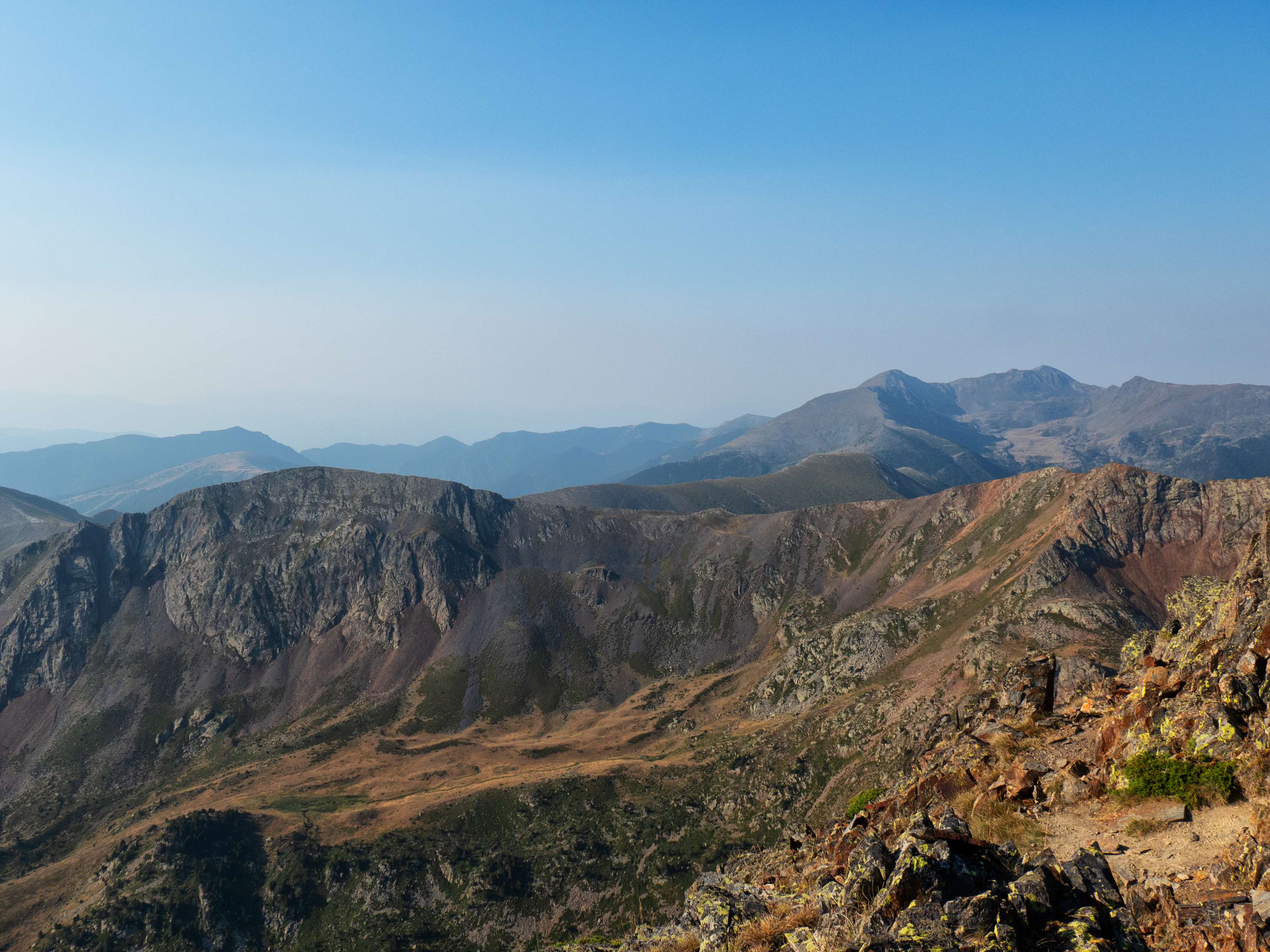 Continuando el giro, aparecen las montañas que delimitan el valle por el este, destacando el Pic del Pla de l'Estany. Más allá, bajo el difuso manto de la calima, se adivinan las cumbres septentrionales andorranas, entre las que distinguimos las siluetas del Pic de la Font Blanca, el Pic de la Serrera y el Pic de l'Estanyó, tres de las grandes cimas de este país.