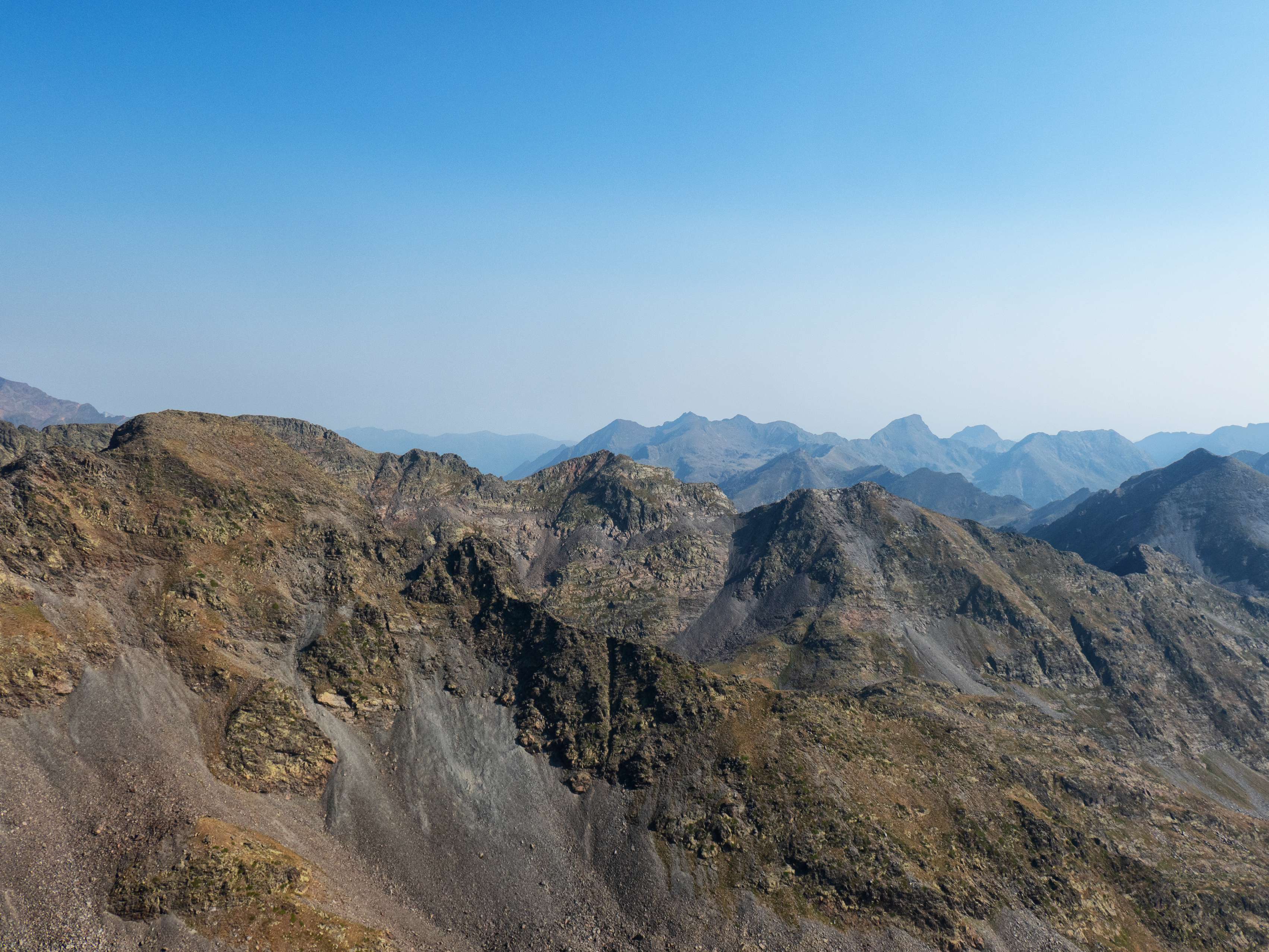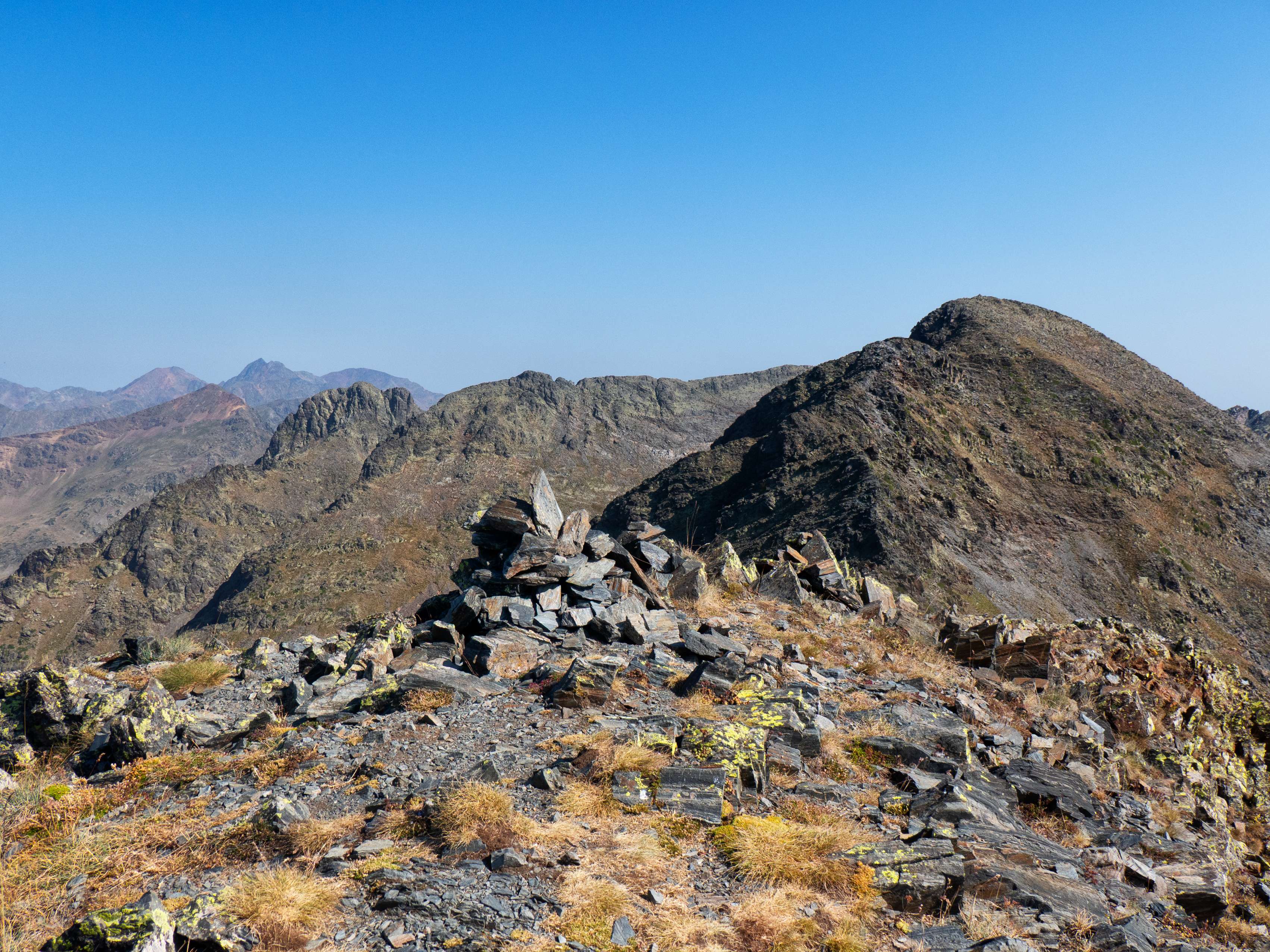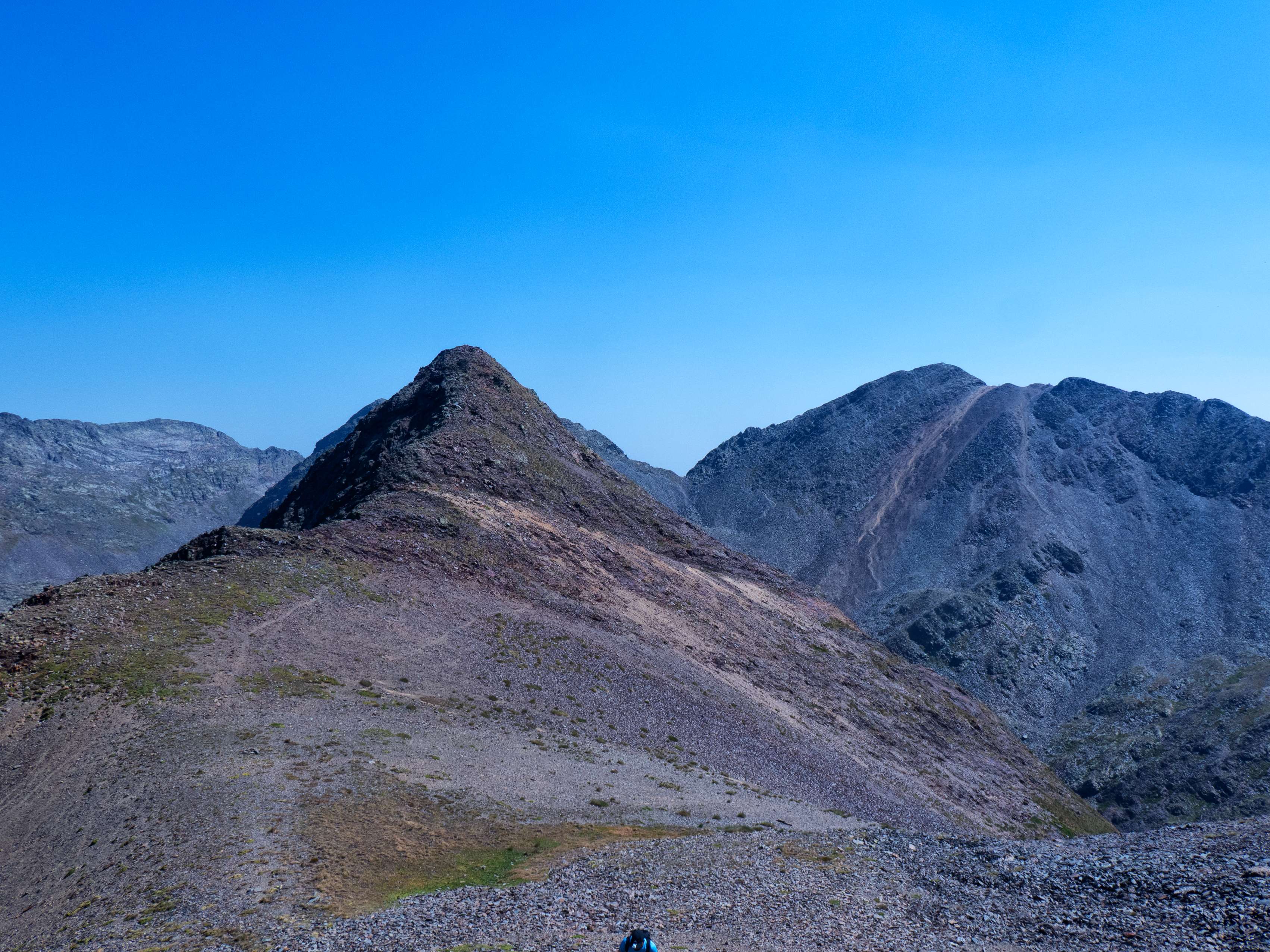 Finalmente, girando la vista hacia Catalunya, aparece el rey del Alt Pirineu, la Pica d'Estats, escoltada por su corte de tresmiles; es el último lugar de la cordillera donde se llega a estas alturas. Pero ahora debemos centrar nuestra atención en la montaña más cercana: el Pic de Baiau es nuestro siguiente objetivo.