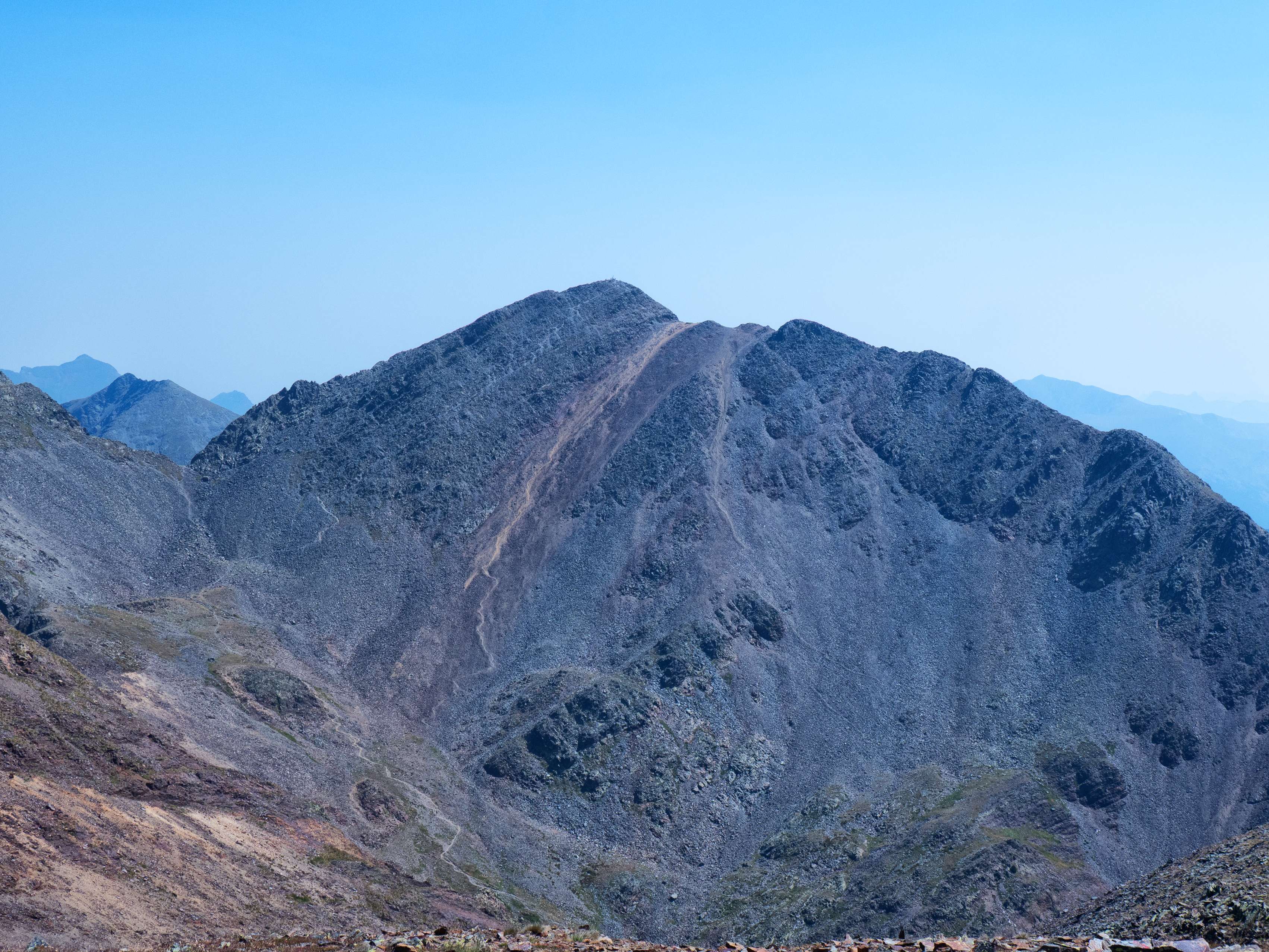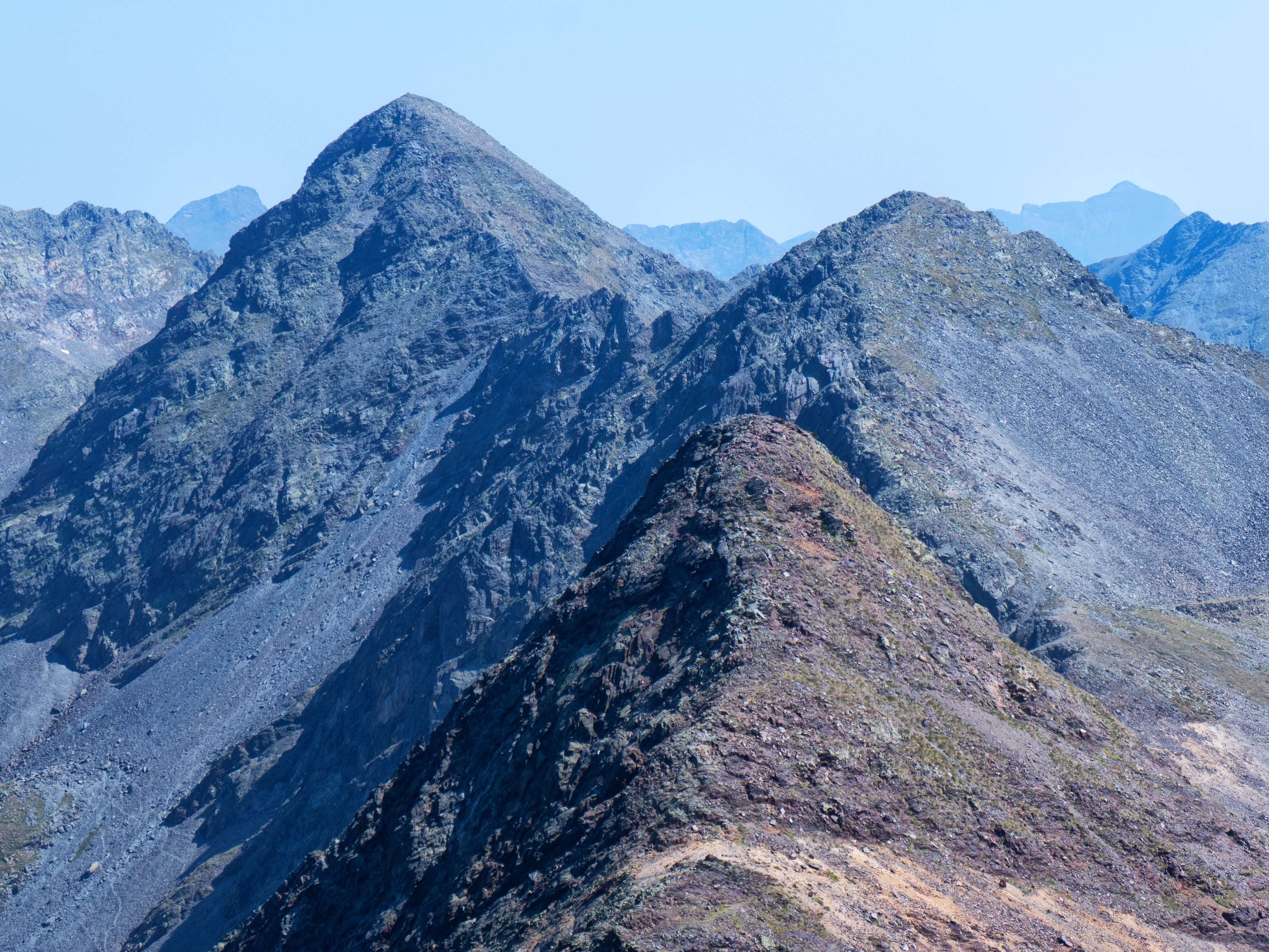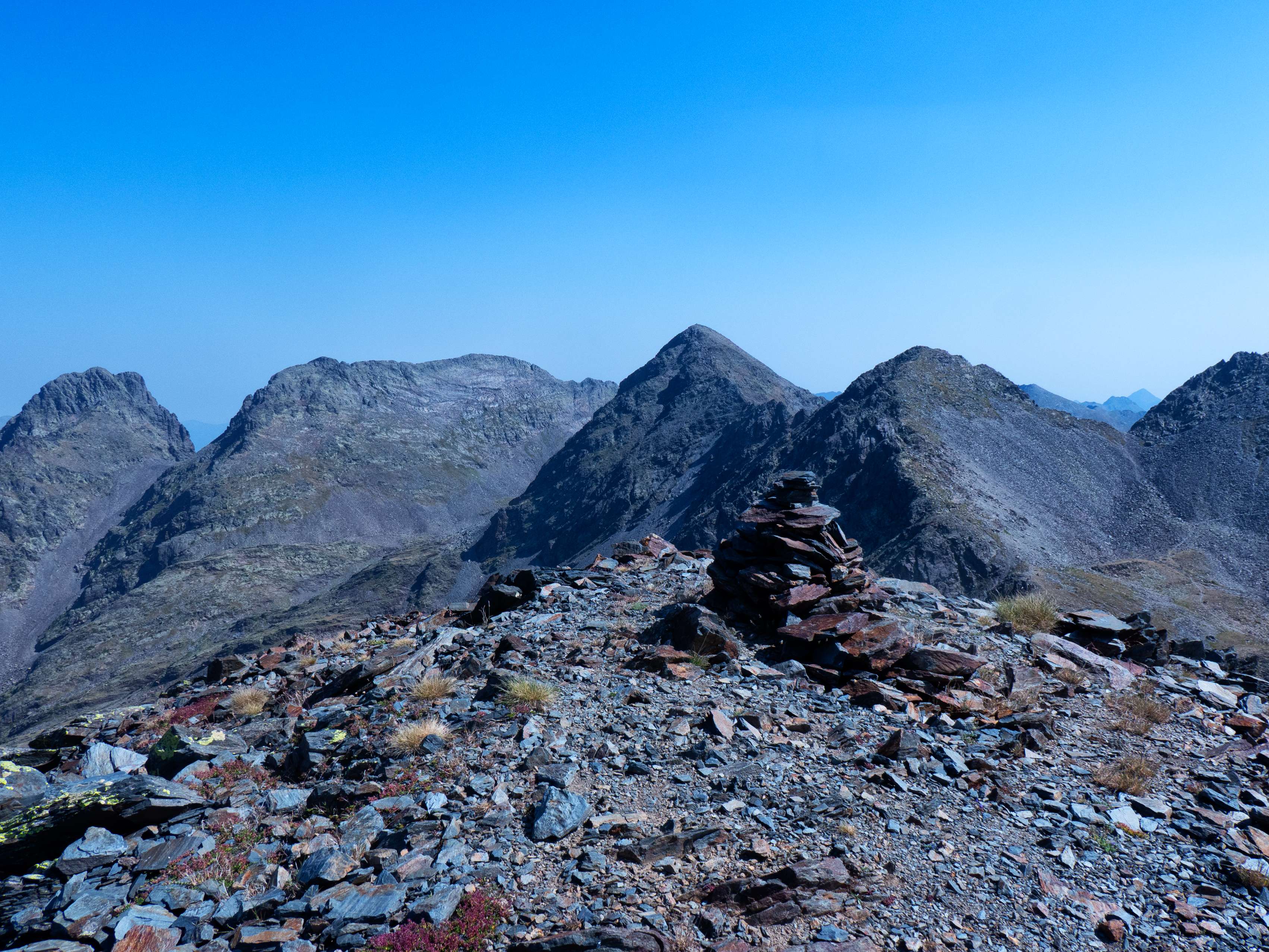 Finalmente, girando la vista hacia Catalunya, aparece el rey del Alt Pirineu, la Pica d'Estats, escoltada por su corte de tresmiles; es el último lugar de la cordillera donde se llega a estas alturas. Pero ahora debemos centrar nuestra atención en la montaña más cercana: el Pic de Baiau es nuestro siguiente objetivo.