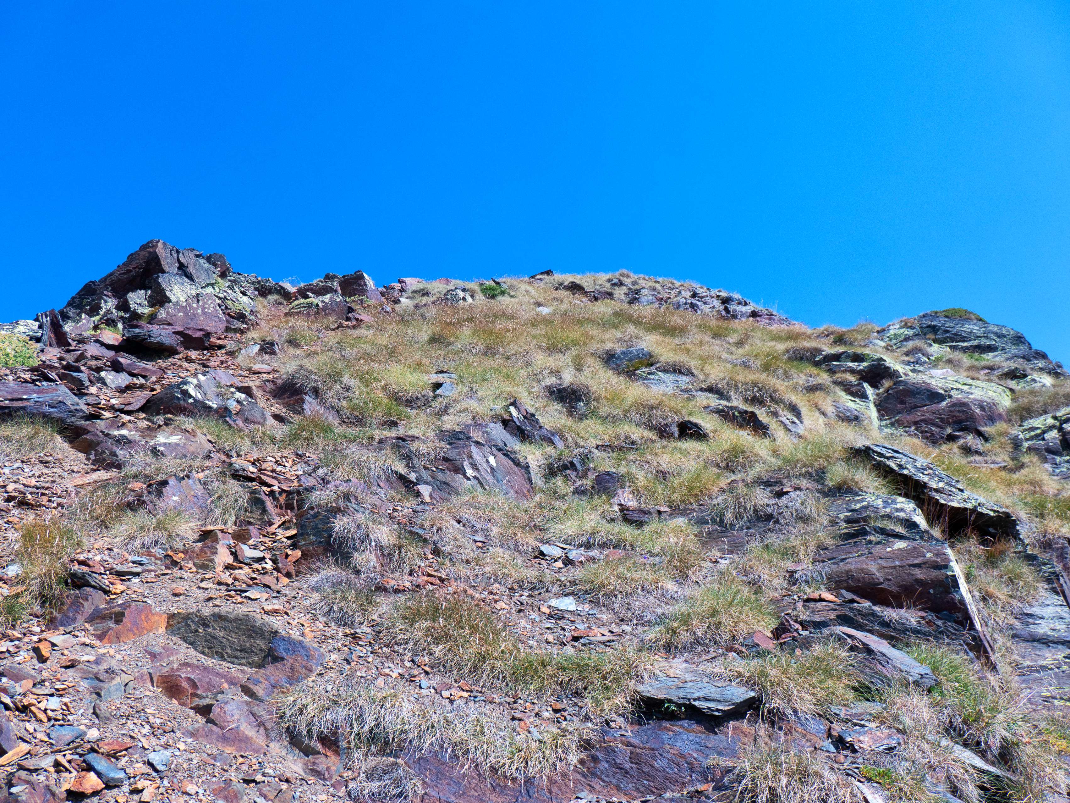 Desde allí, remontamos una corta pero descompuesta ladera que el sendero salva como puede, ya que a cada paso el terreno se desmorona bajo nuestros pies.