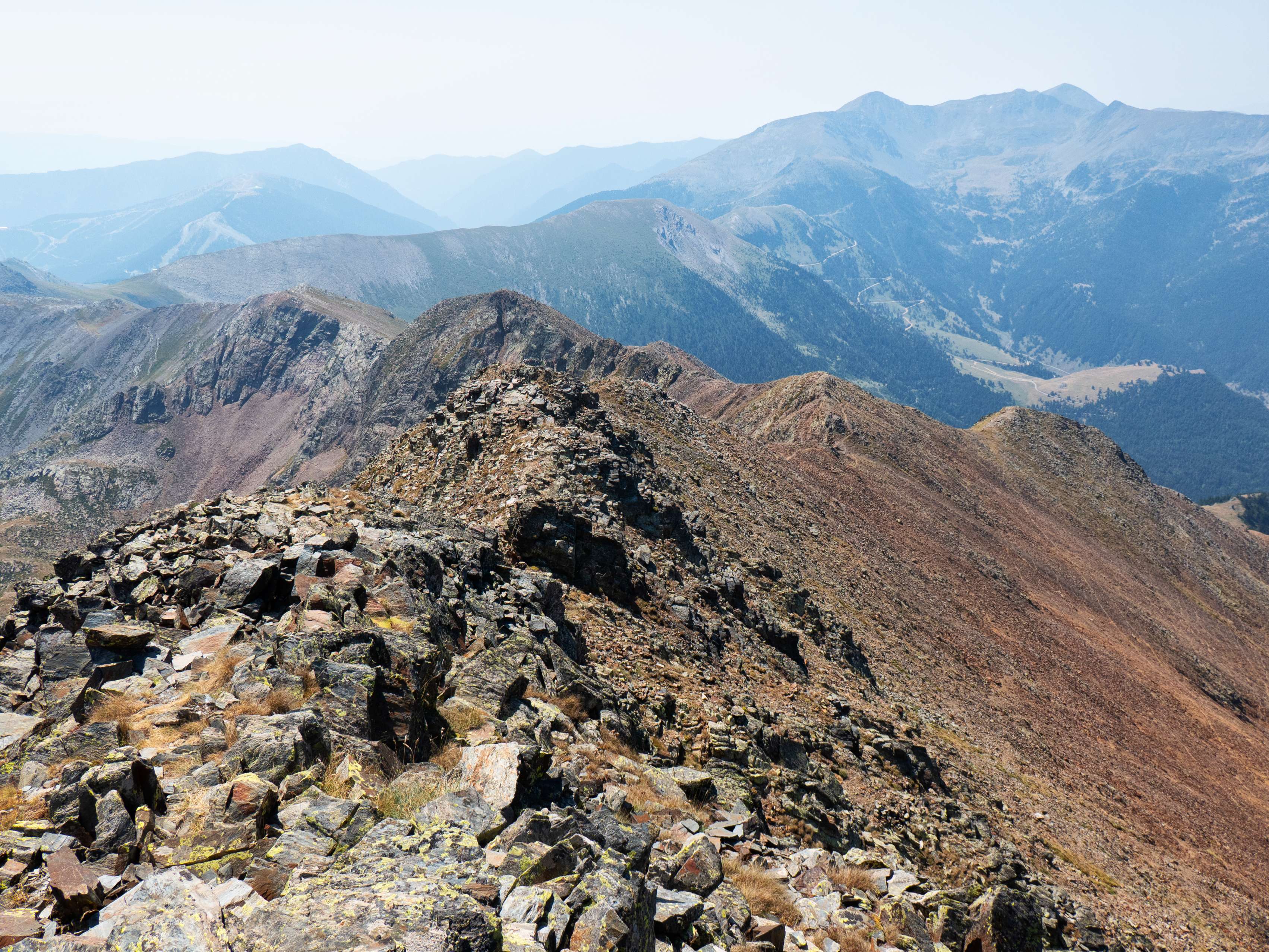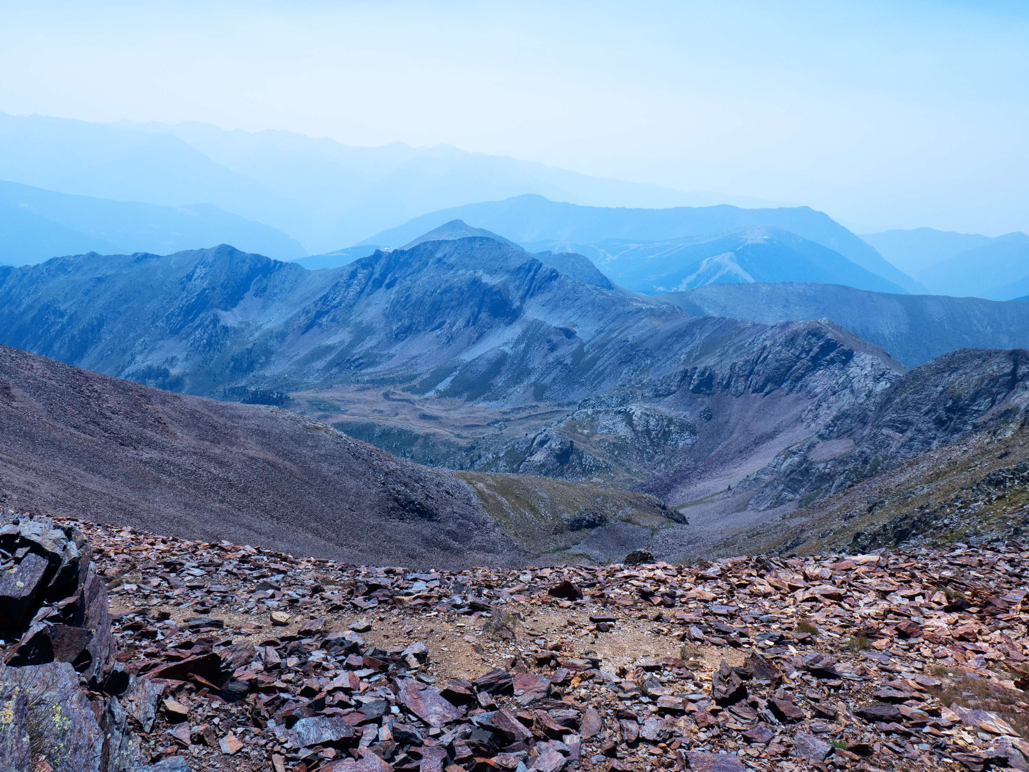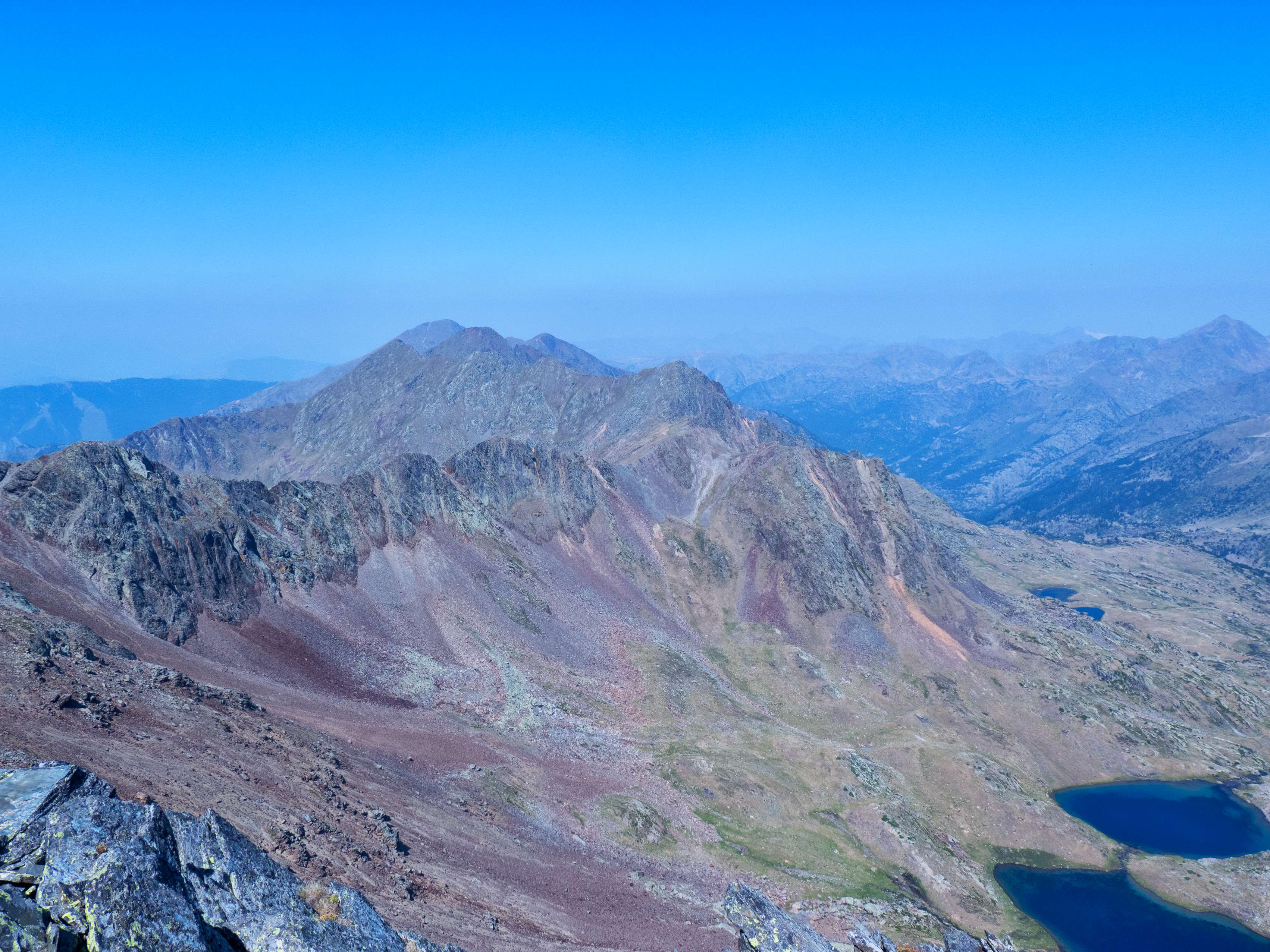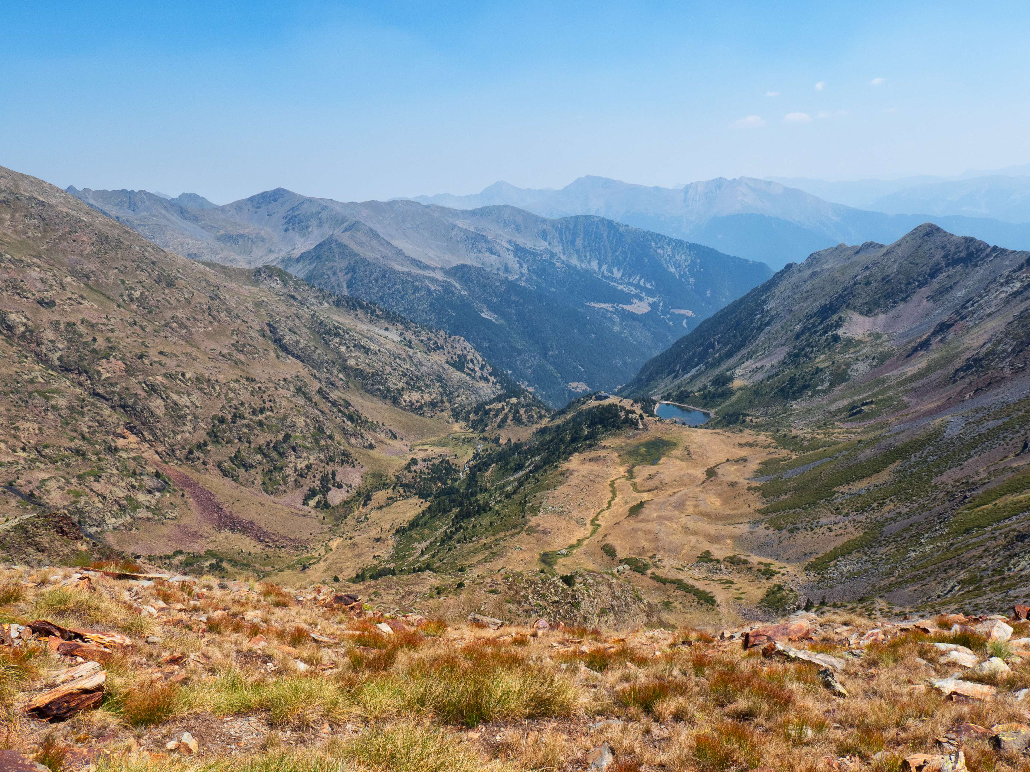 Como suele ser habitual en agosto, el día es muy calimoso y el horizonte queda limitado a las montañas meridionales andorranas, situadas a menos de 20 km. A nuestros pies se extiende el valle de Arinsal, en su avance hasta unirse con el Valira, ya en Andorra la Vella.