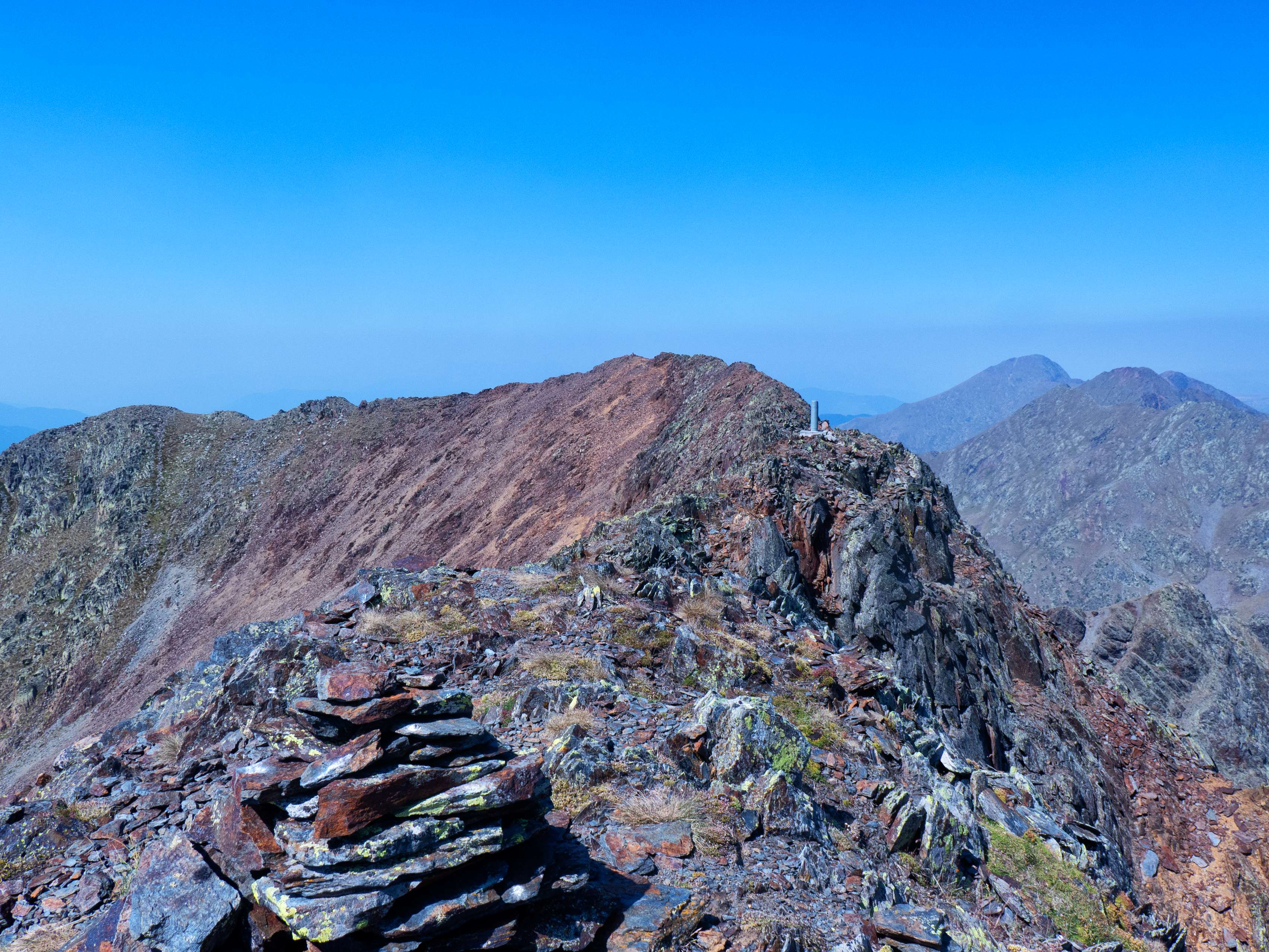 En pocos minutos llegamos a la aguda cumbre de la Agulla de Baiau, que ofrece un soberbio panorama de las abruptas montañas de este rincón trifronterizo del Pirineo: el brutal Lavans, la alargada cresta del Medacorba (punto donde encontramos la triple frontera), la piramidal Roca Entrevessada y el Pic de Baiau, de donde venimos.