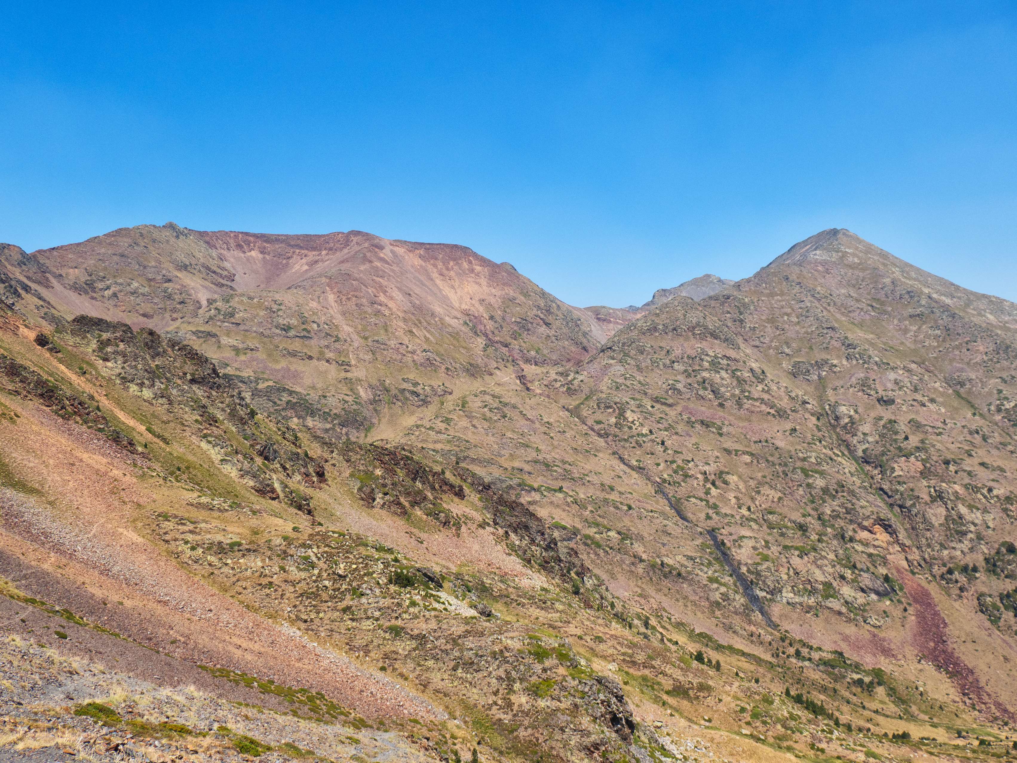 Desde el collado observamos, al otro lado del desfiladero, las dos montañas que cierran el circo por su vertiente occidental: el Pic de Sanfonts y la Agulla de Baiau, ambas en lo alto de una elevada pared multicolor.