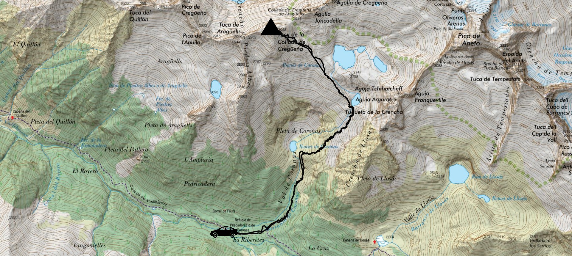 El valle de Coronas es angosto y empinado: pasa de los 1900 metros hasta los 3400, no en vano llega hasta el mismo Aneto. Aún así, por esta misma razón, hay casi siempre sendero, fruto del paso constante de montañeros que suben hasta la montaña más alta de los Pirineos por esta vía, igual de concurrida que la vía norte por ser más corta. El Aneto permanece invisible por ahora; quien asoma a nuestra izquierda es otra montaña que hoy nos es de mucho más interés...