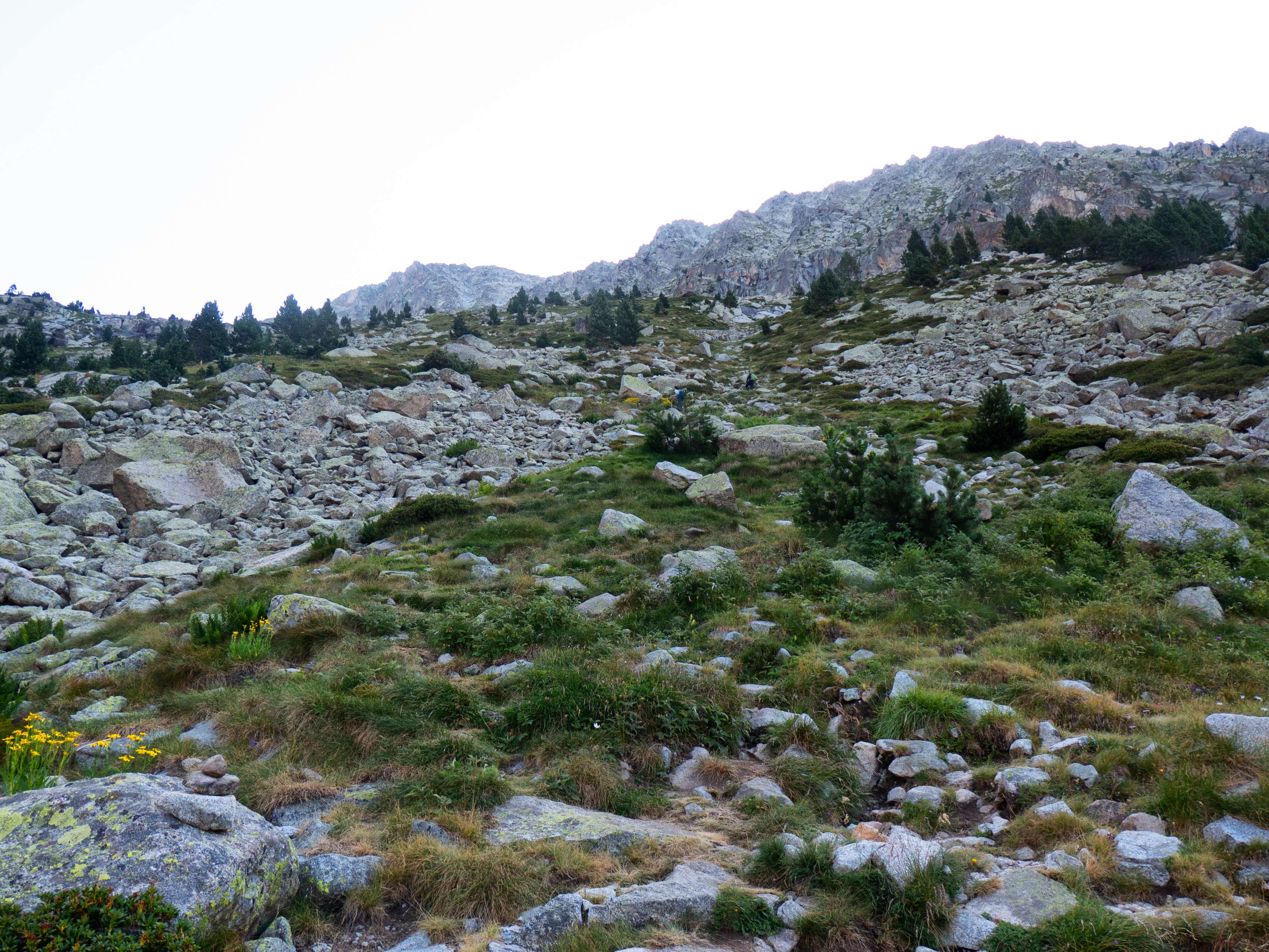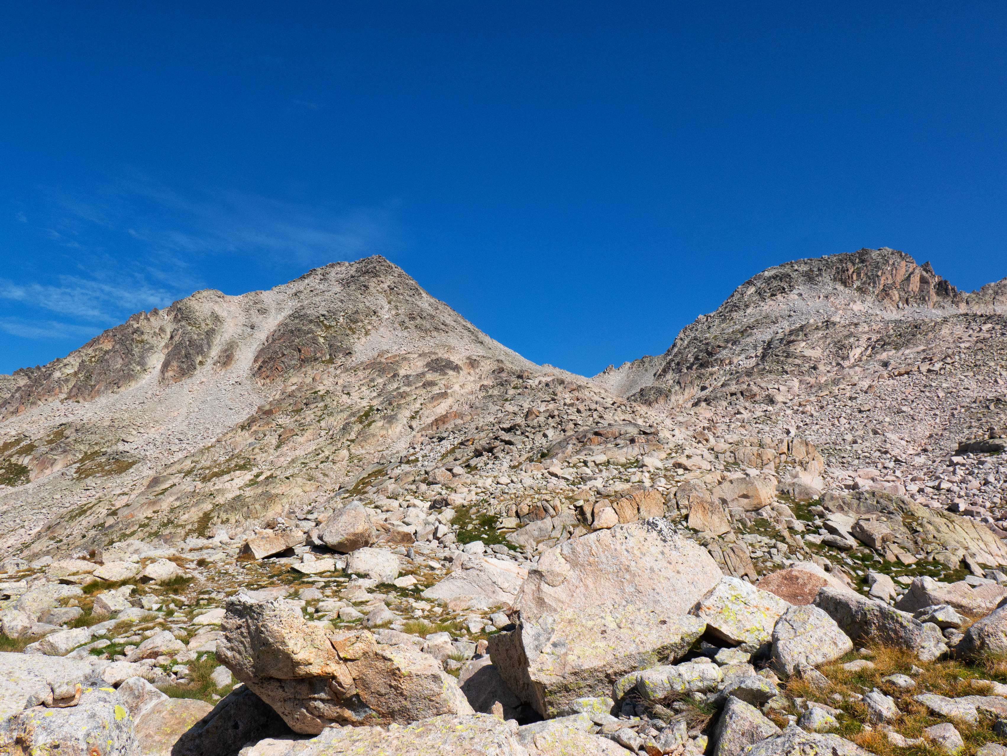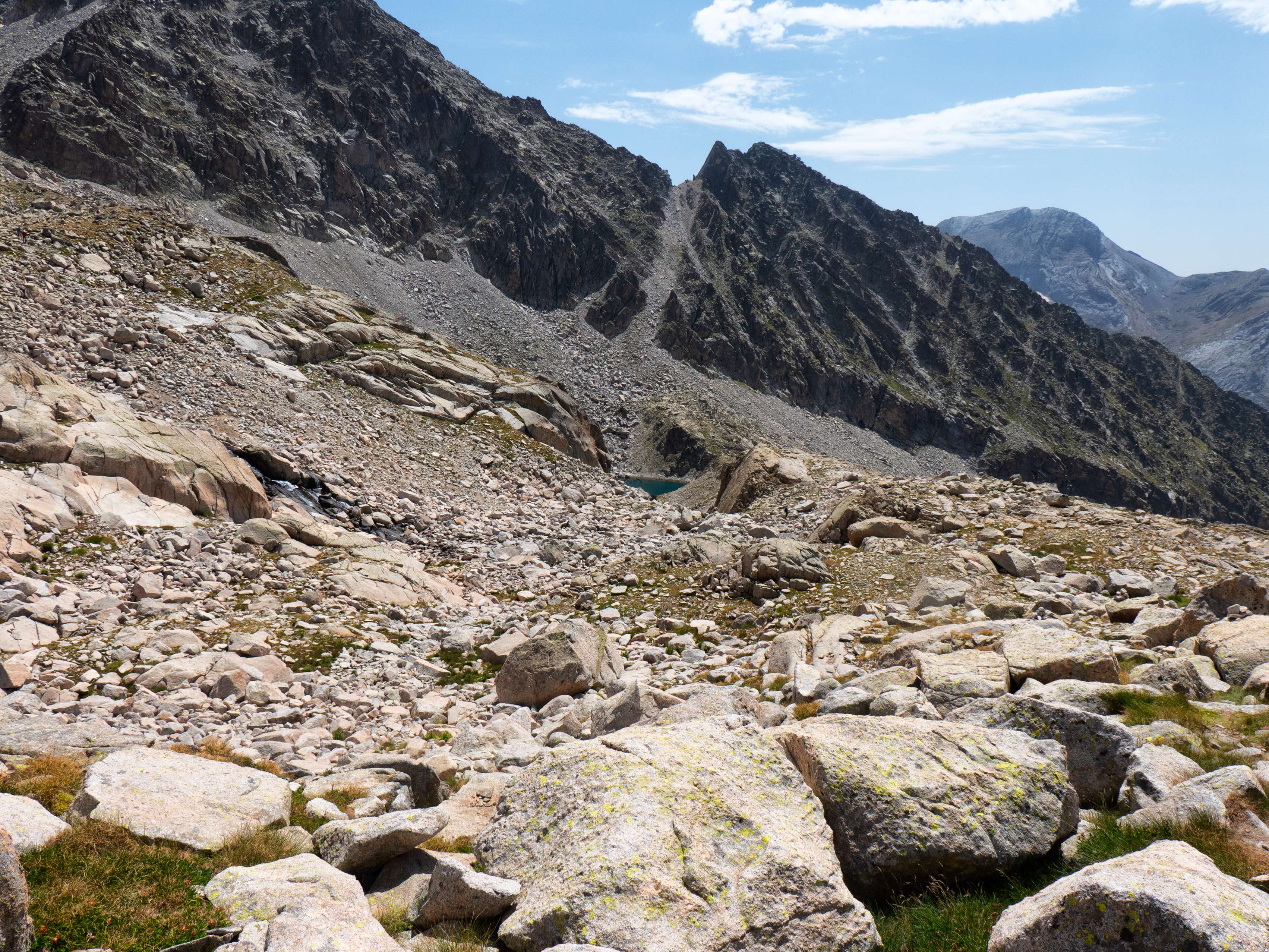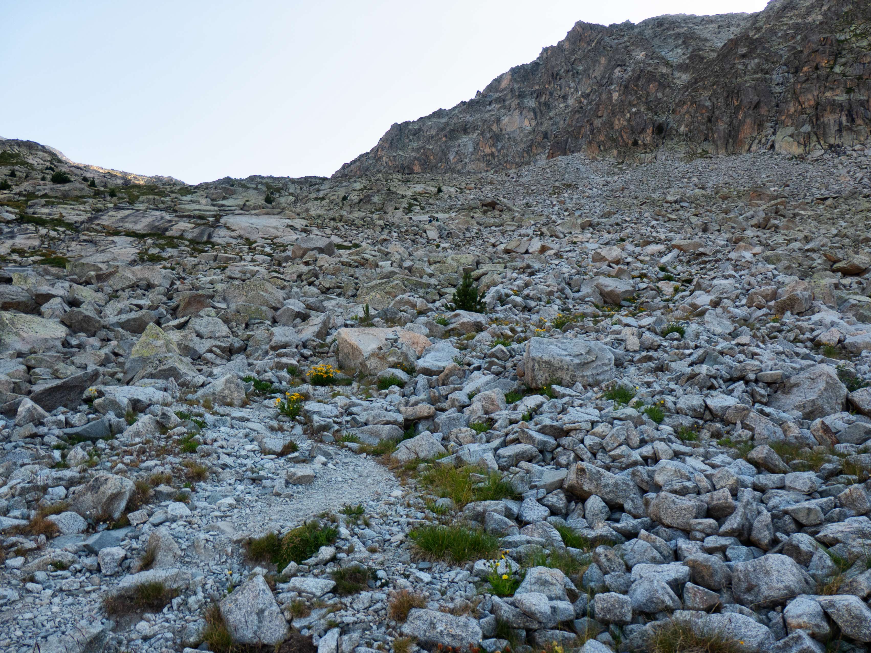 Sobre los 2500 metros, la hierba prácticamente desaparece y se ve sustituida por piedras no demasiado grandes que caen de las paredes de Llosàs. Pese a lo que pueda parecer, son bastante estables, y seguimos ganando altura de manera cómoda, con una pendiente más suave que la del tramo inicial.