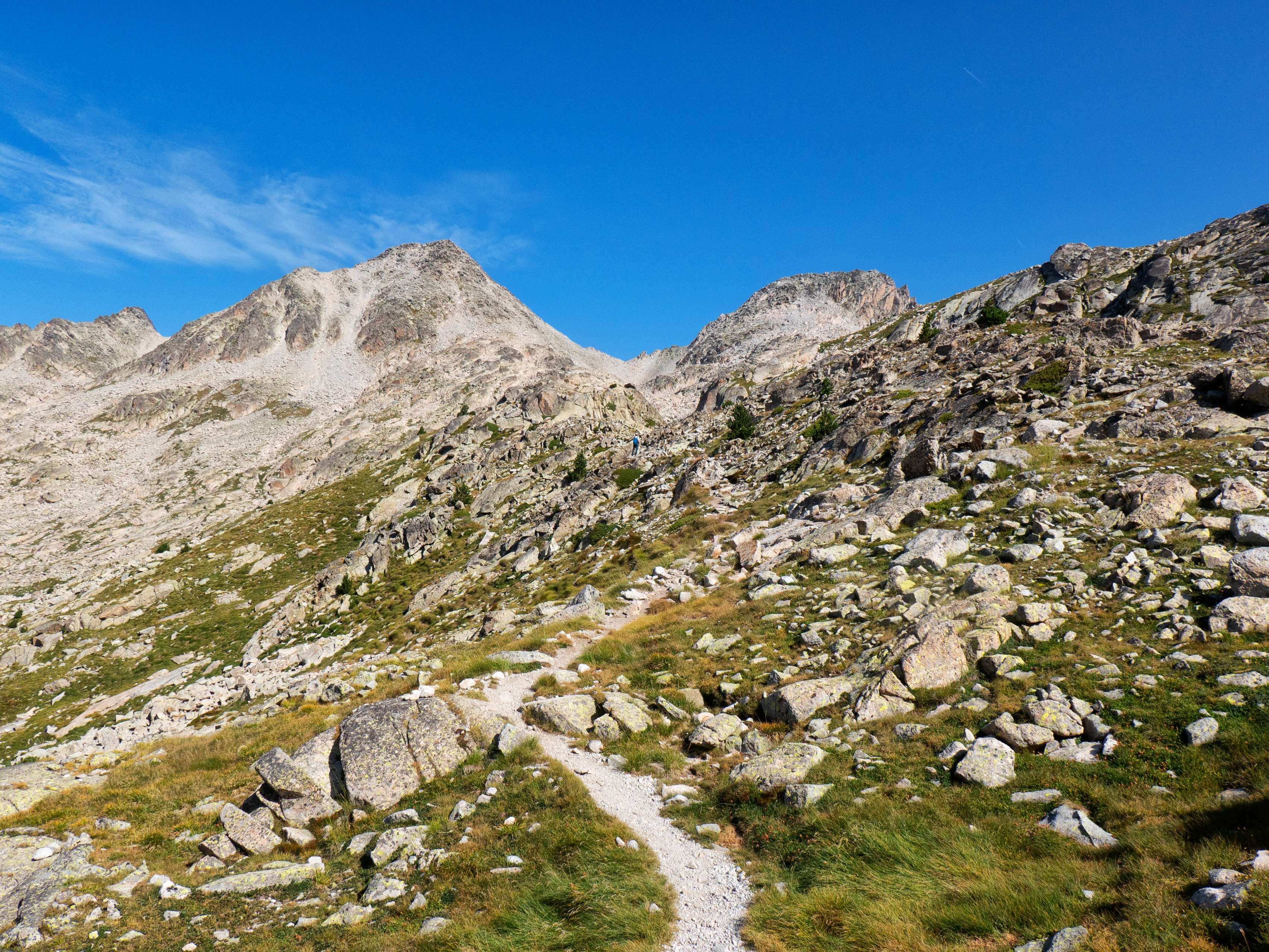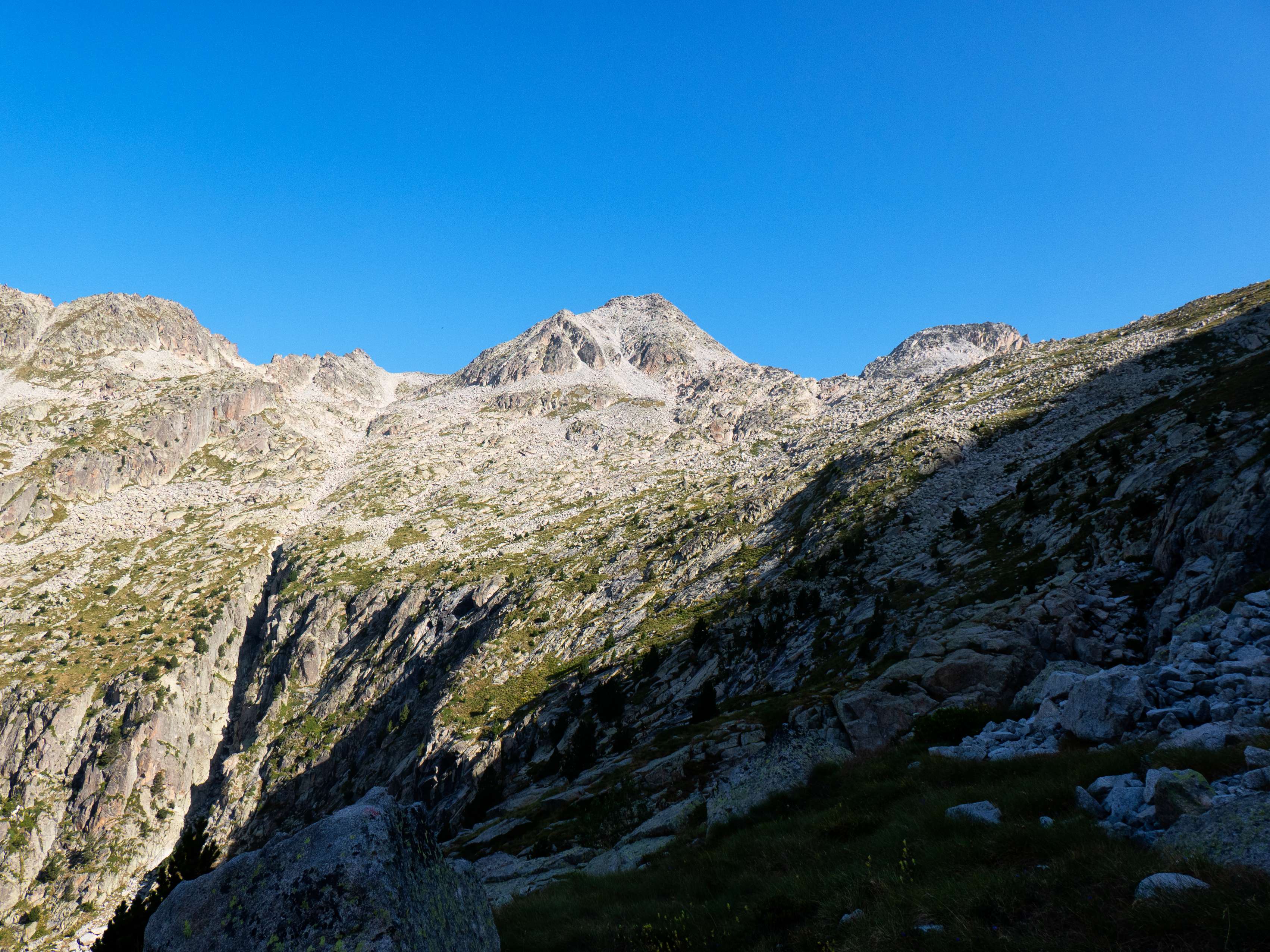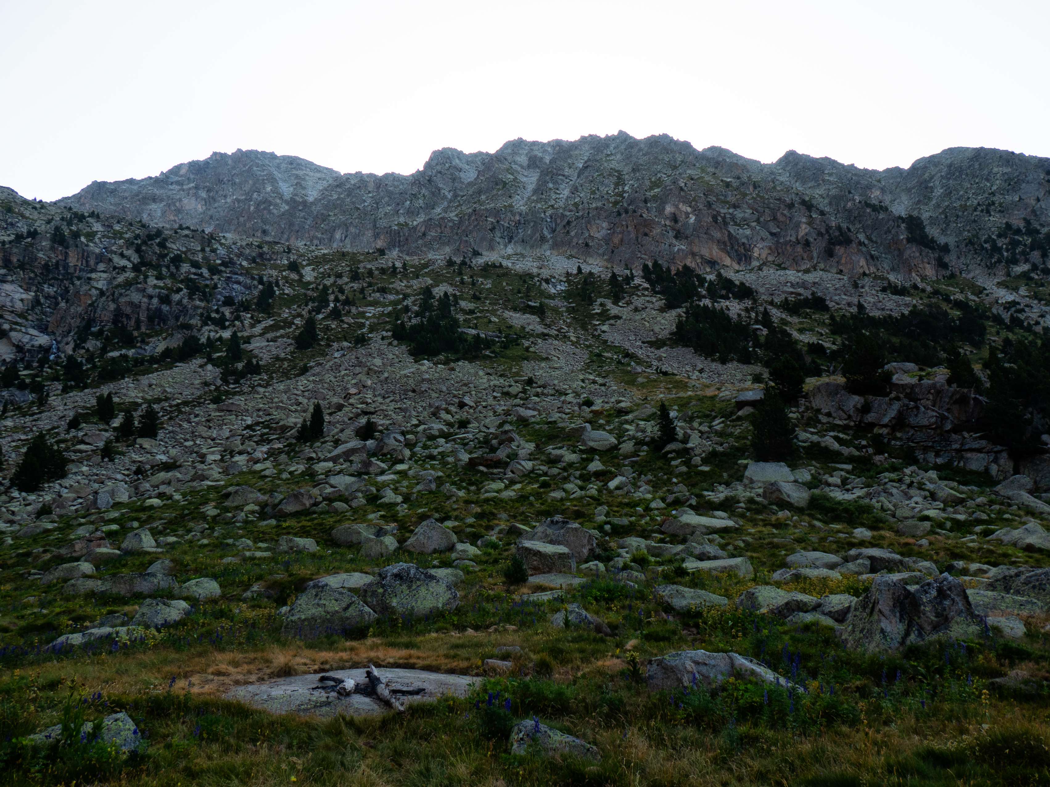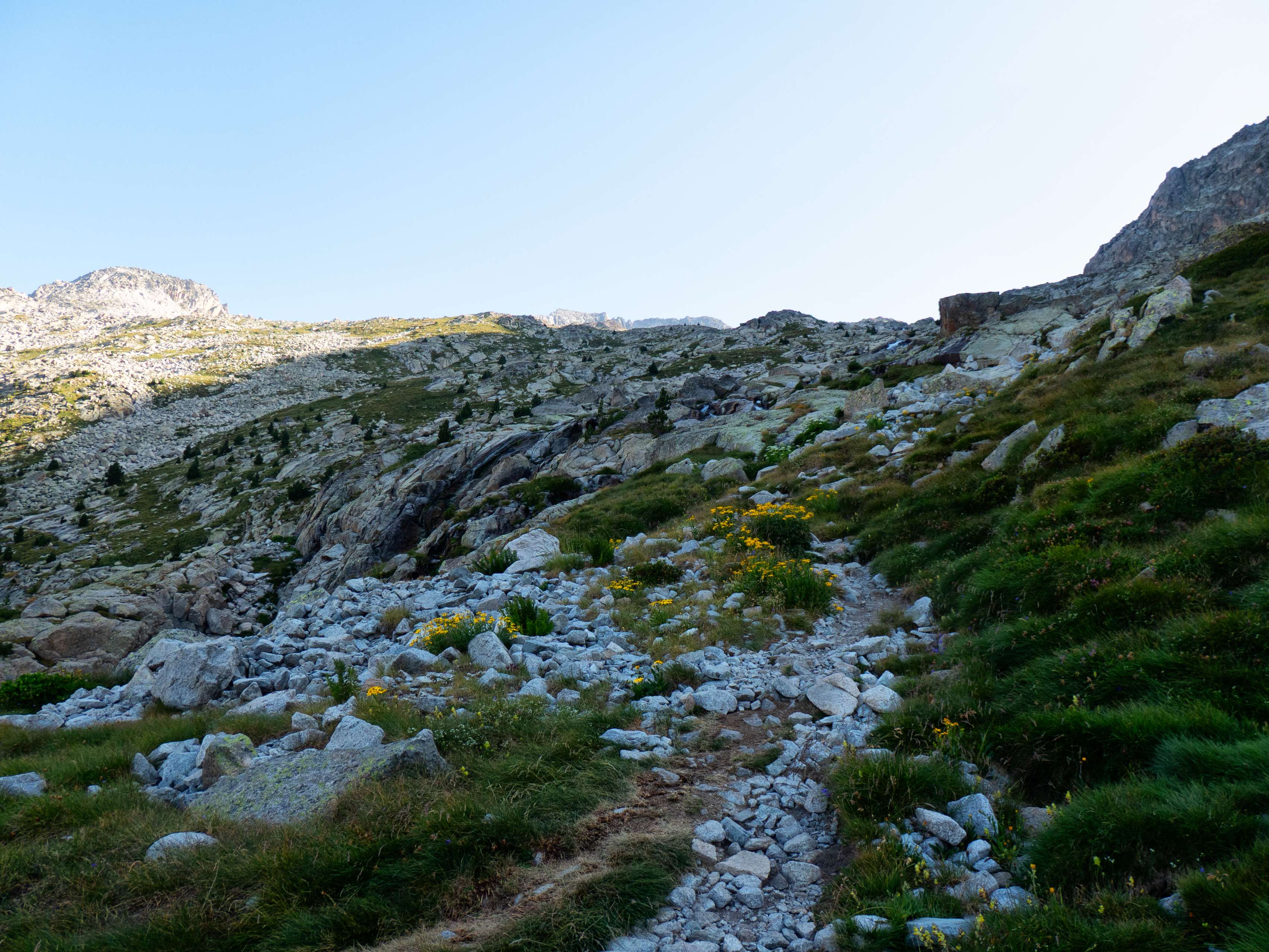 Sobre los 2500 metros, la hierba prácticamente desaparece y se ve sustituida por piedras no demasiado grandes que caen de las paredes de Llosàs. Pese a lo que pueda parecer, son bastante estables, y seguimos ganando altura de manera cómoda, con una pendiente más suave que la del tramo inicial.