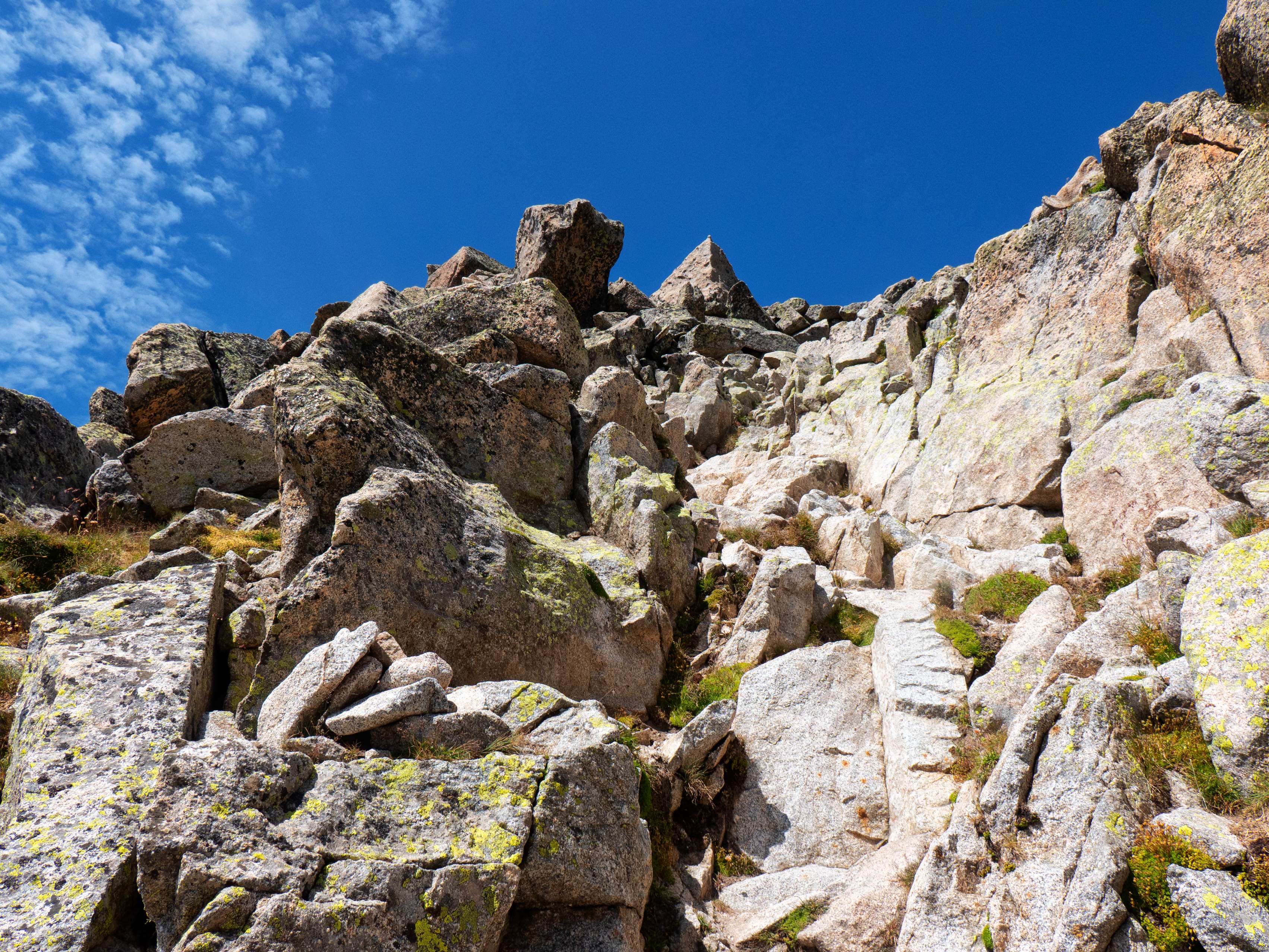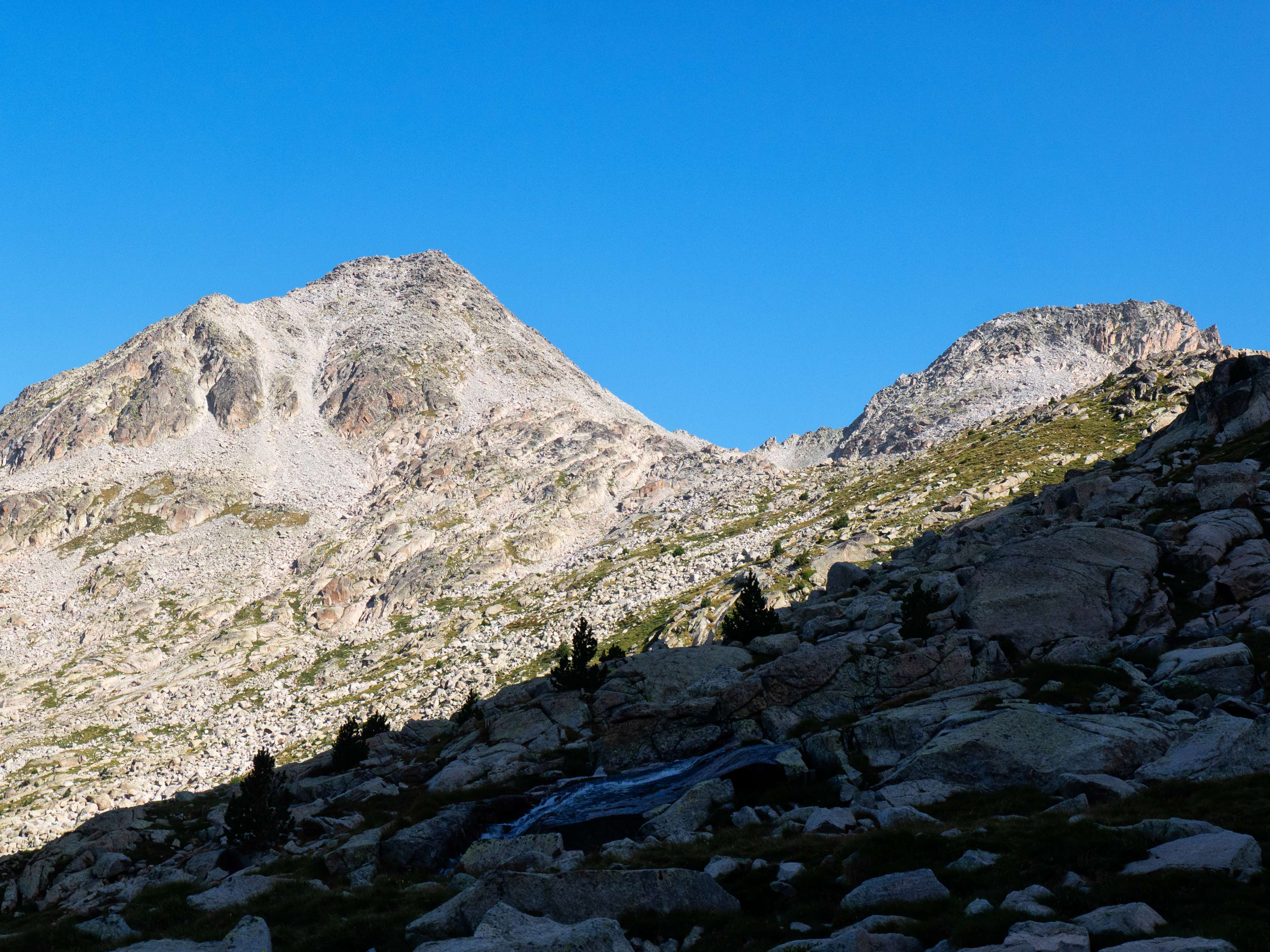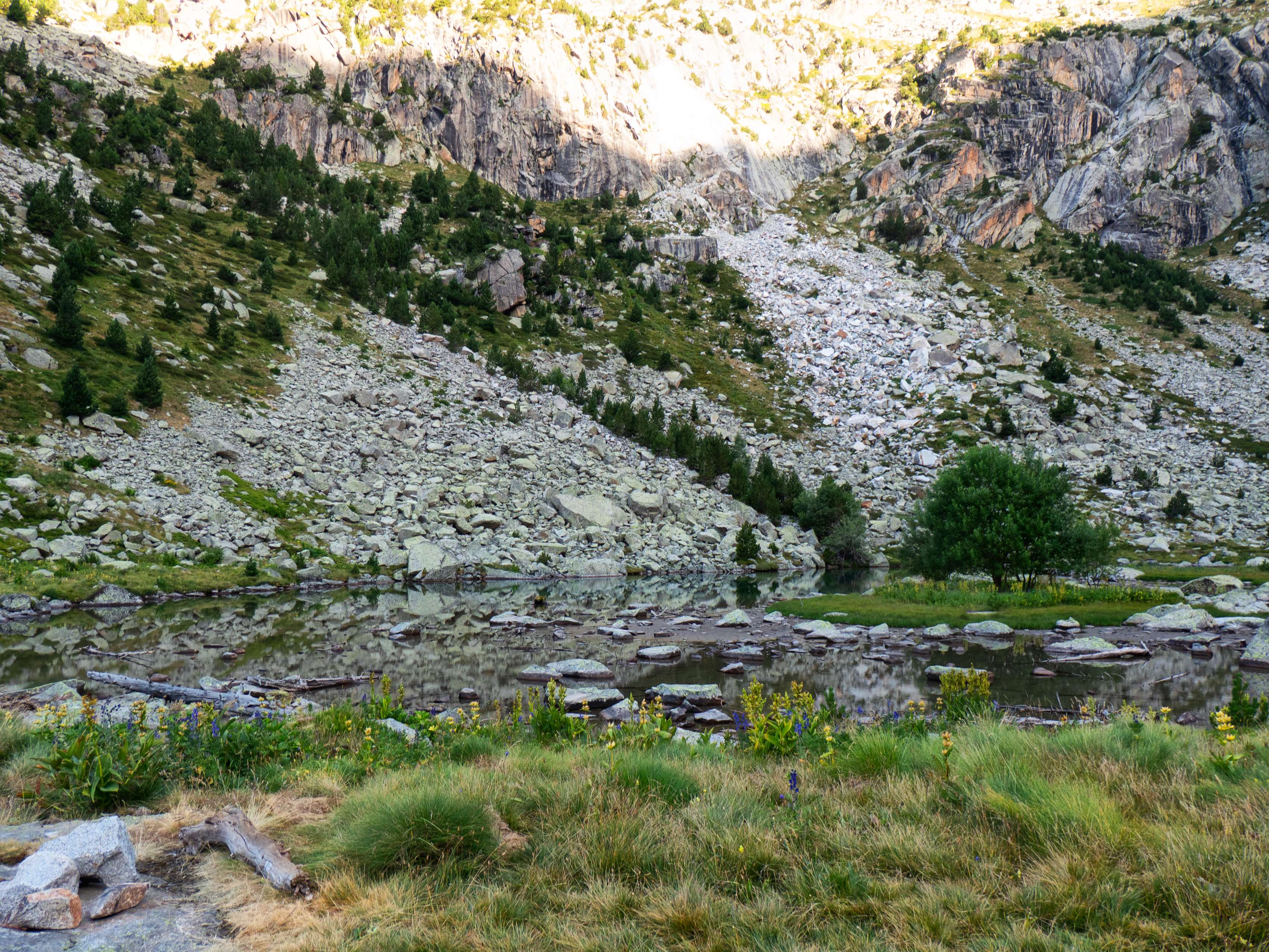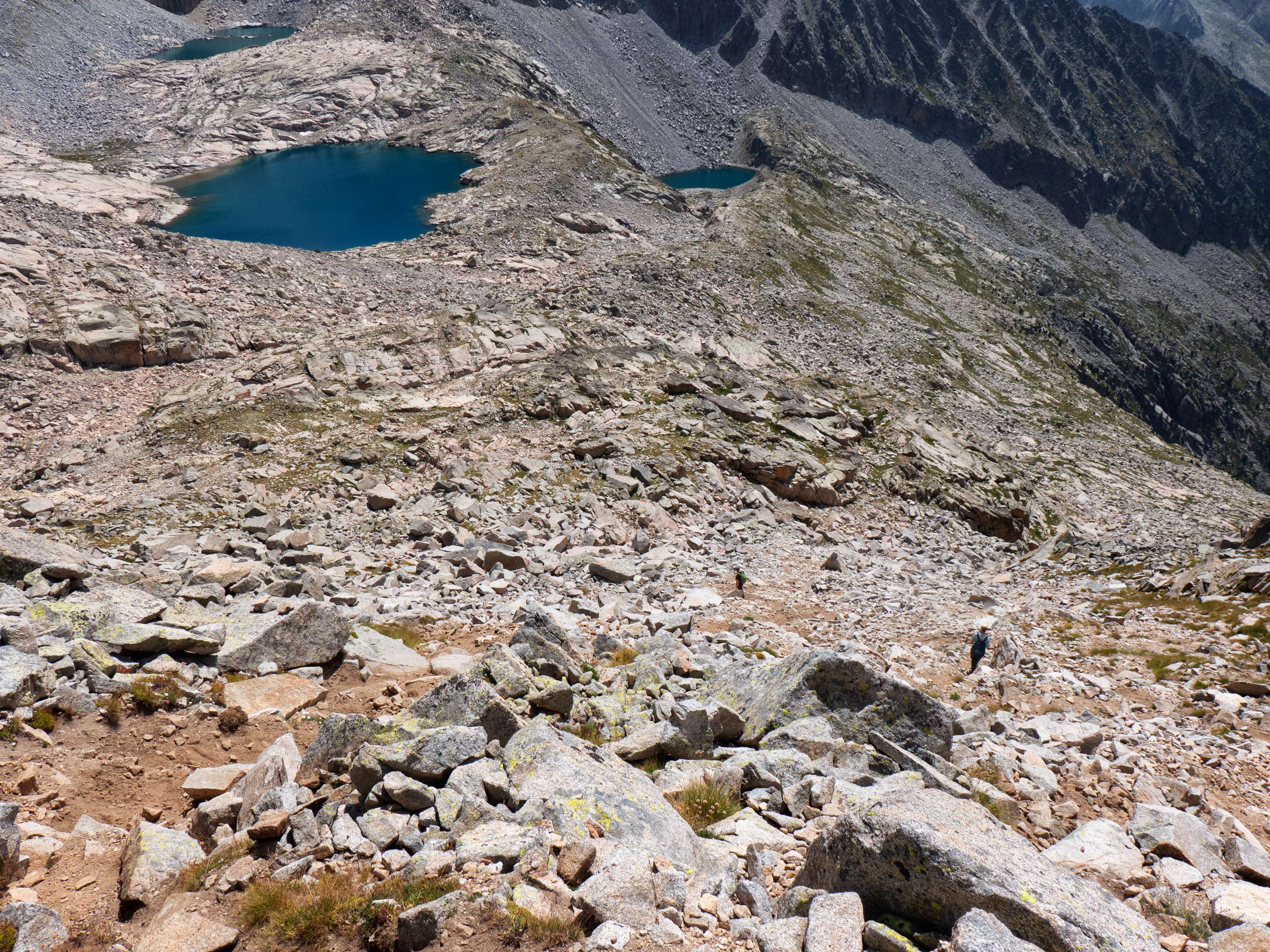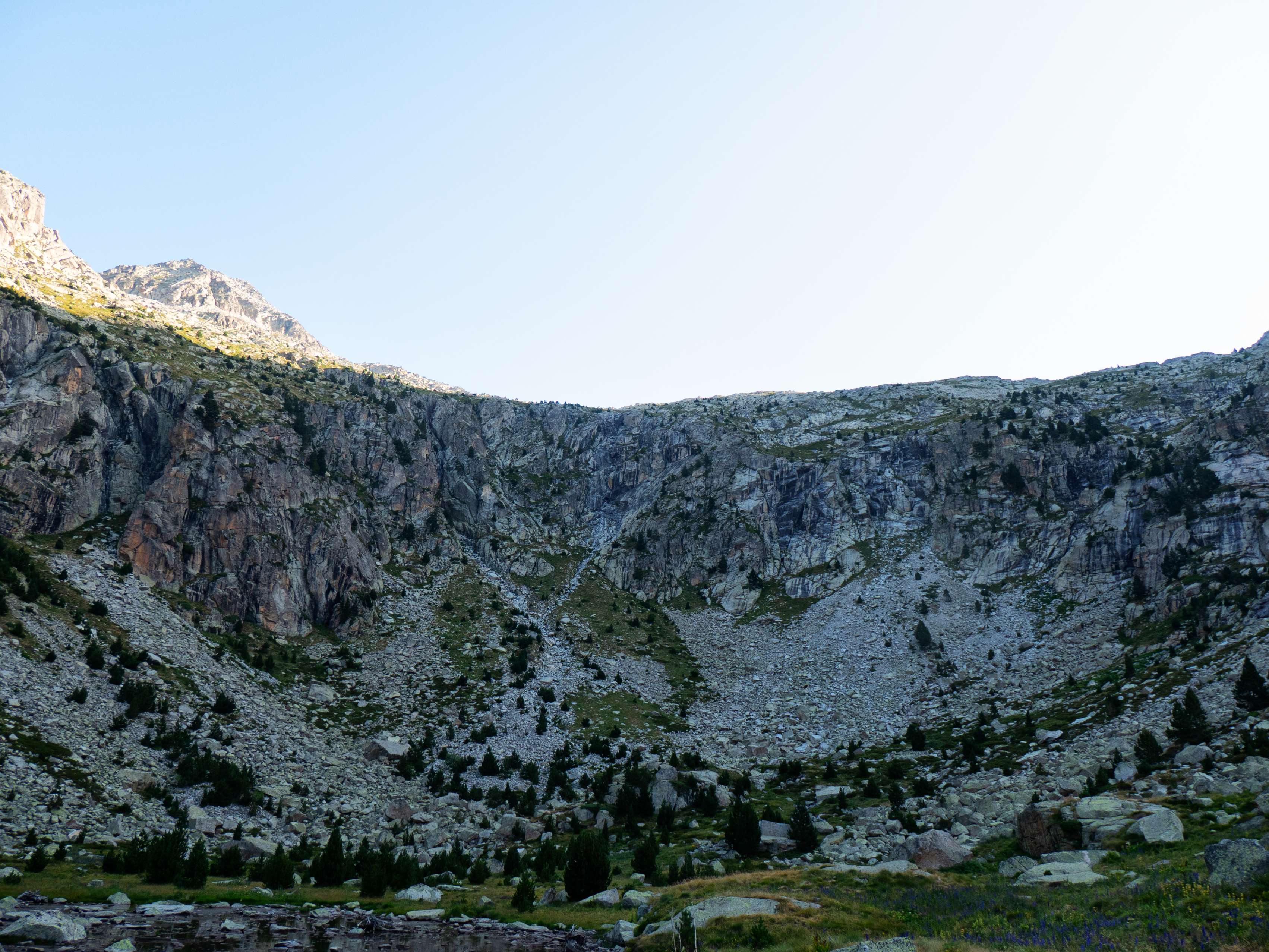 Sobre los 2500 metros, la hierba prácticamente desaparece y se ve sustituida por piedras no demasiado grandes que caen de las paredes de Llosàs. Pese a lo que pueda parecer, son bastante estables, y seguimos ganando altura de manera cómoda, con una pendiente más suave que la del tramo inicial.