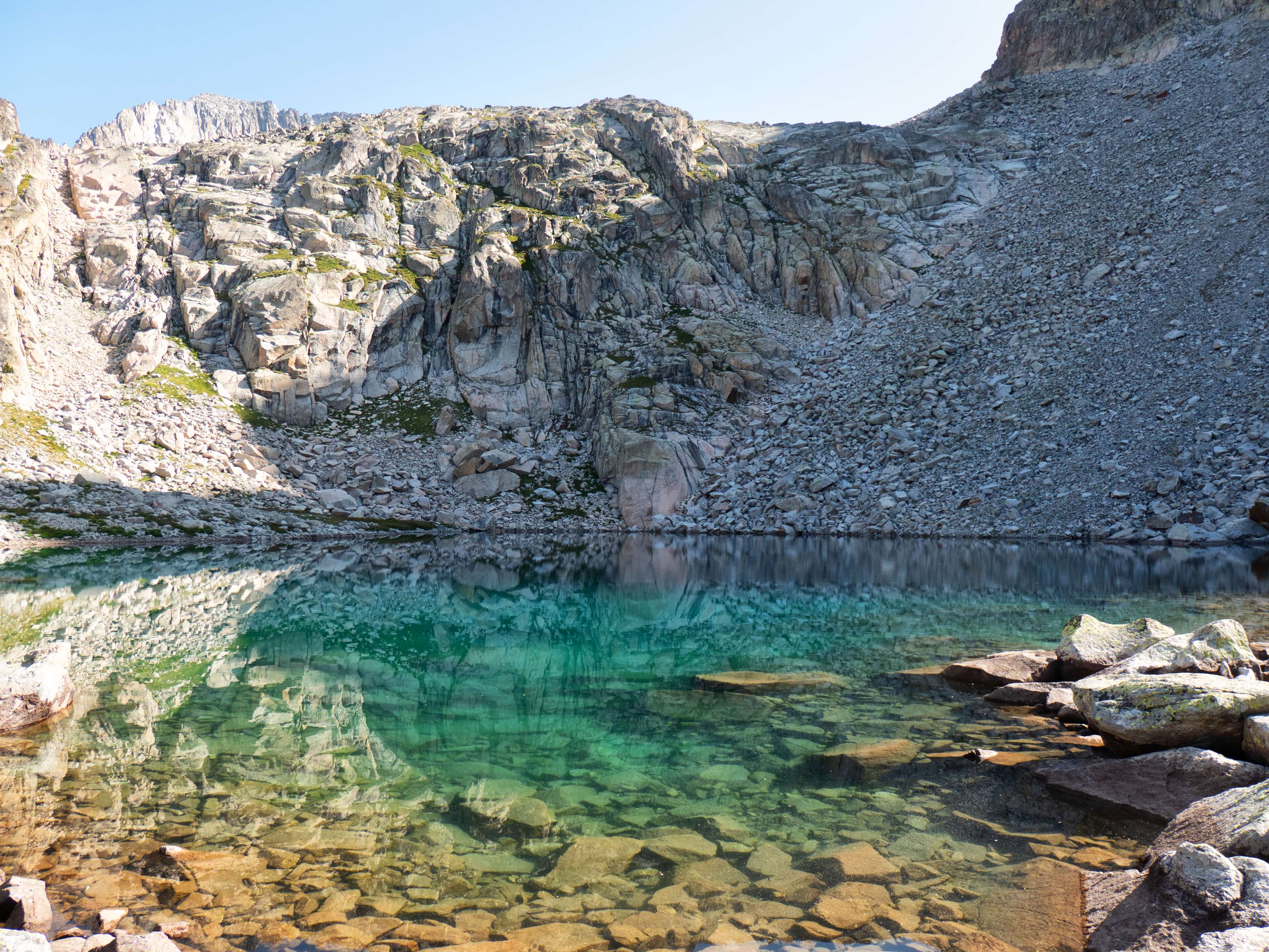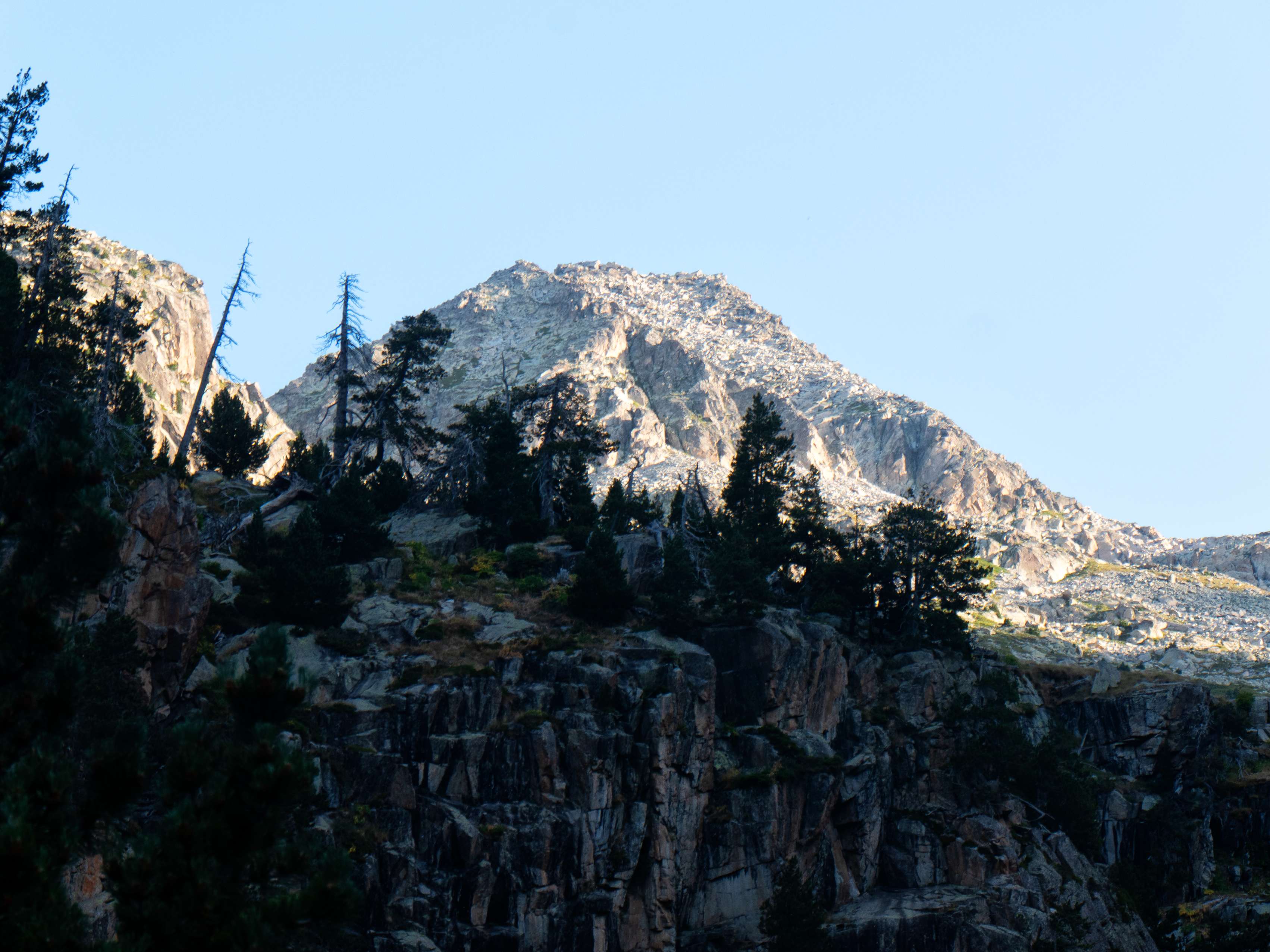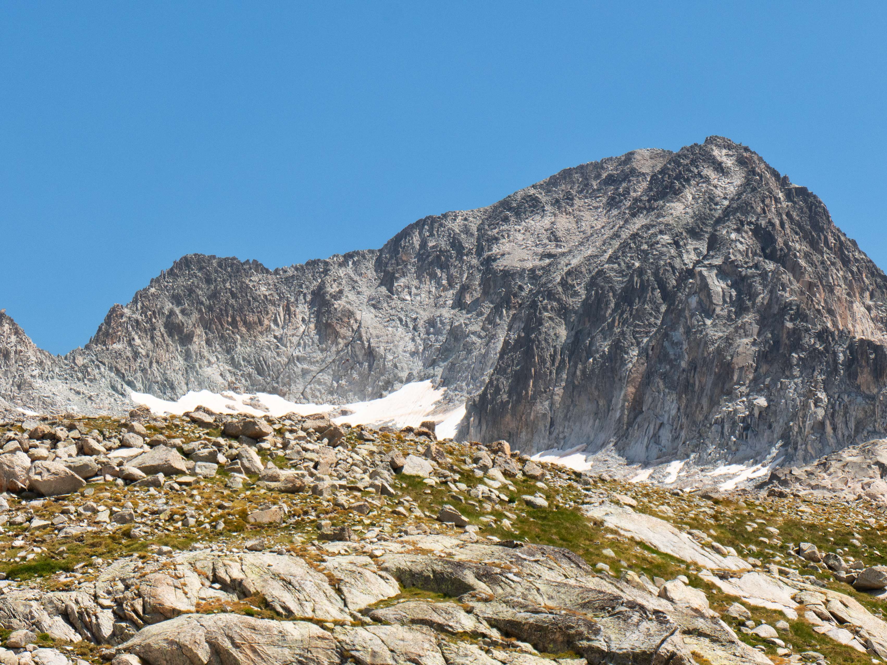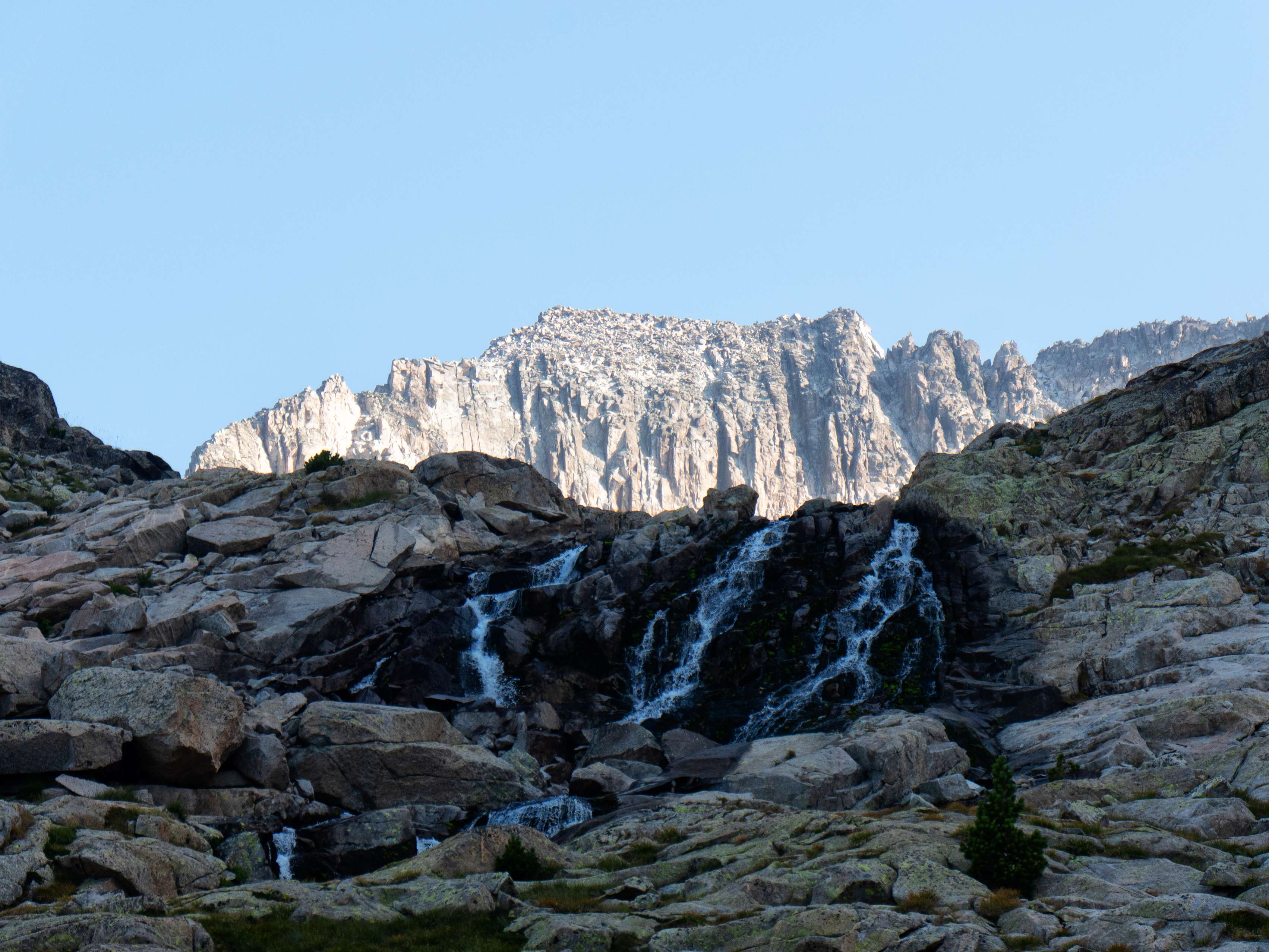 Sobre los 2500 metros, la hierba prácticamente desaparece y se ve sustituida por piedras no demasiado grandes que caen de las paredes de Llosàs. Pese a lo que pueda parecer, son bastante estables, y seguimos ganando altura de manera cómoda, con una pendiente más suave que la del tramo inicial.