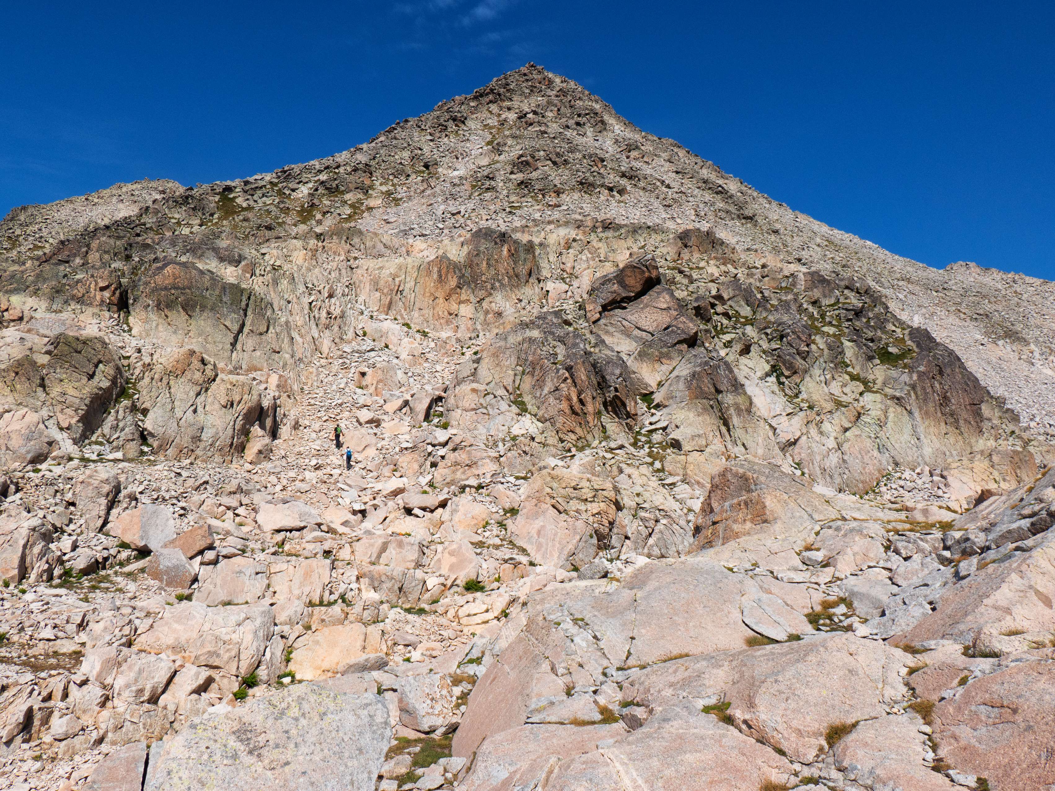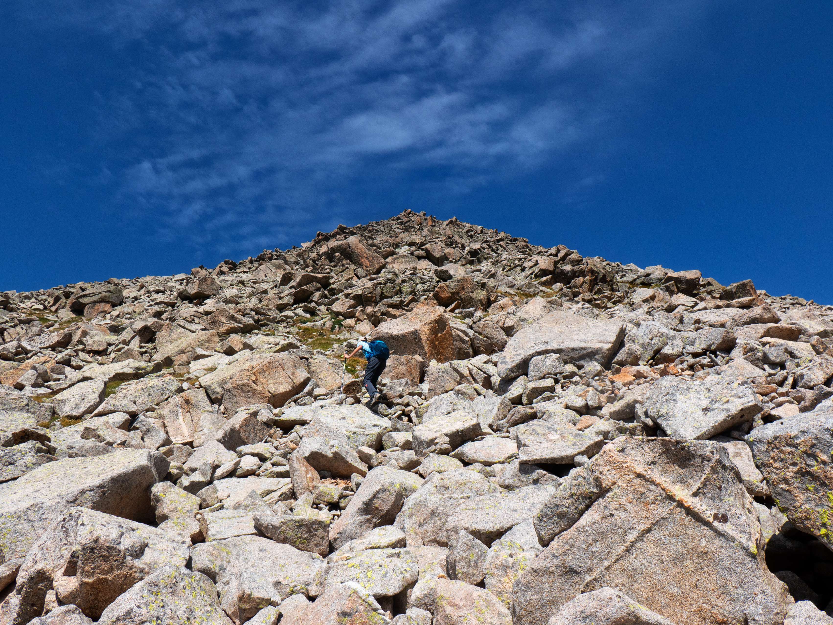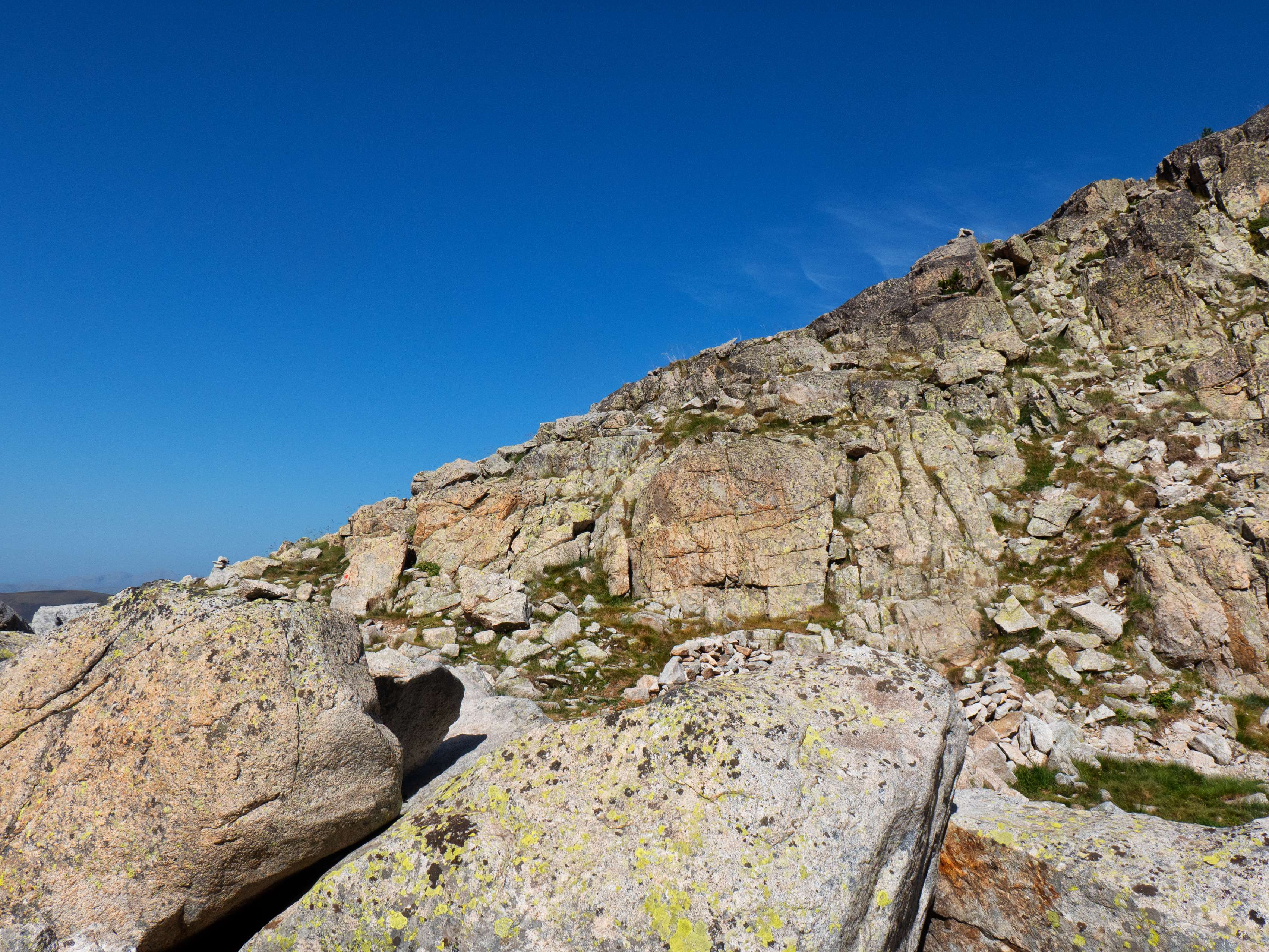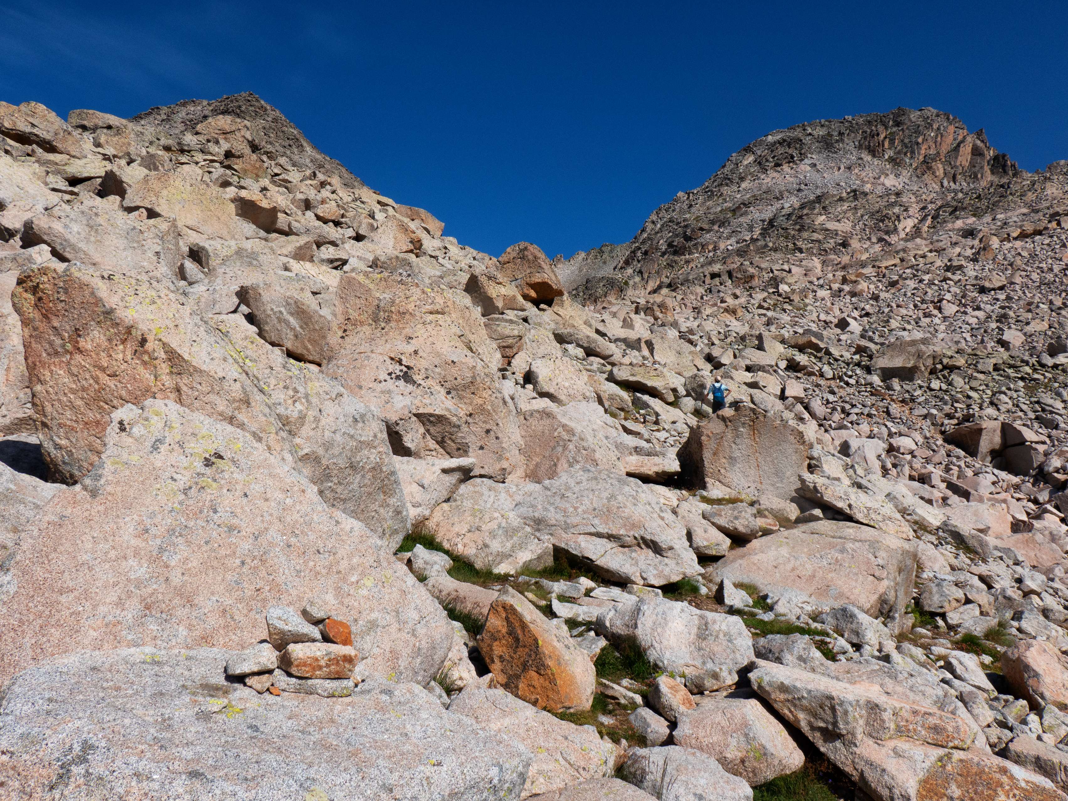 ...en el típico pedregal granítico de grandes bloques, por los que debemos ir saltando de uno a otro siguiendo los hitos. Aunque el macizo de la Maladeta es un pródigo en parajes como este, los bloques que encontramos en esta vaguada previa al Collado de Cregüeña se cuentan entre los mayores que haya visto en montaña. A eso le sumamos que vamos encontrándonos tramos bastante verticales, que nos obligan a utilizar las manos con frecuencia y que ralentizan bastante la progresión.
