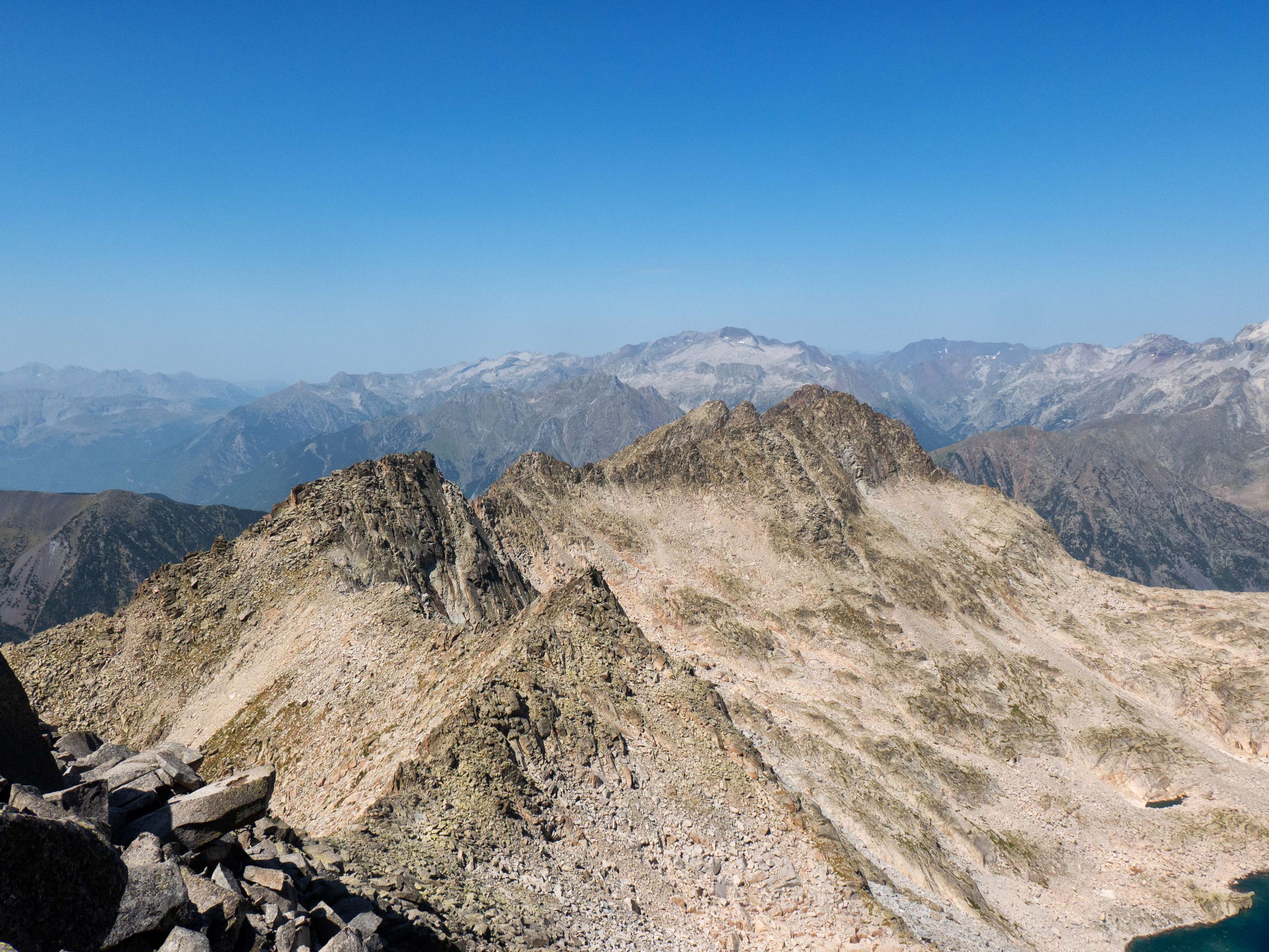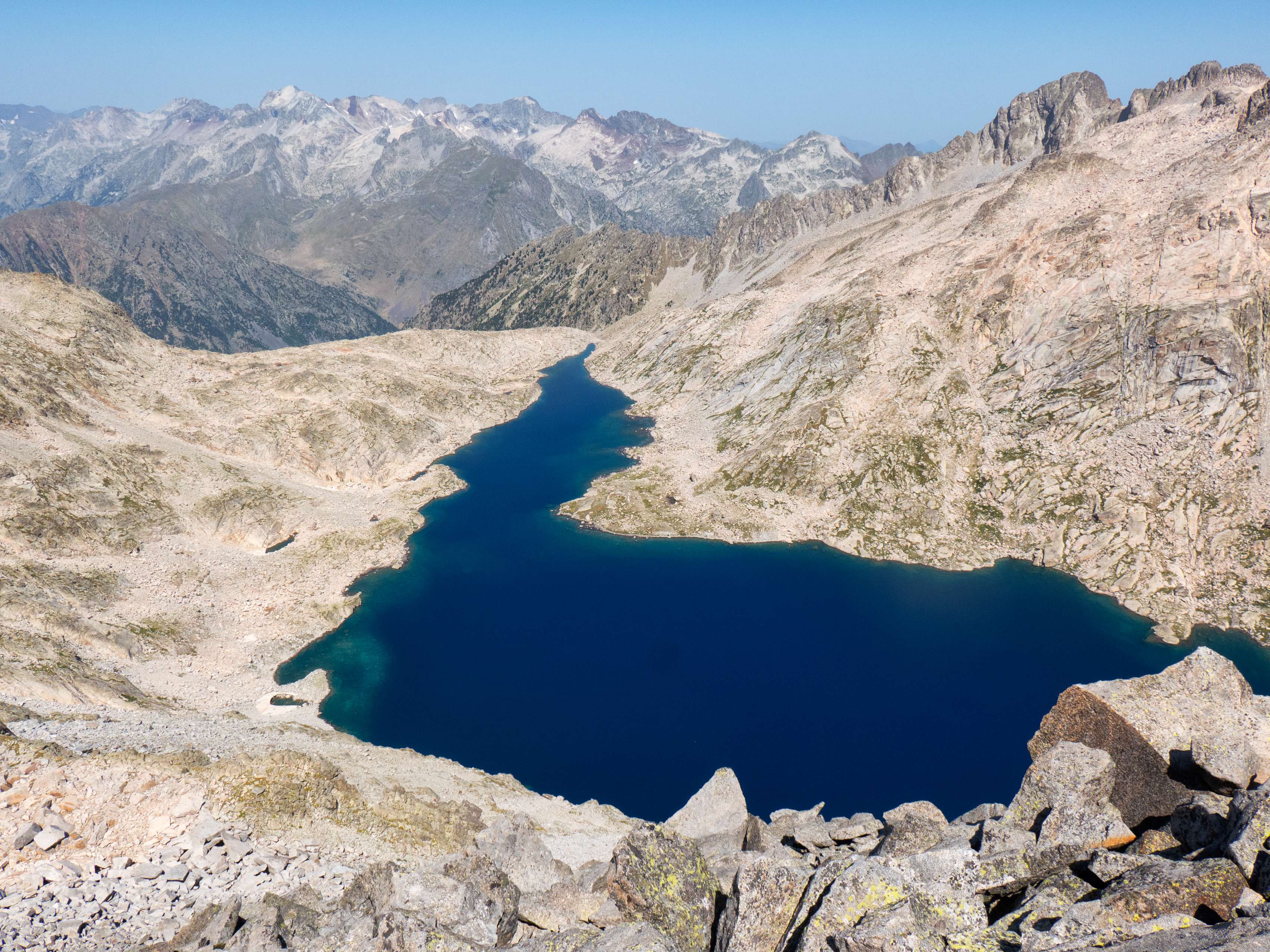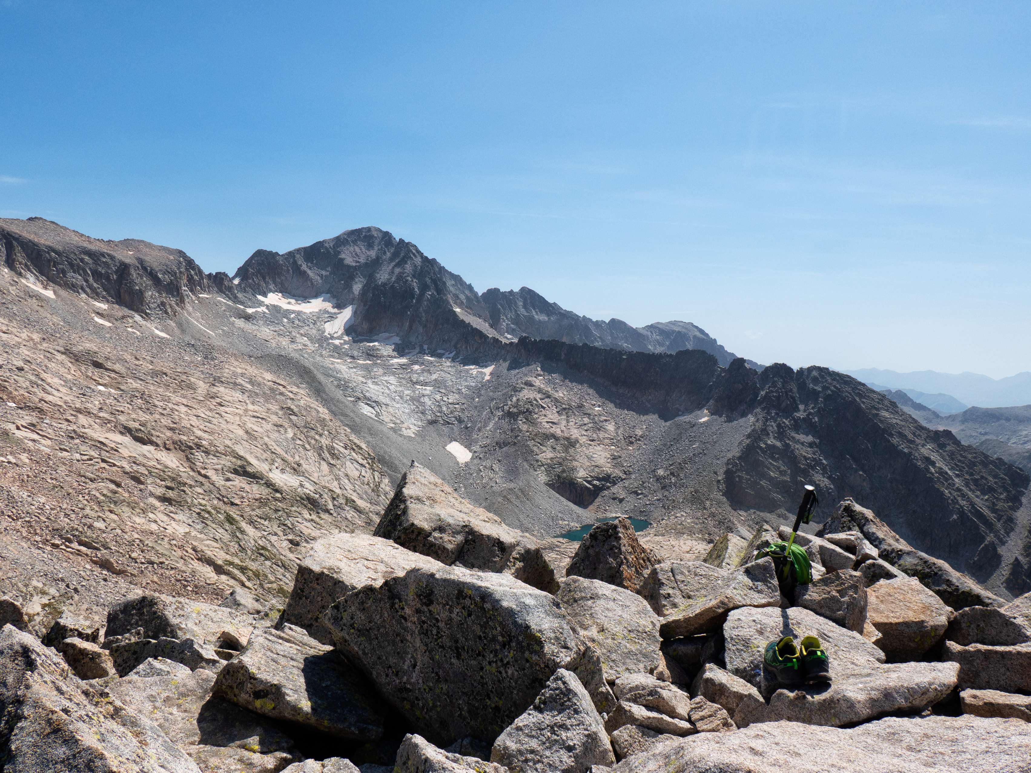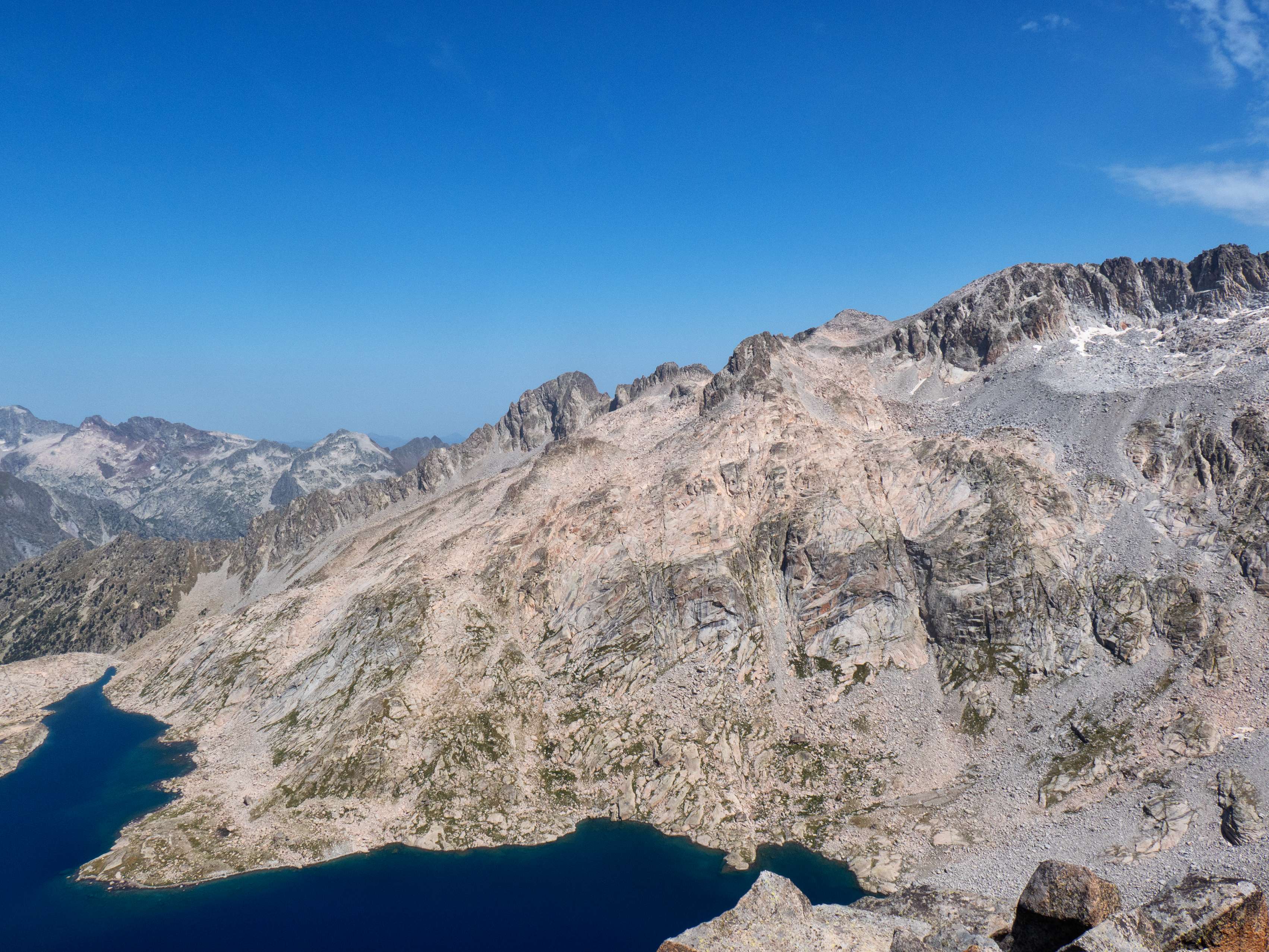 Si tuviéramos que escoger una sola vista de todas las que nos ofrece esta cima, probablemente sería esta: una visión cenital y sin obstáculos del Ibón de Cregüeña, el mayor del Pirineo, con el macizo del Perdiguero como telón de fondo. Absolutamente impresionante.
