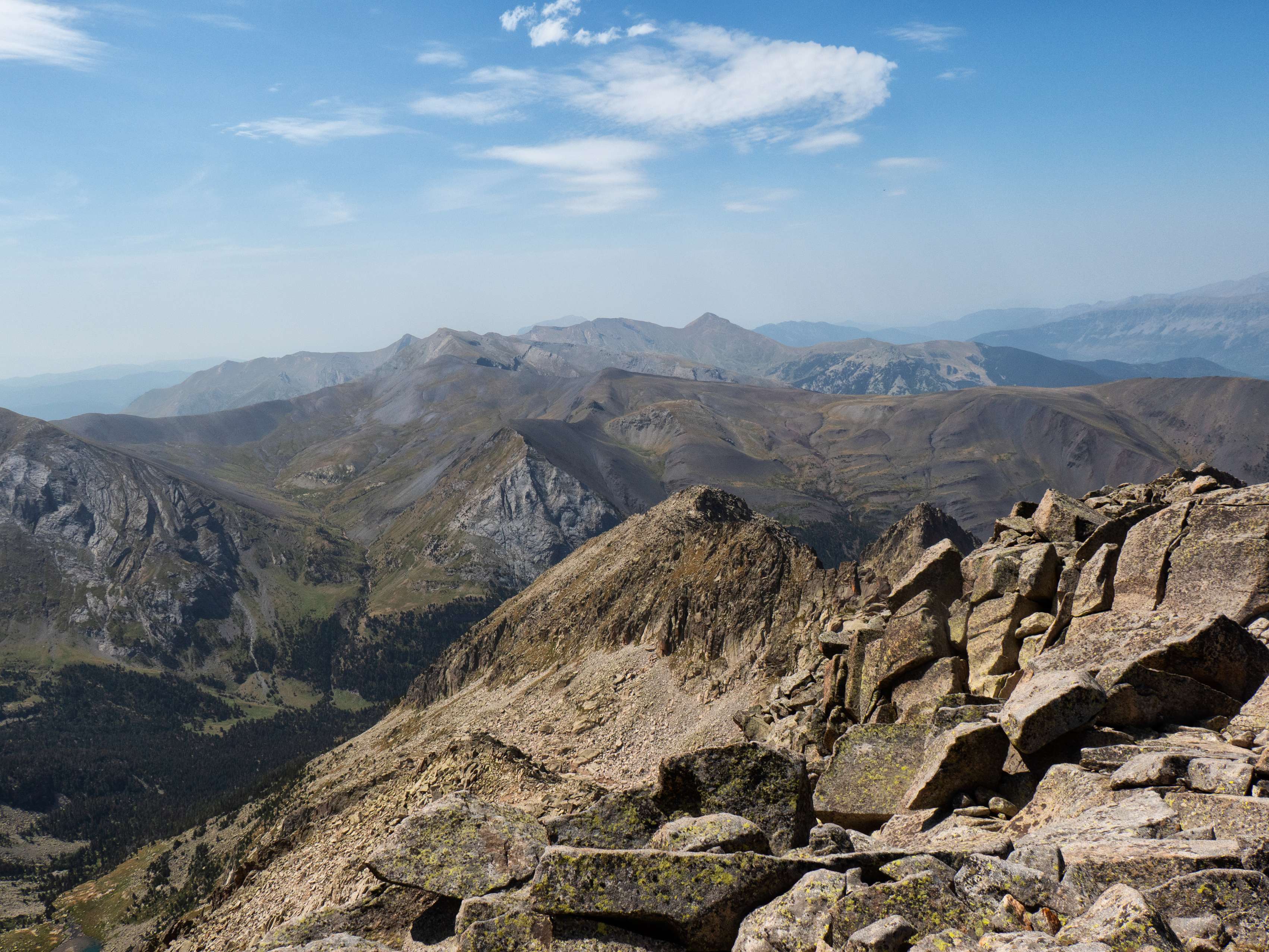 Y para completar esta dilatada panorámica de 360 grados, más allá de la cresta de Piedres Albes, se despliegan la Sierra Negra y las montañas del Ampriu, que cierran el valle de Benasque por el sur.