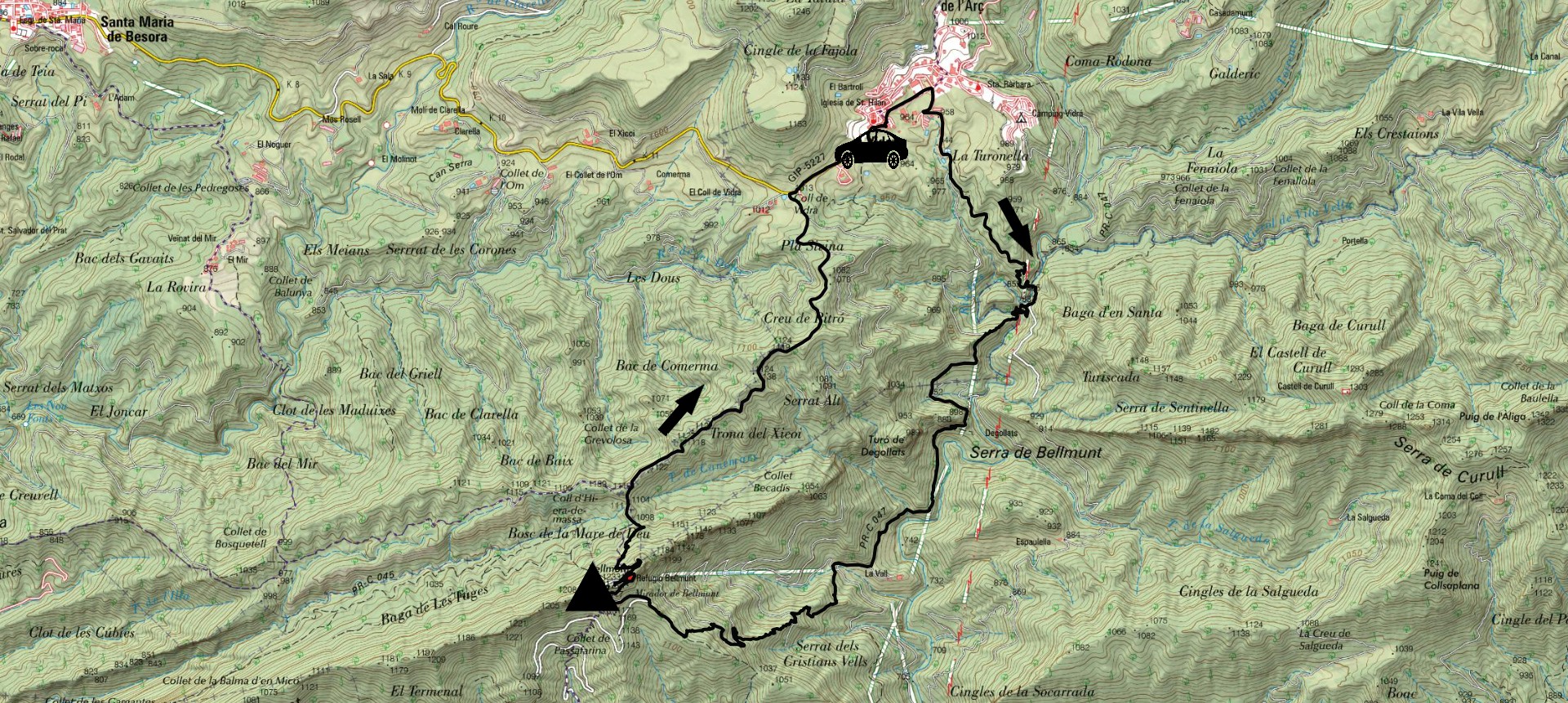La Serra de Bellmunt es la sierra que cierra por el norte la extensa depresión interior de la Plana de Vic. Integrada en la Cordillera Transversal, constituye el apéndice más meridional de su macizo más elevado, el de Santa Magdalena y Puigsacalm. Avanzando de oeste a este a lo largo de unos 7 km entre los valles del Ter y el Ges, está compuesta mayoritariamente por areniscas y margas, lo que le confiere ese característico tono gris pálido al afilado crestón rocoso que ocupa su tramo central, donde se alza su cima principal, que comparte nombre con la sierra. Hasta la misma base de estas crestas se desarrollan frondosos bosques, mediterráneos en la vertiente sur y hayedos en las demás, favorecidos por la elevada humedad de la zona, una de las más lluviosas de Catalunya, circunstancia que también explica la abundancia de cascadas en la región. El punto culminante de la sierra es fácilmente reconocible por un llamativo edificio de color blanco visible desde toda la Plana de Vic y las montañas circundantes. Se trata del Santuari de la Mare de Déu de Bellmunt, encaramado sobre los roquedos somitales y rodeado de abismos, a los que su estructura se adapta de forma sorprendente. Alcanzar esta “ermita en el cielo suspendida“, en palabras de Jacint Verdaguer, permite disfrutar de una de las panorámicas más dilatadas del principado, con excelentes vistas tanto del Pirineo Oriental como de la Plana de Vic, que se contempla aquí en toda su extensión. En esta reseña se propone el ascenso a Bellmunt por el pueblo de Vidrà, descendiendo primero por la Vall del Ges para visitar el Salt del Molí y remontando luego los empinados hayedos de su cara este hasta la cumbre, regresando finalmente por la vía normal desde esta vertiente.