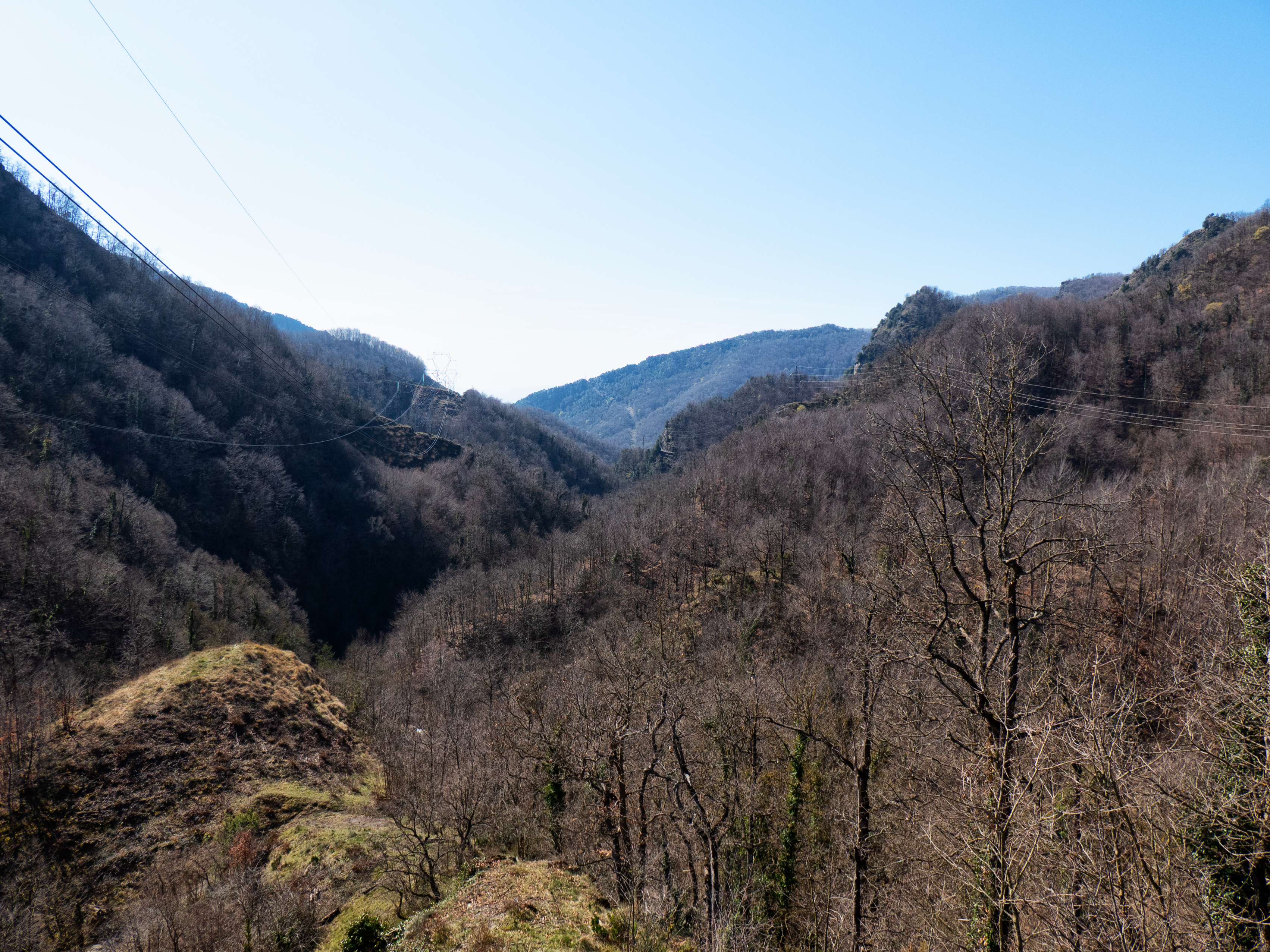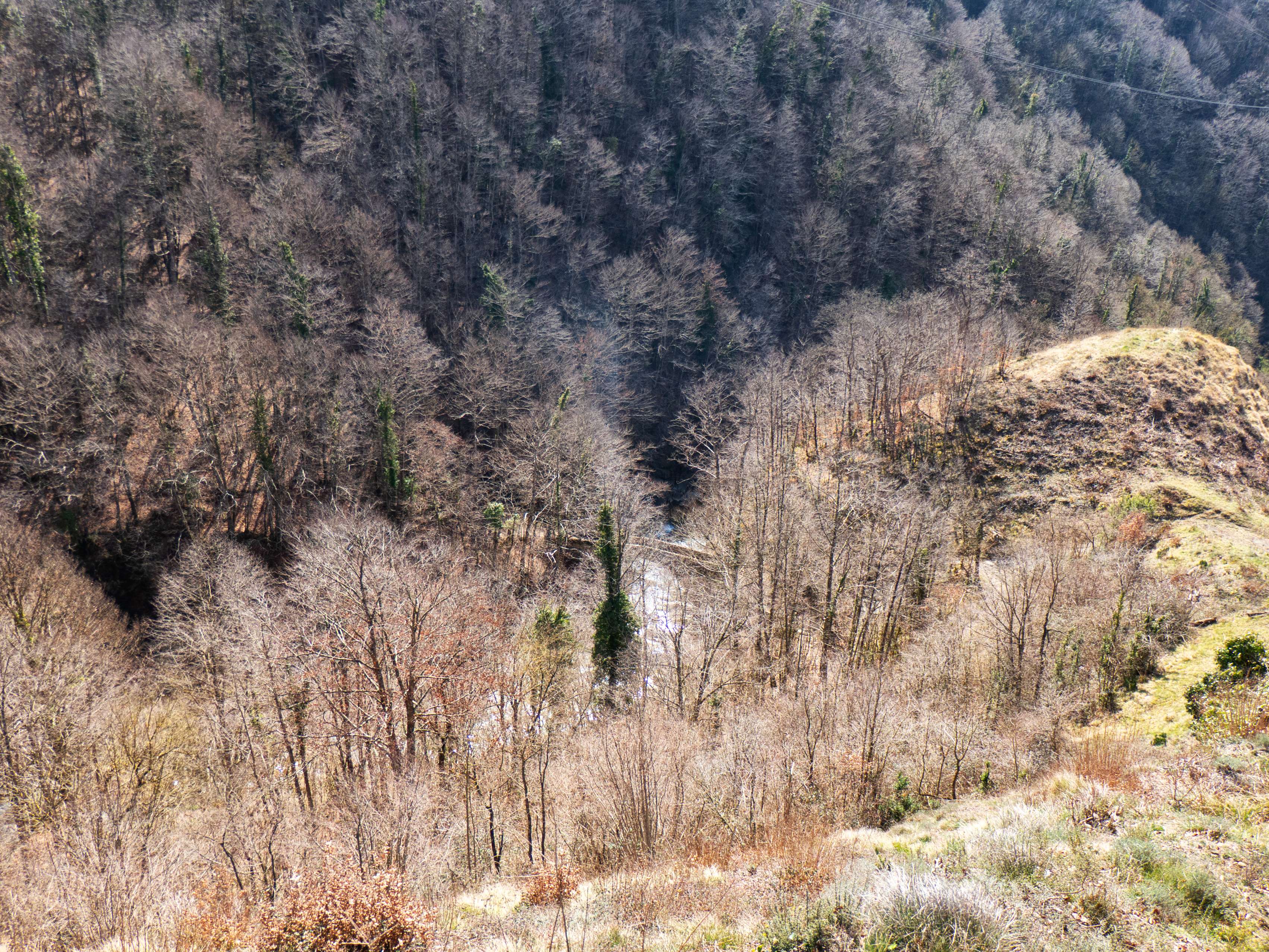 Convirtiéndose en sendero, el sendero alcanza un promontorio elevado sobre el Ges, desde donde divisamos el Pont de Salgueda, que utilizaremos para cruzar el río, entre las peladas hayas.