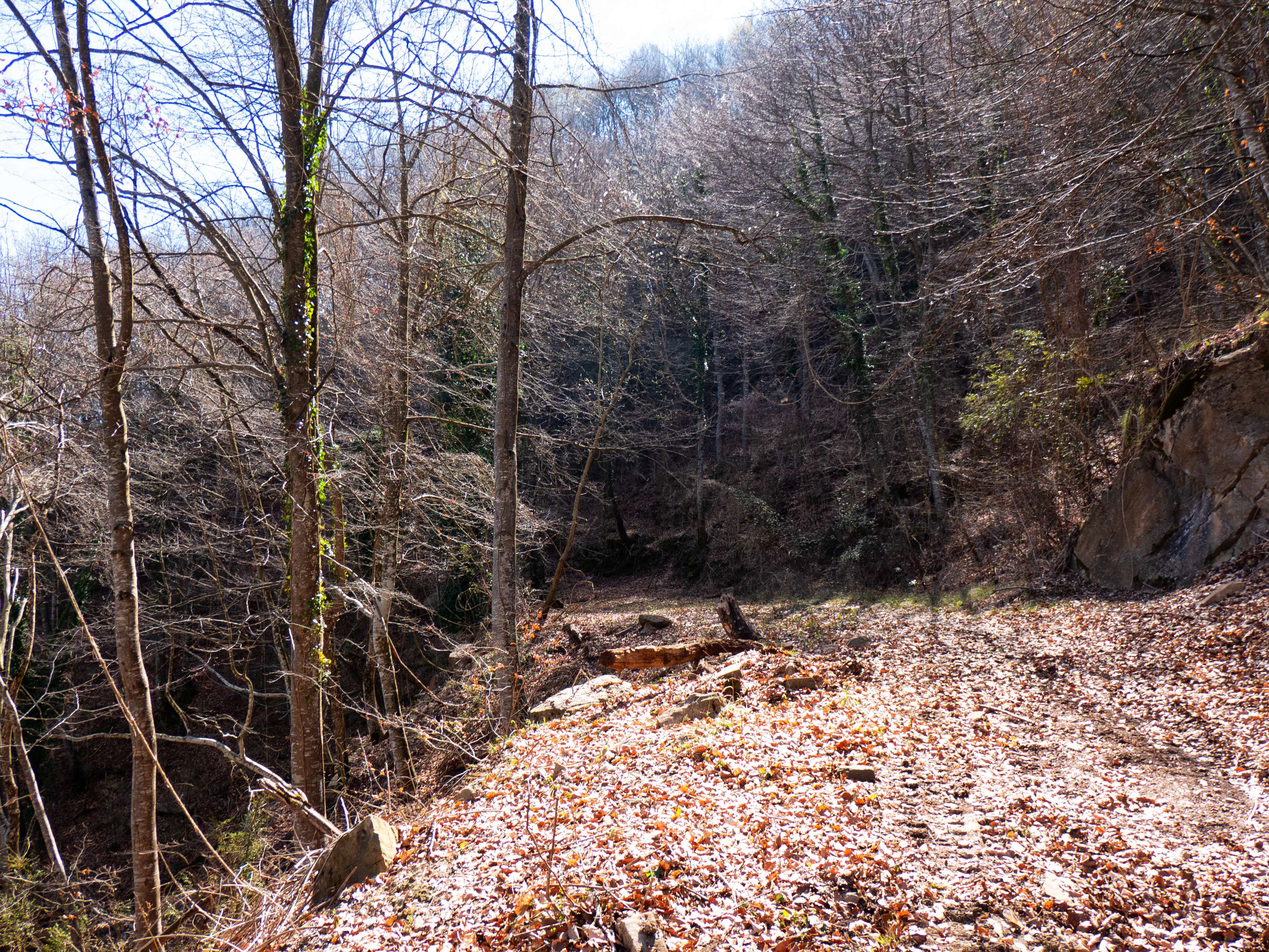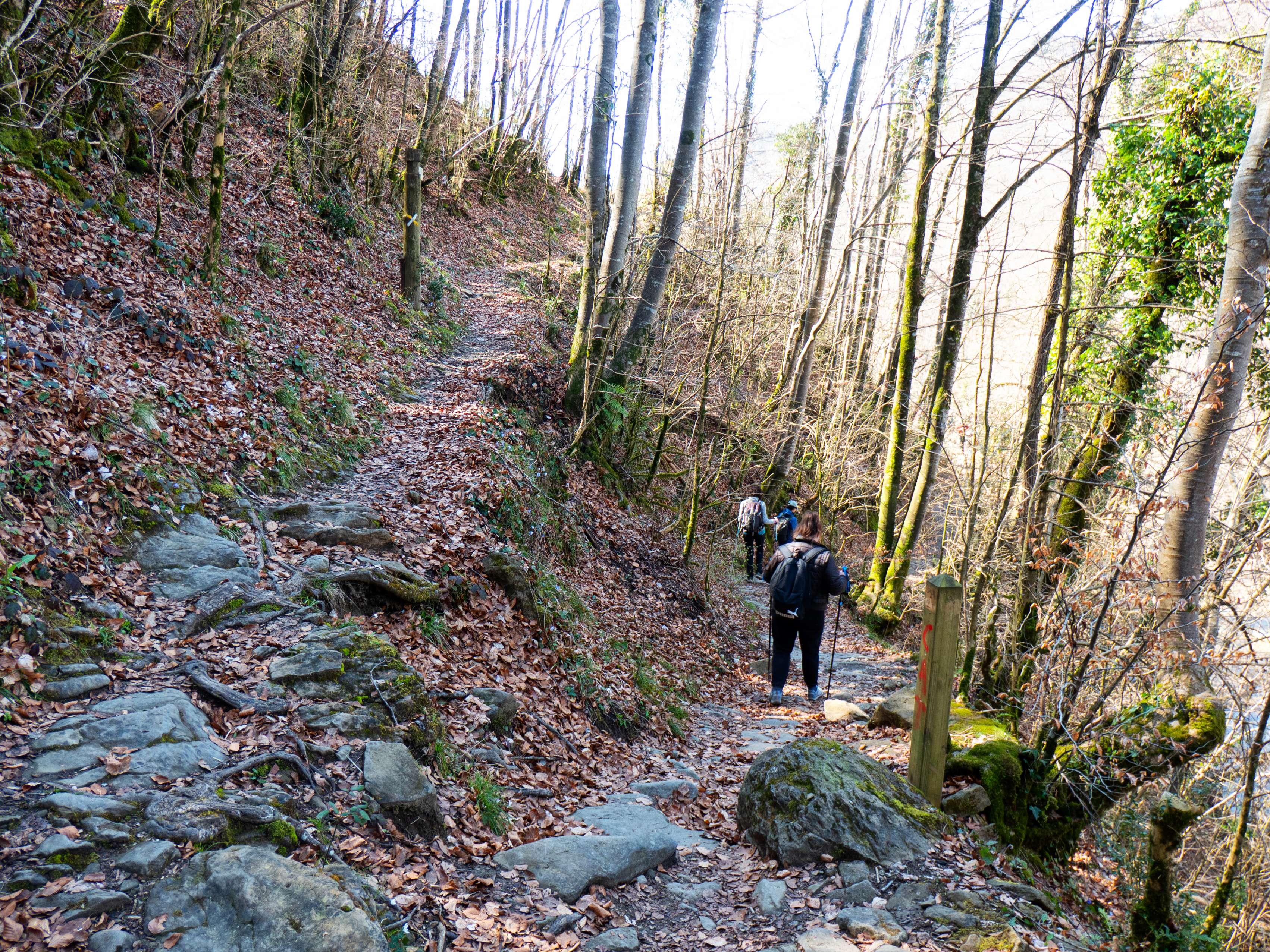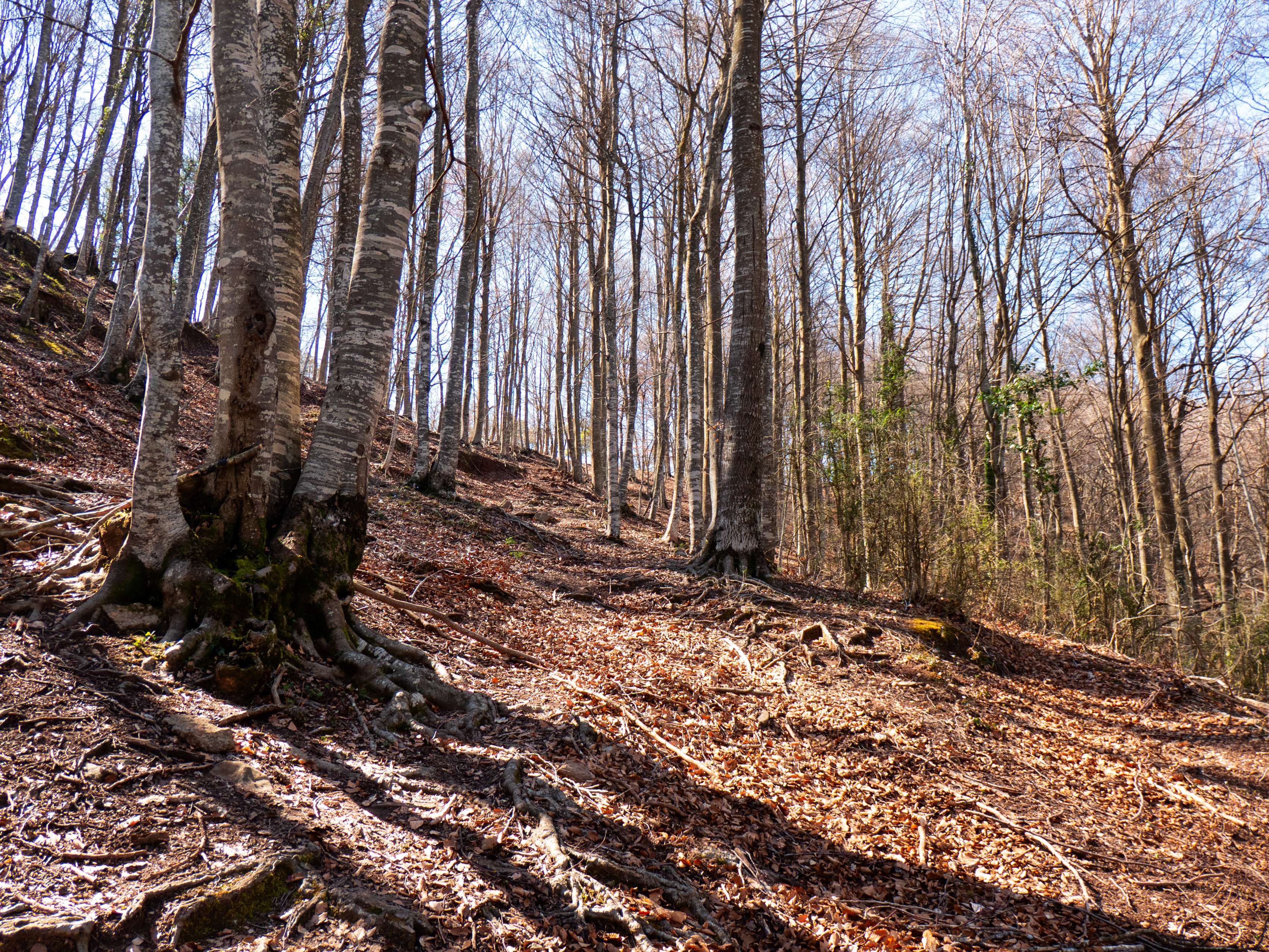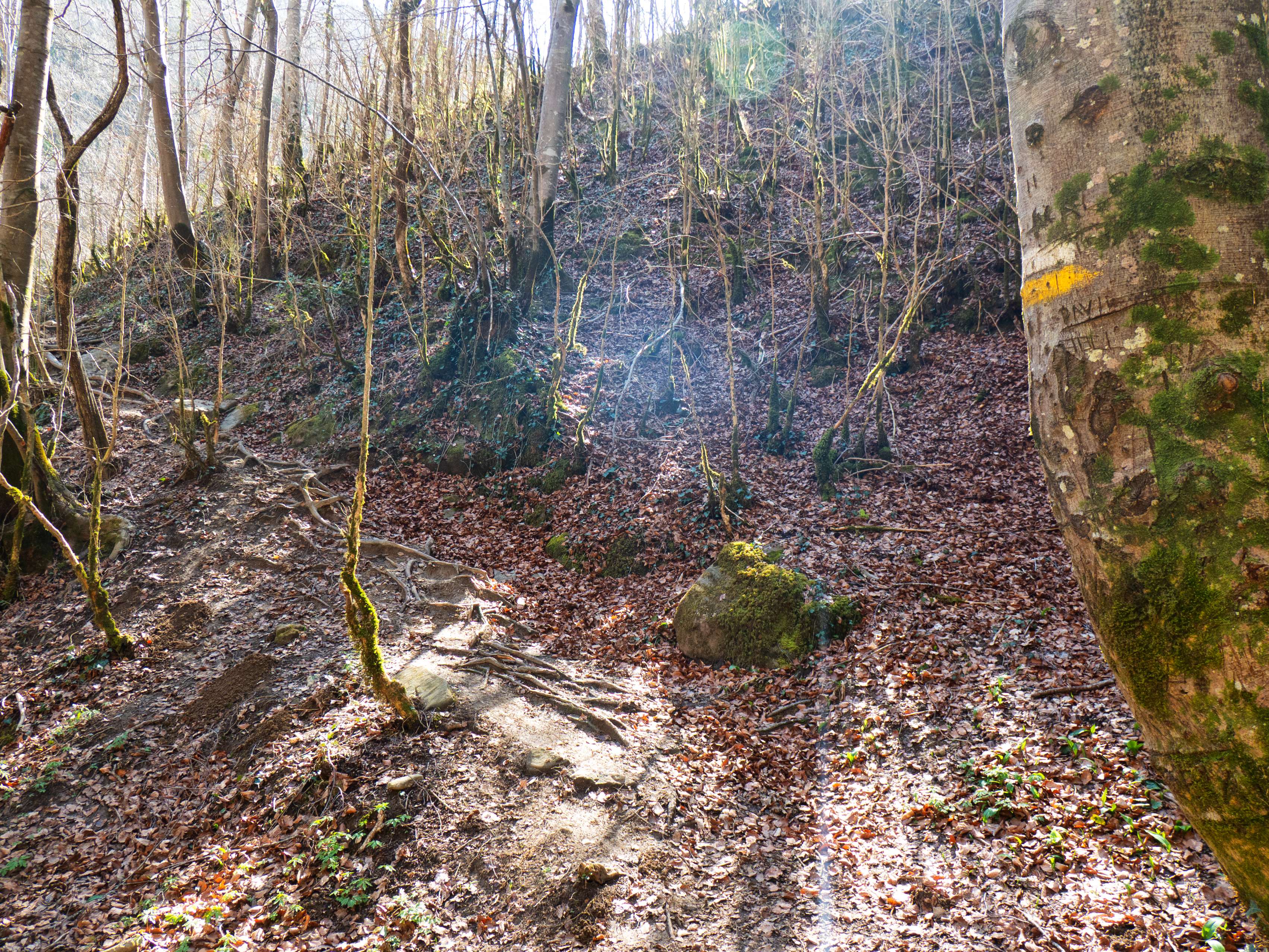 El camino recorre ahora un espolón de la Baga de la Vall, hoy completamente desnuda de follaje, lo que nos permite contemplar los verticales riscos de la arista oriental de Bellmunt. Andar por hayedos desnudos también tiene su encanto.