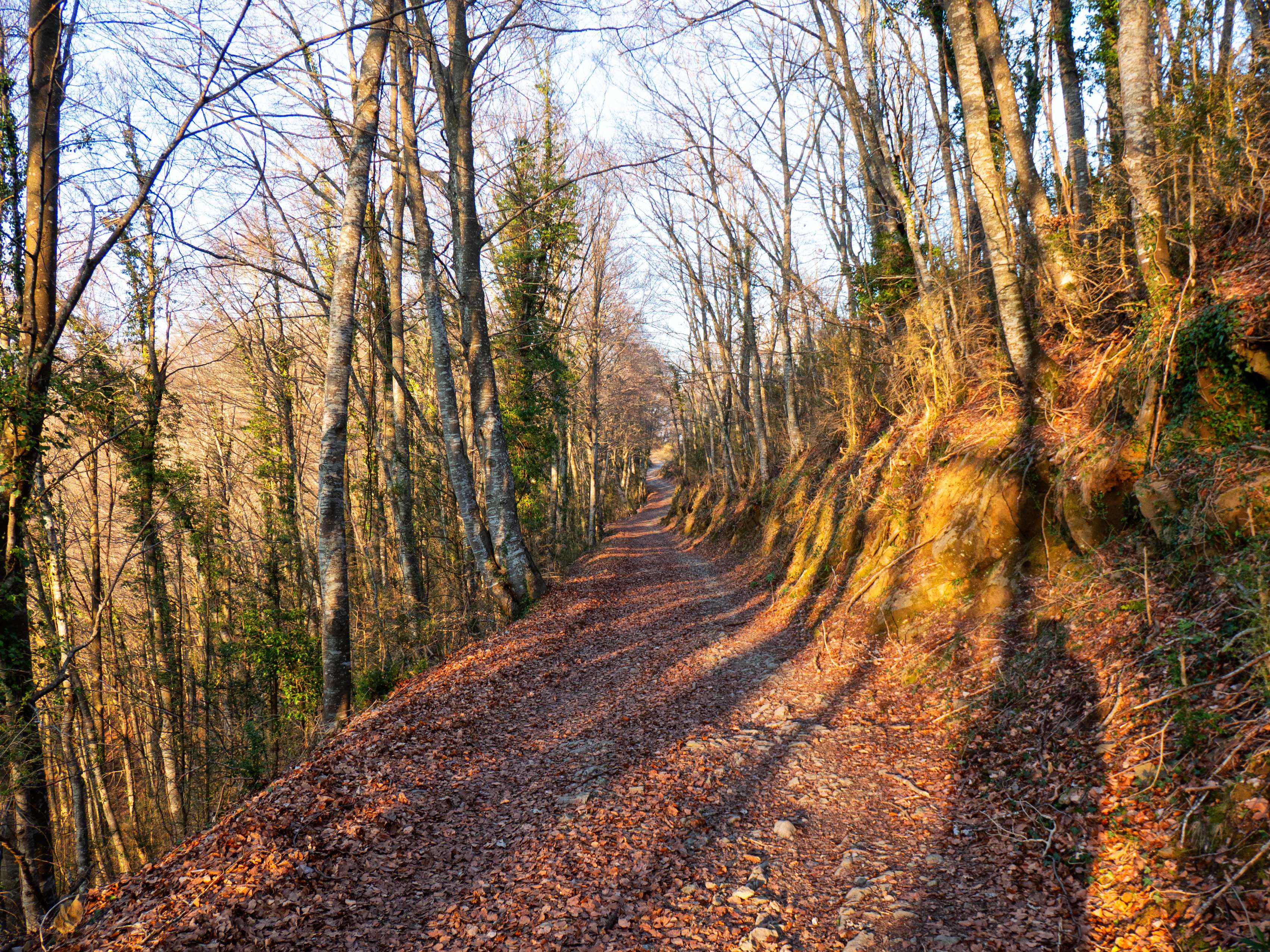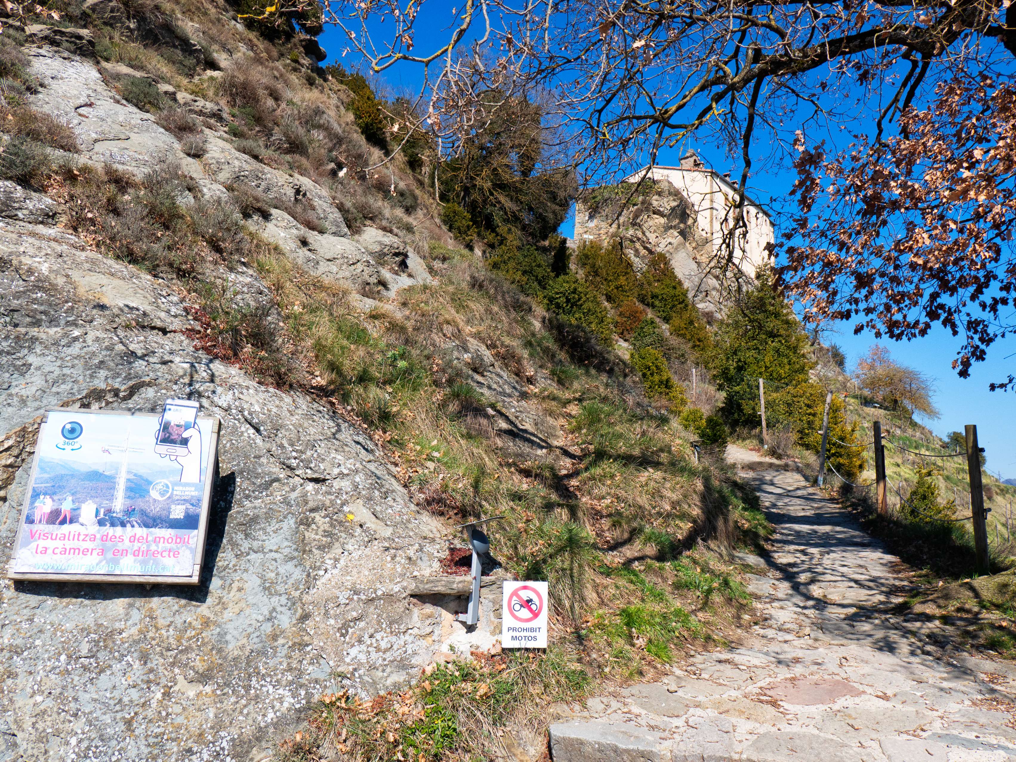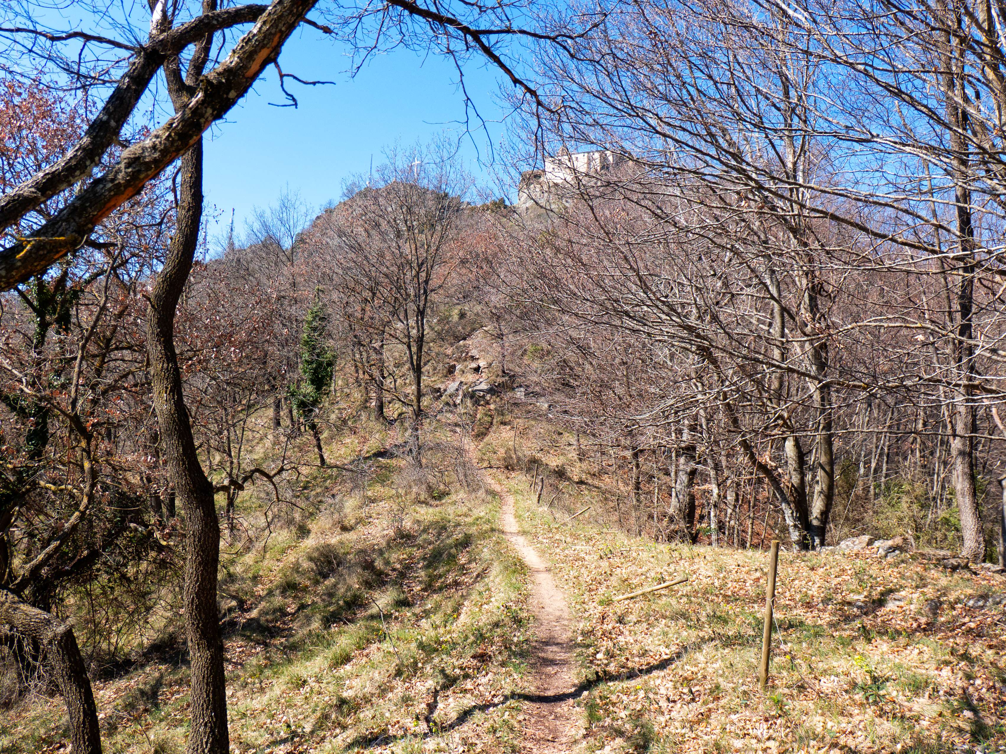 Nuestro itinerario ahora sigue el Serrat dels Cristians Vells, con el pálido santuario y la cruz actuando como faro sobre el esqueleto invernal de los árboles.