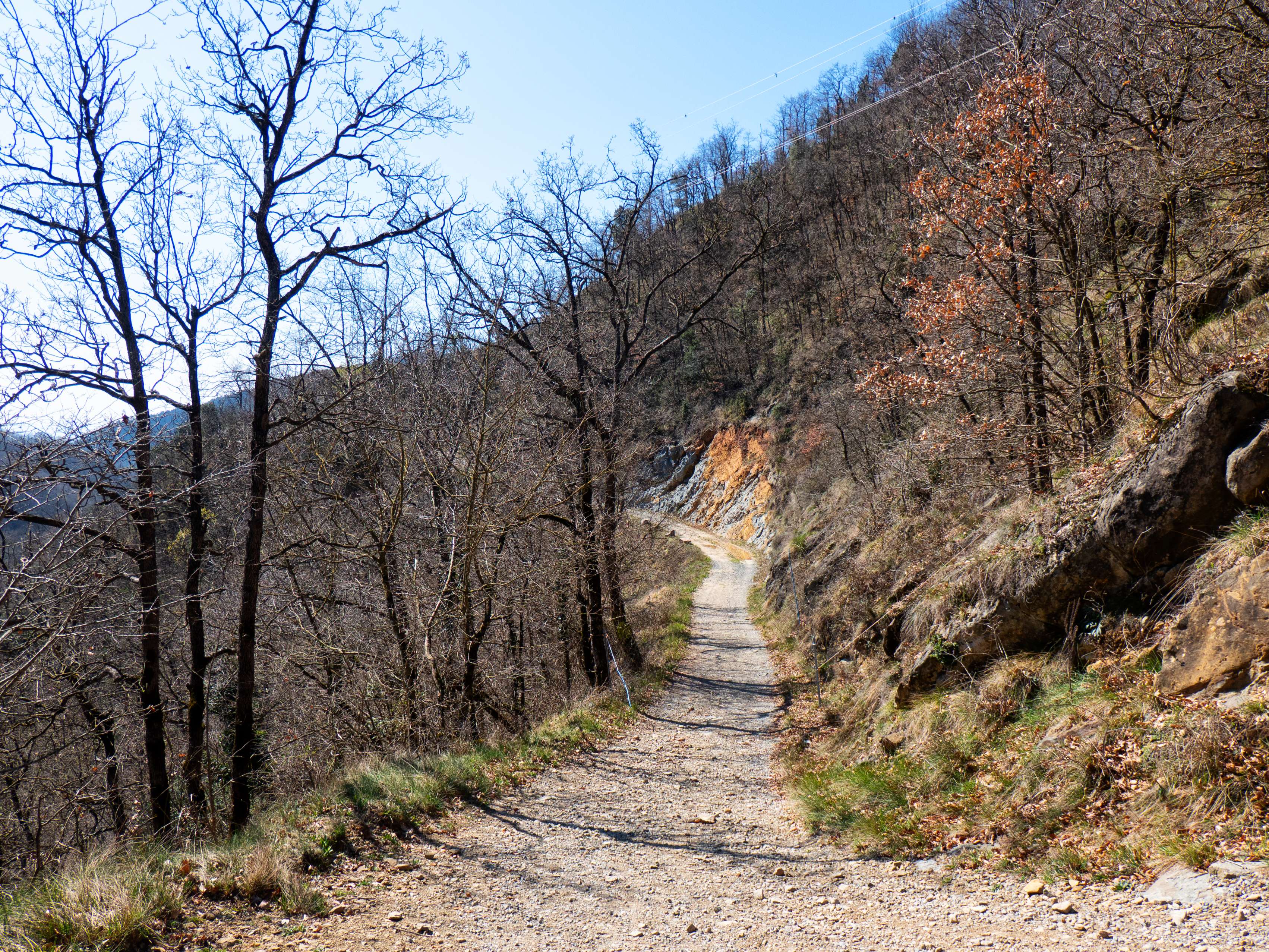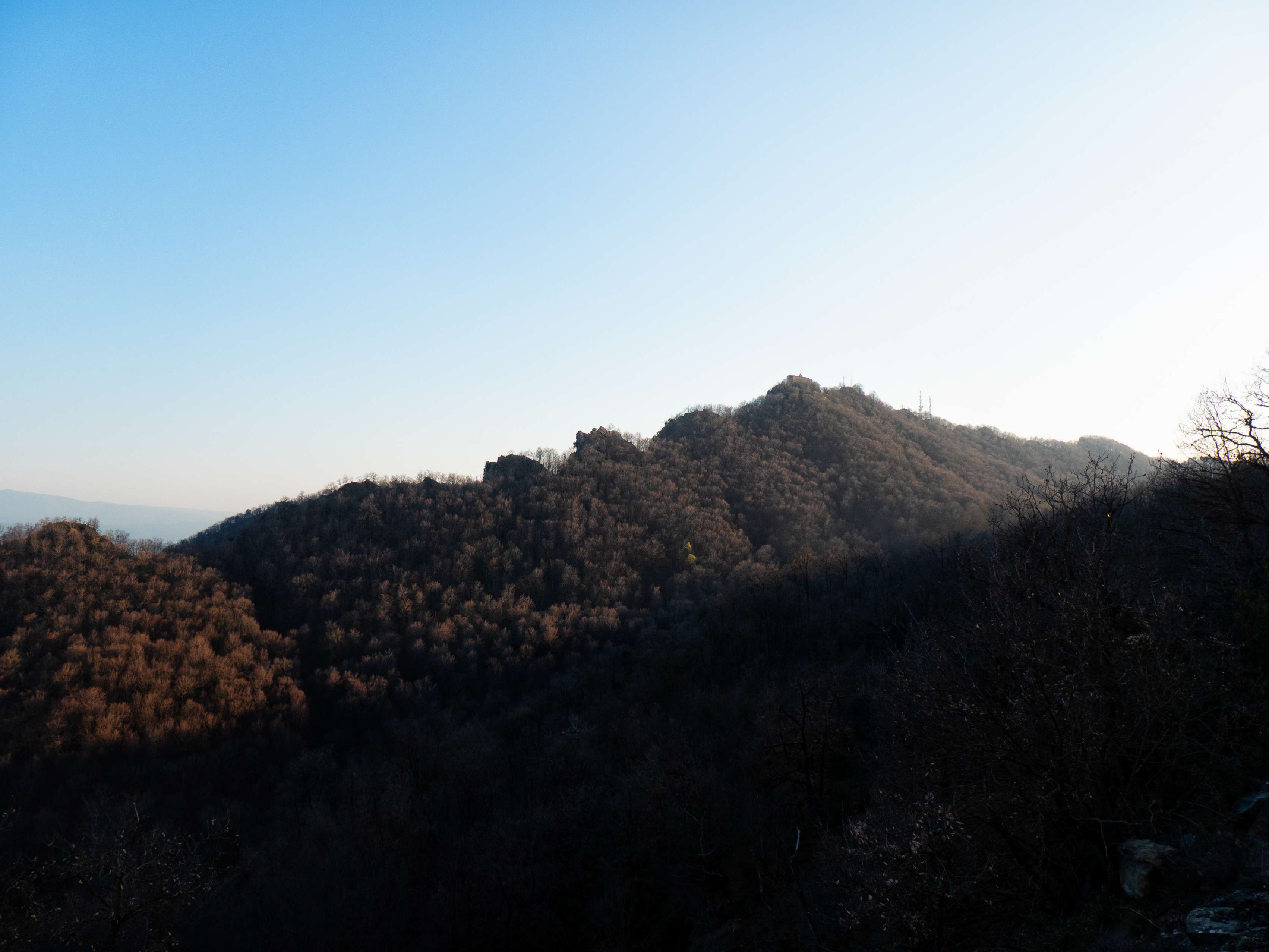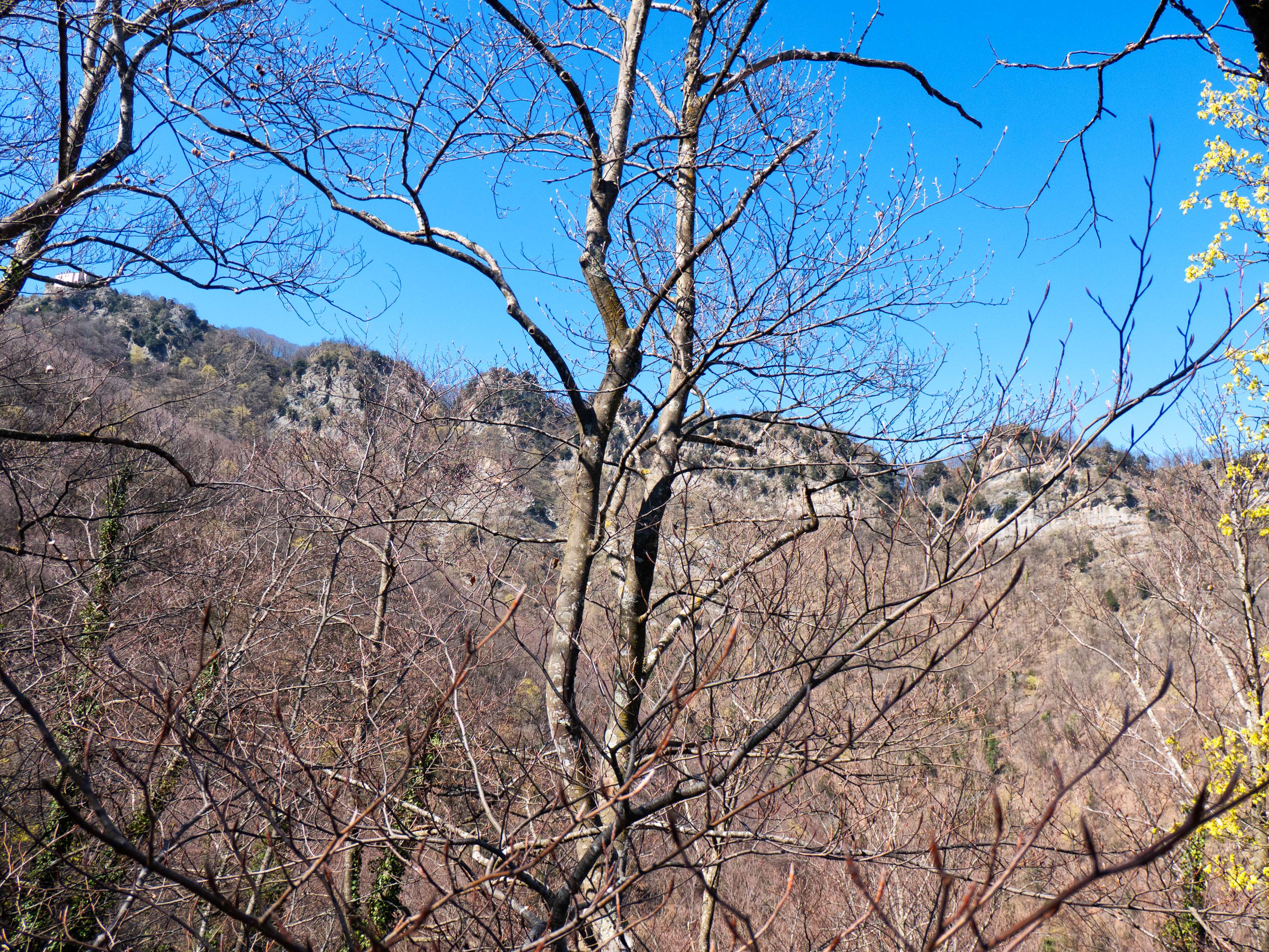 Nuestro itinerario ahora sigue el Serrat dels Cristians Vells, con el pálido santuario y la cruz actuando como faro sobre el esqueleto invernal de los árboles.