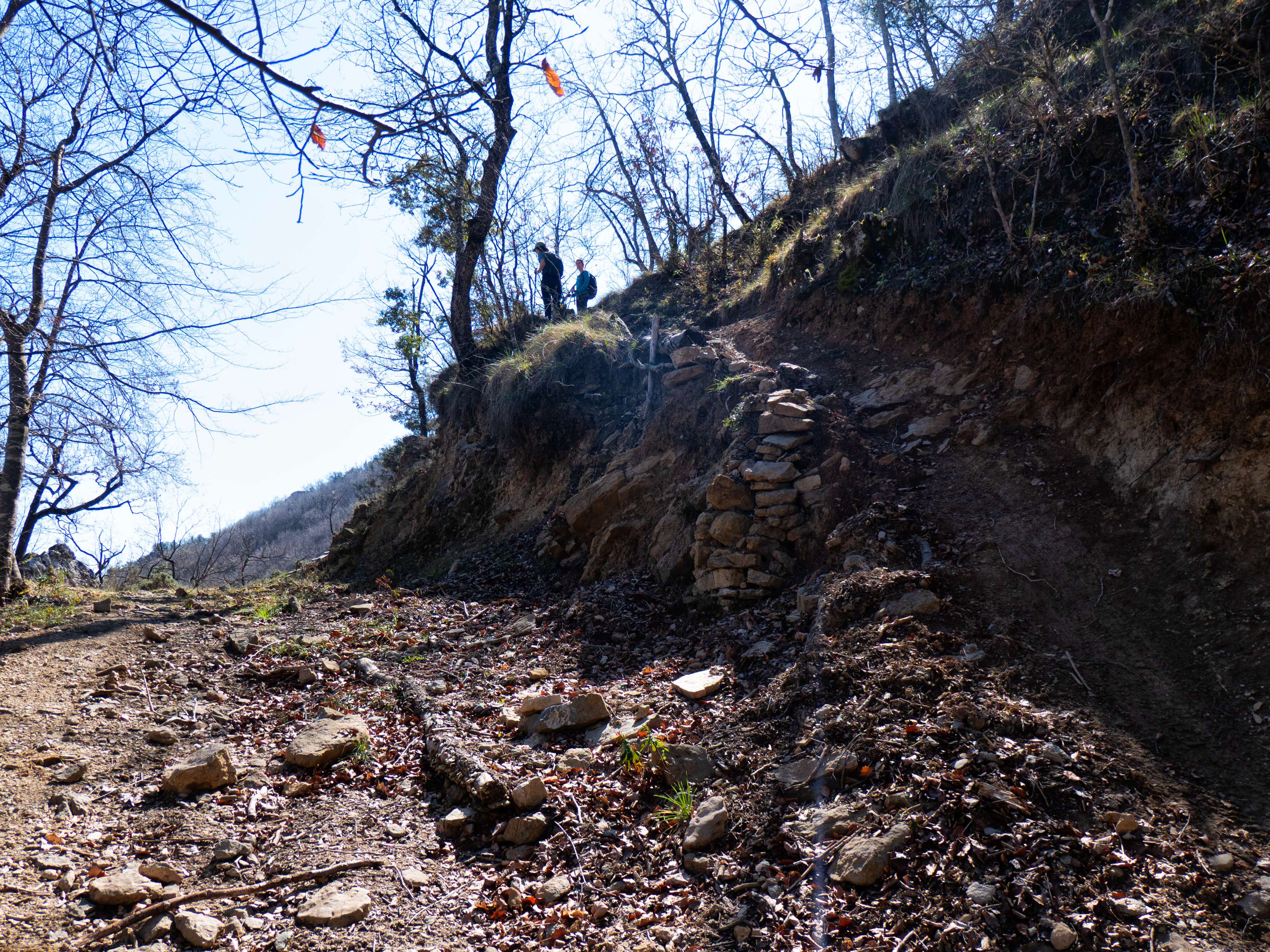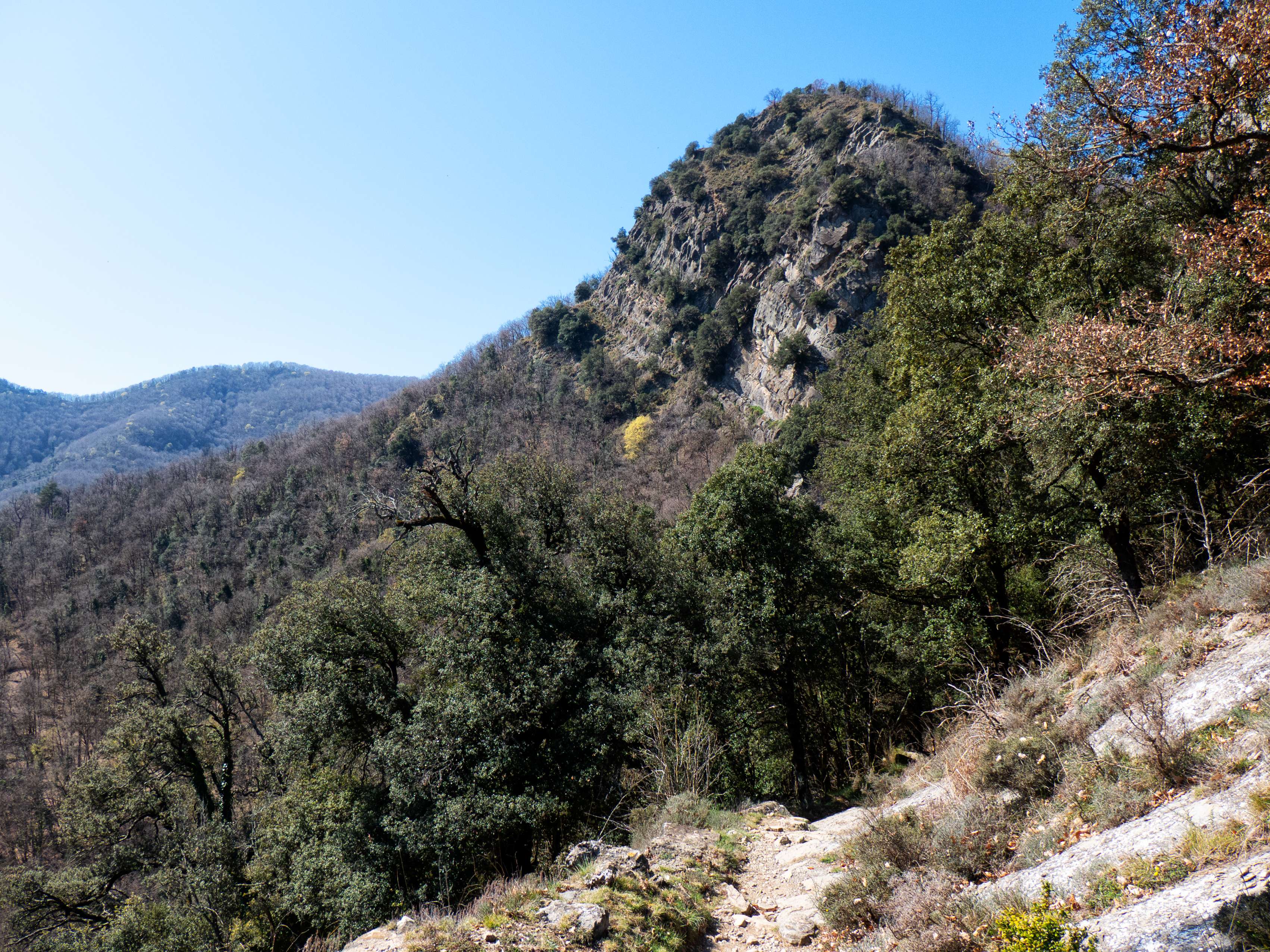 En un momento dado aparecen señales rojas con la indicación de Bellmunt, señalando el lugar donde debemos abandonar la pista para subir por una ladera cubierta de hojas (que probablemente oculten el camino) hasta alcanzar la arista del Serrat dels Cristians Vells, ya visible sobre nuestras cabezas.