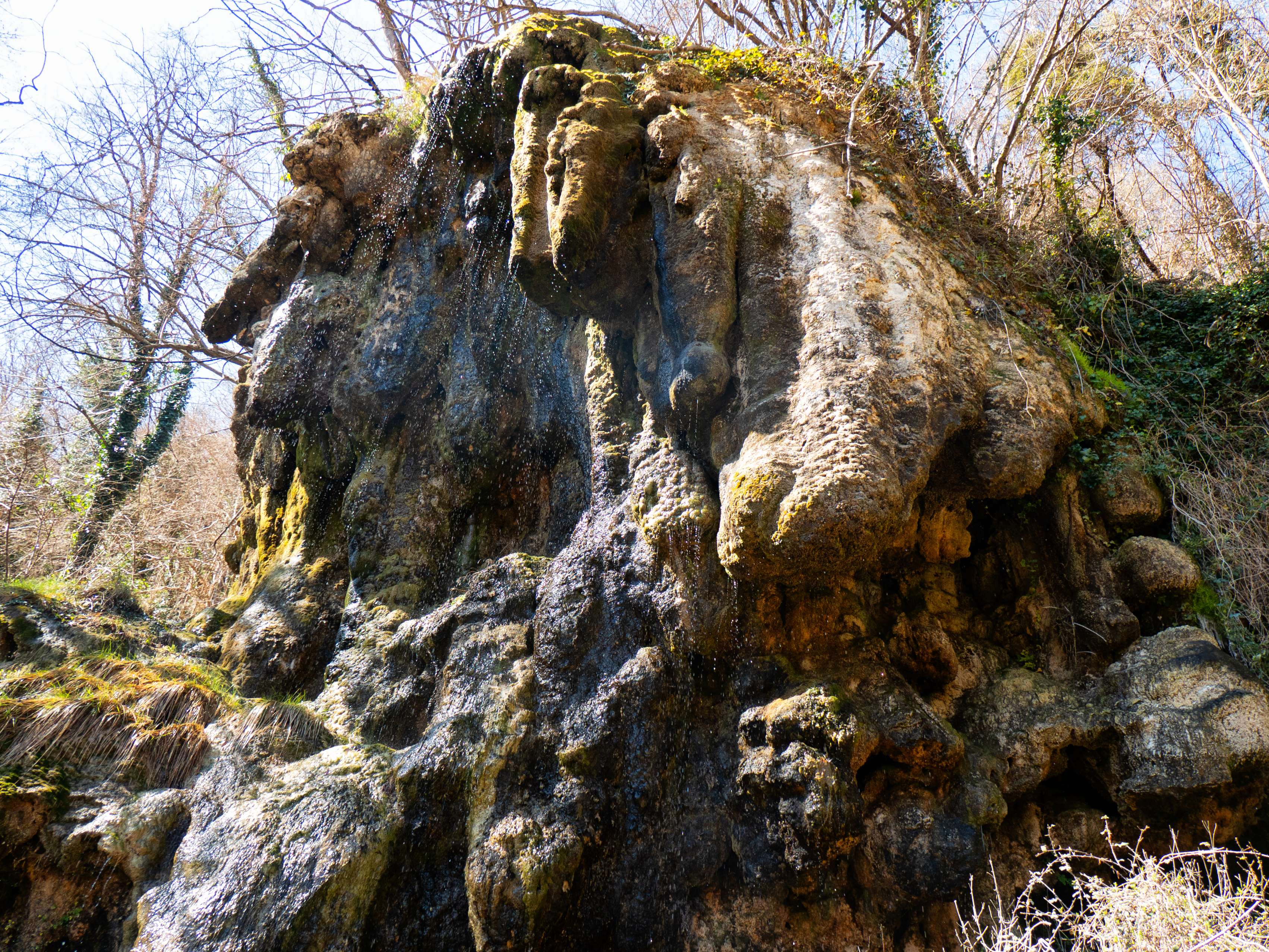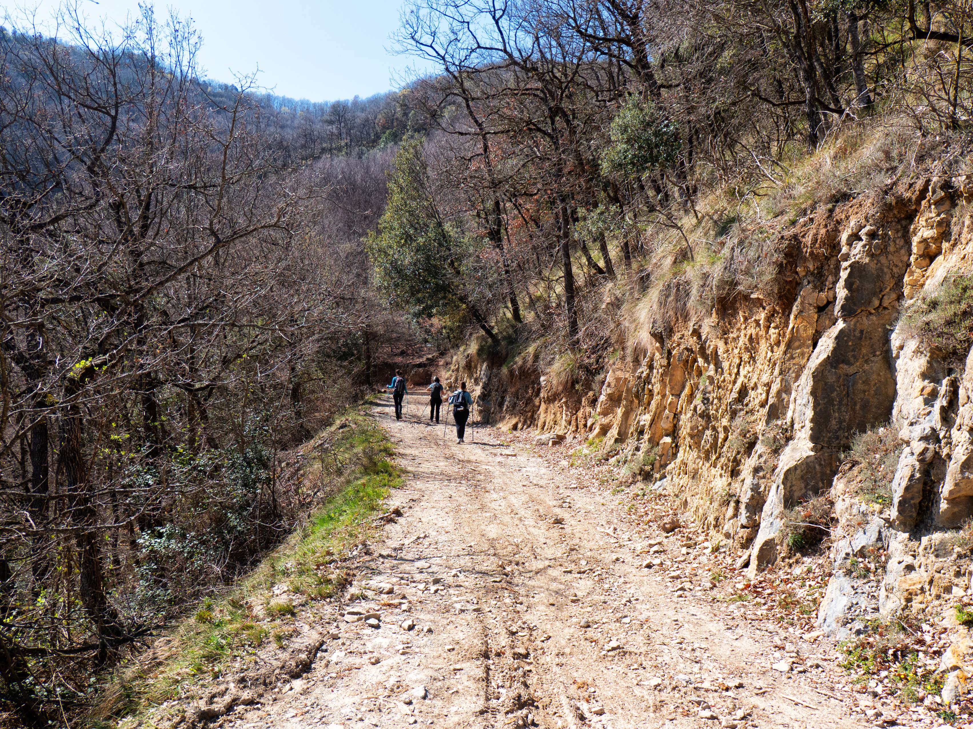 Después de ignorar un desvío que se dirige a Bellmunt por el Torrent de Canemars, pasamos por la curiosa Tosca de Degollats, un roquedo calizo de volúmenes abultados y estalactitas redondeadas, por las que se deslizan cortinas de agua. Los constantes depósitos carbonatos de calcio por parte de las gotas de agua son precisamente los que han formado esta curiosa formación geológica.
