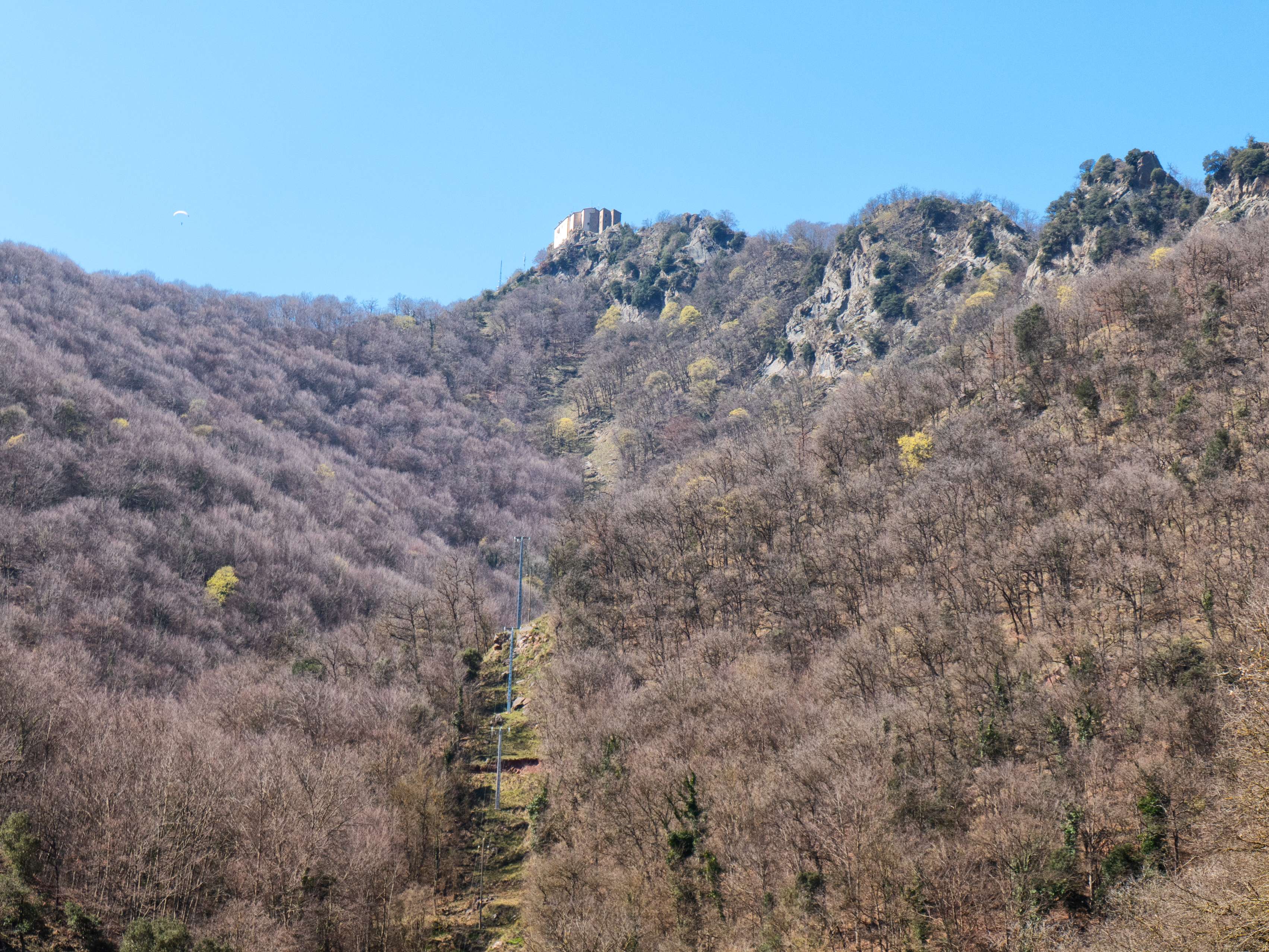 ...se alza ya nuestro objetivo: el Santuari de Bellmunt, colgado sobre los riscos de la arista principal. Nos separan aún unos 450 metros de desnivel.