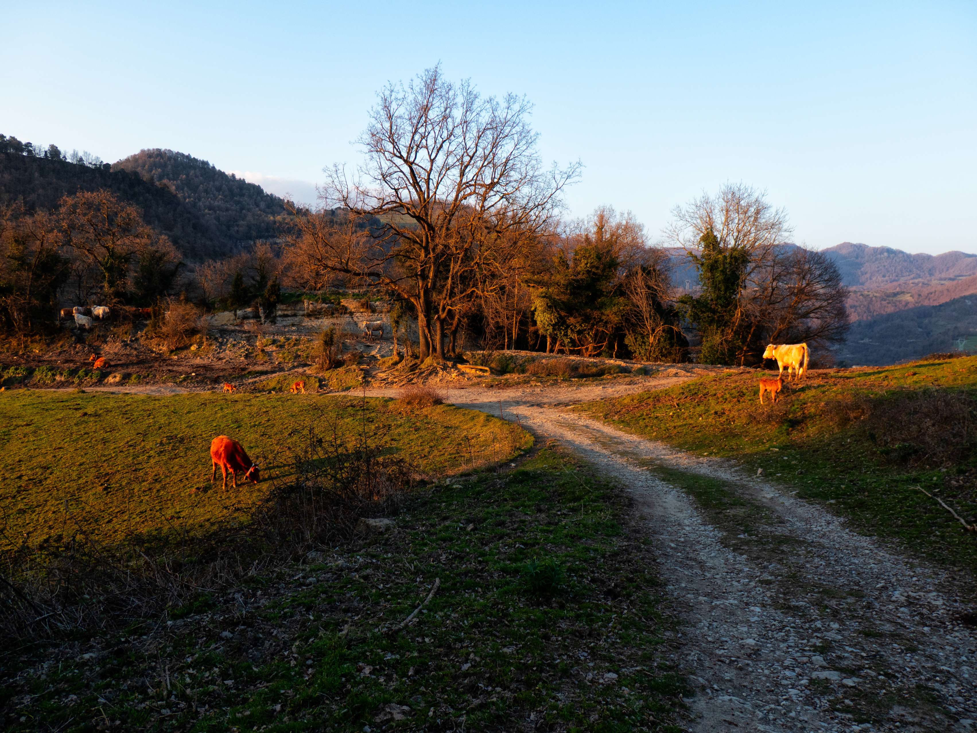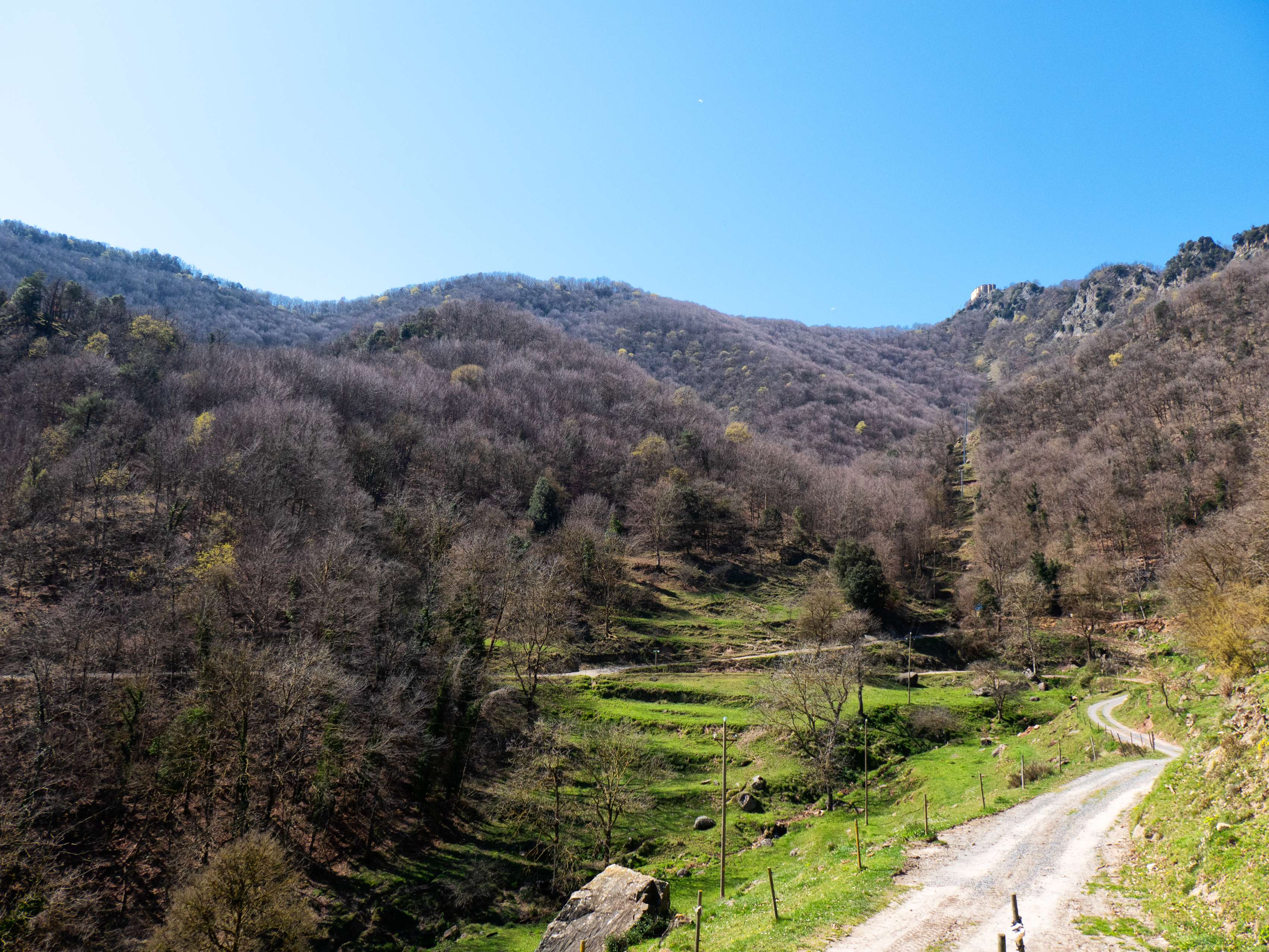 En la curva de la pista posterior a la masía de la Vall finaliza la larga bajada iniciada en Vidrà, retomando el ascenso por un erosionado camino que se dirige a una granja cercana.