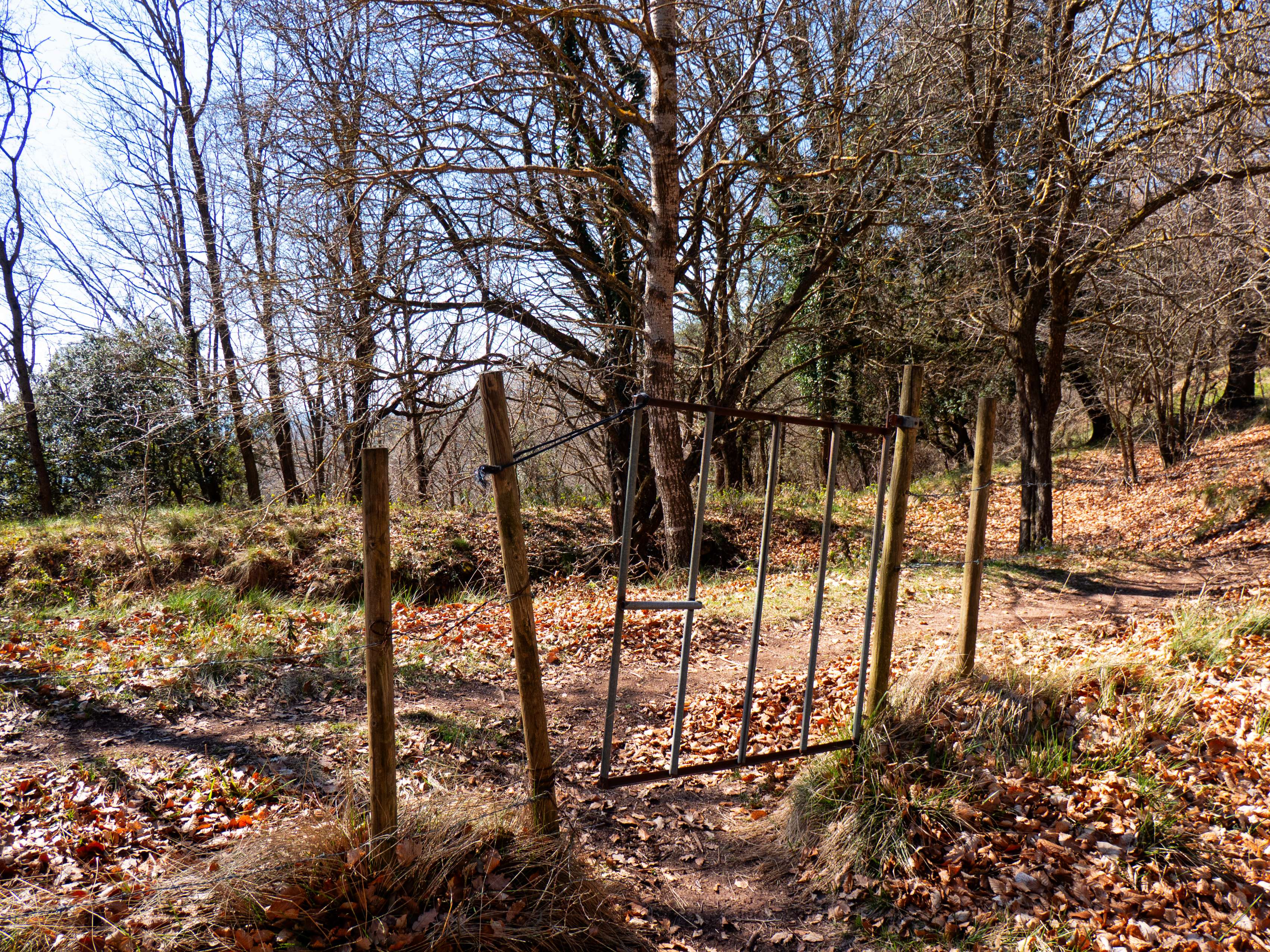 Tras unos 70 metros de subida, llegamos a la arista, dividida poruna valla para el ganado. Afortunadamente, encontramos una puerta que permite cruzarla y acceder al buen camino que la recorre por el otro lado.