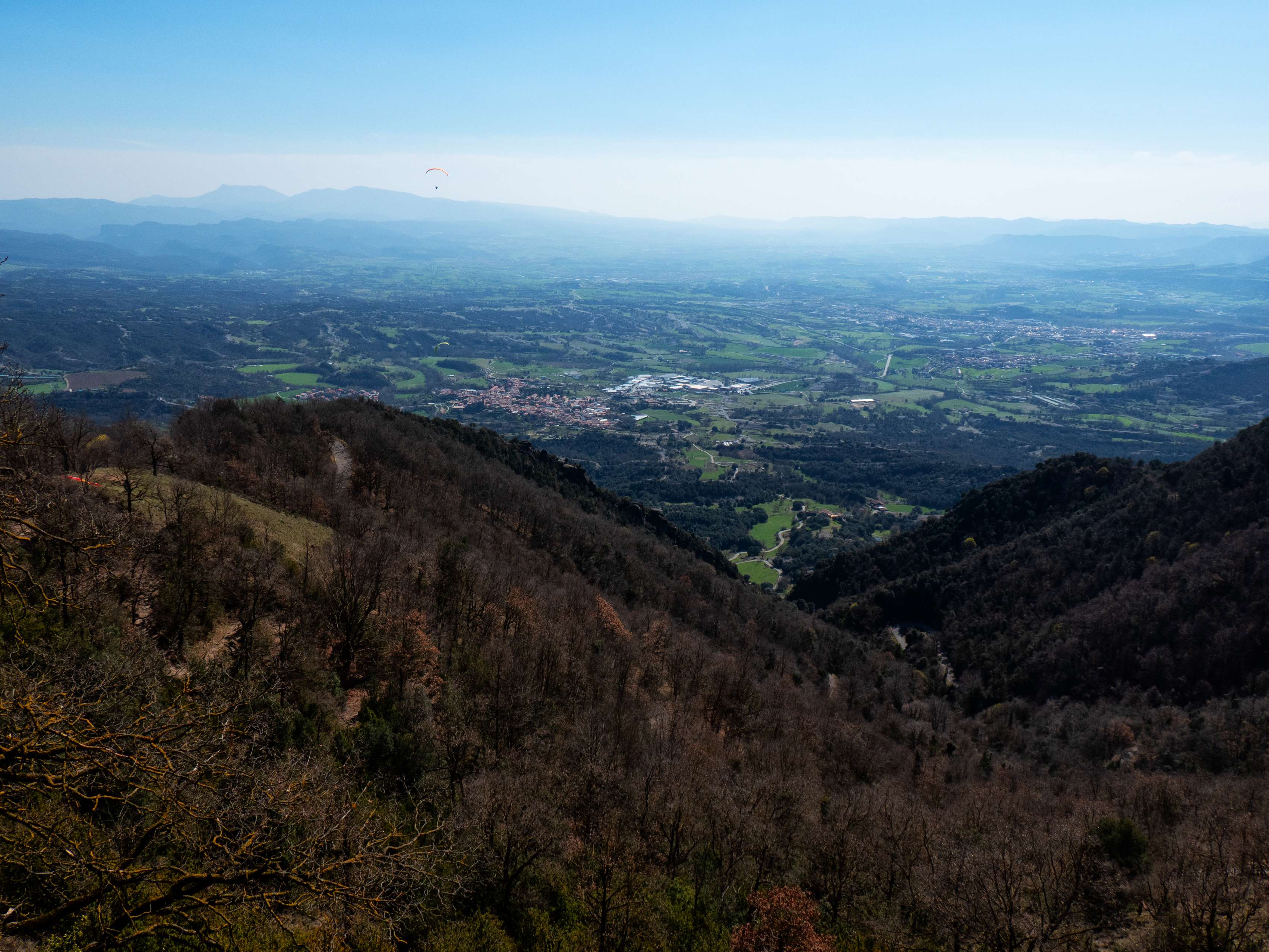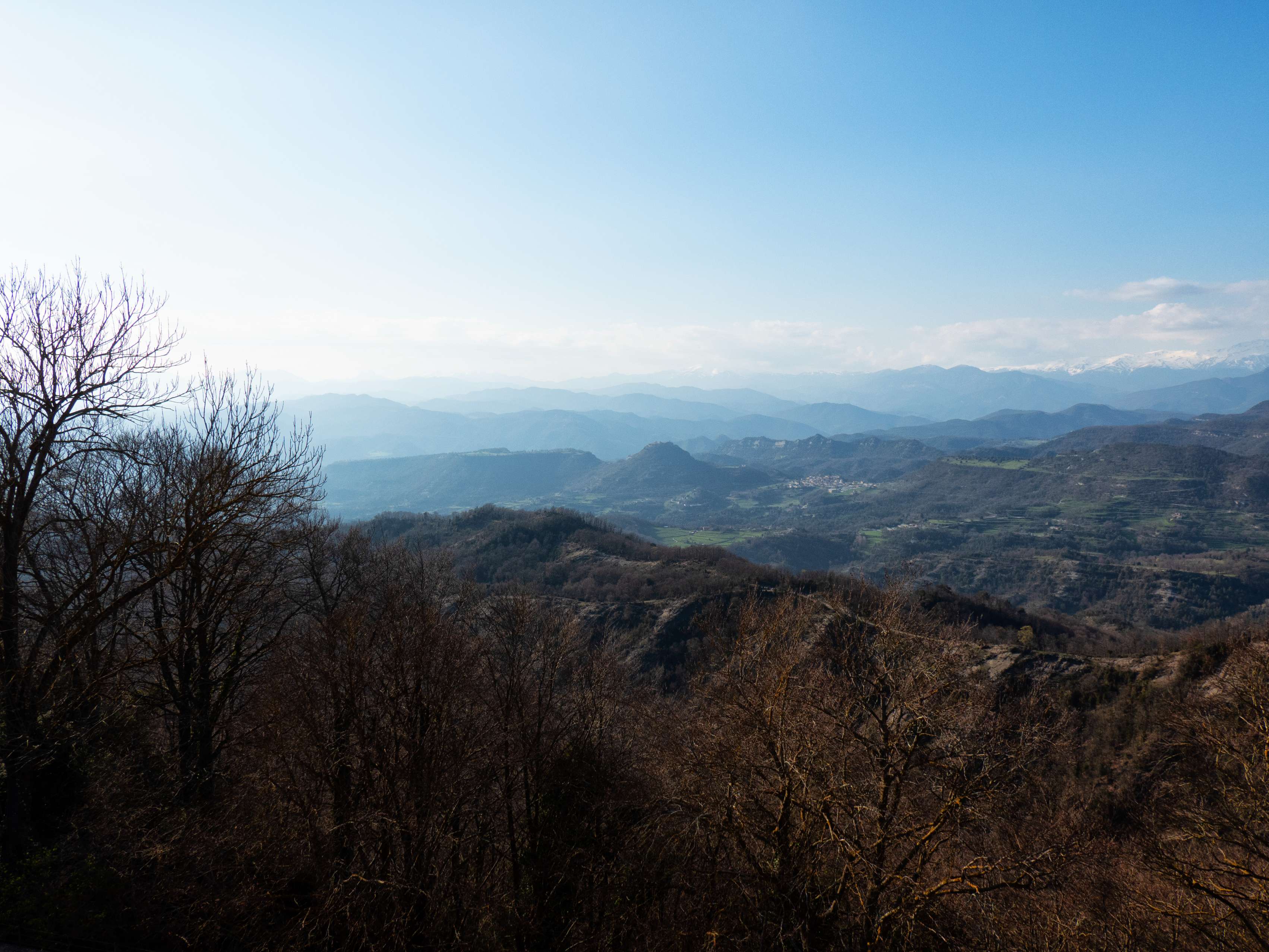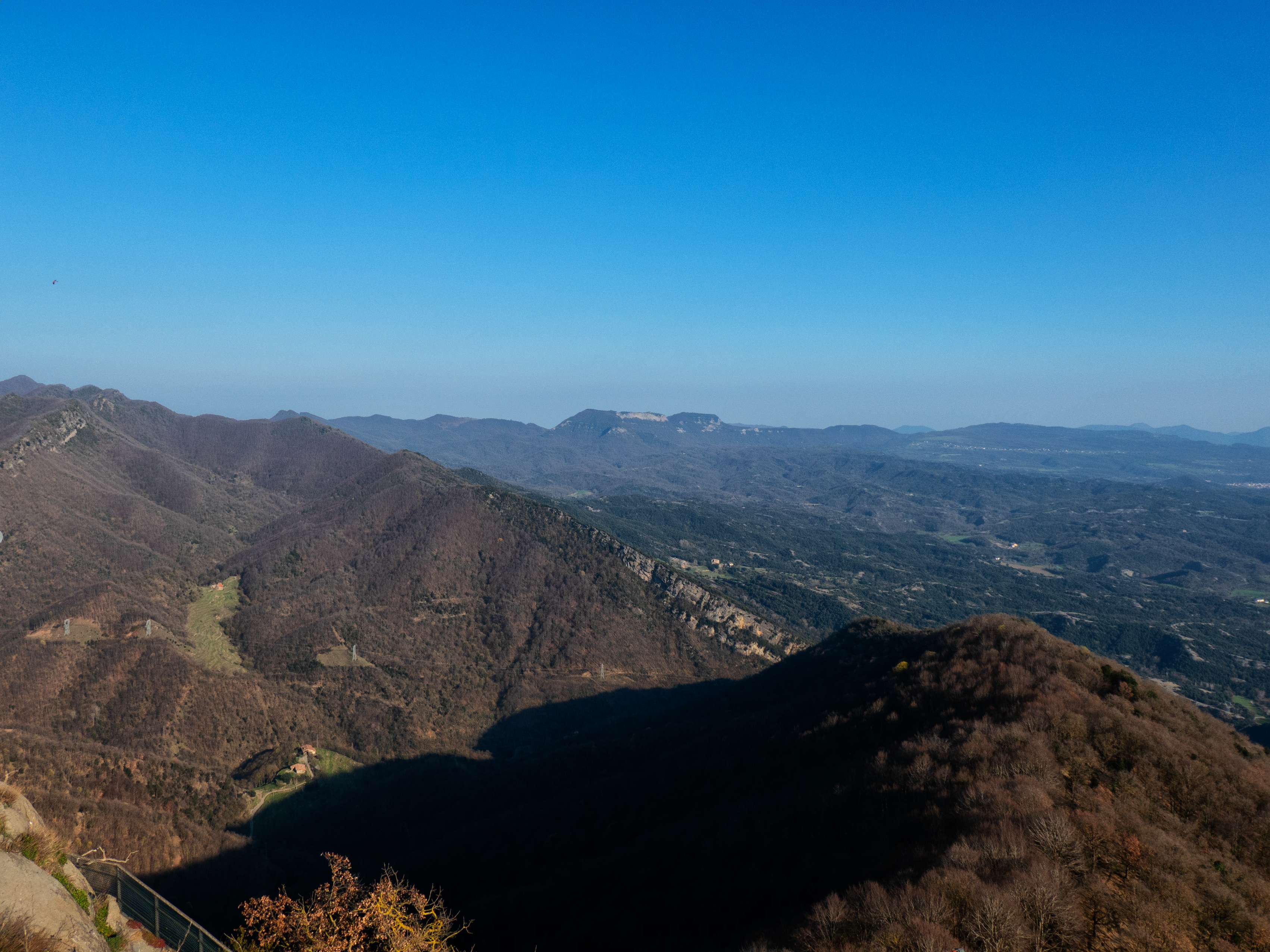 Mientras ganamos altura, se abre por fin el panorama hacia el sur, hasta ahora oculto por la propia mole de Bellmunt A nuestros pies se extiende la Plana de Vic, en cuyo extremo septentrional nos encontramos, y cuyos límites meridionales, los acantilados del Moianés y la silueta del Montseny, adivinamos entre la bruma.