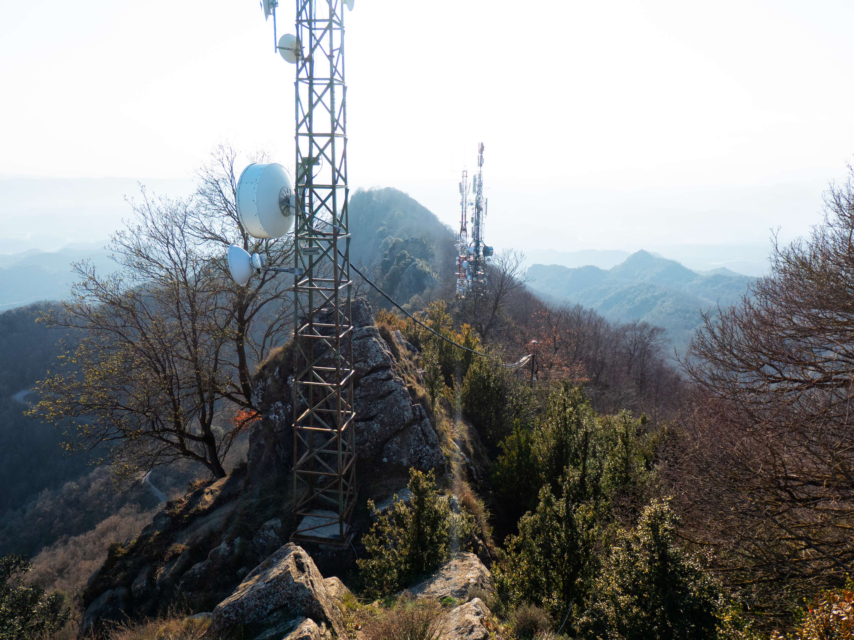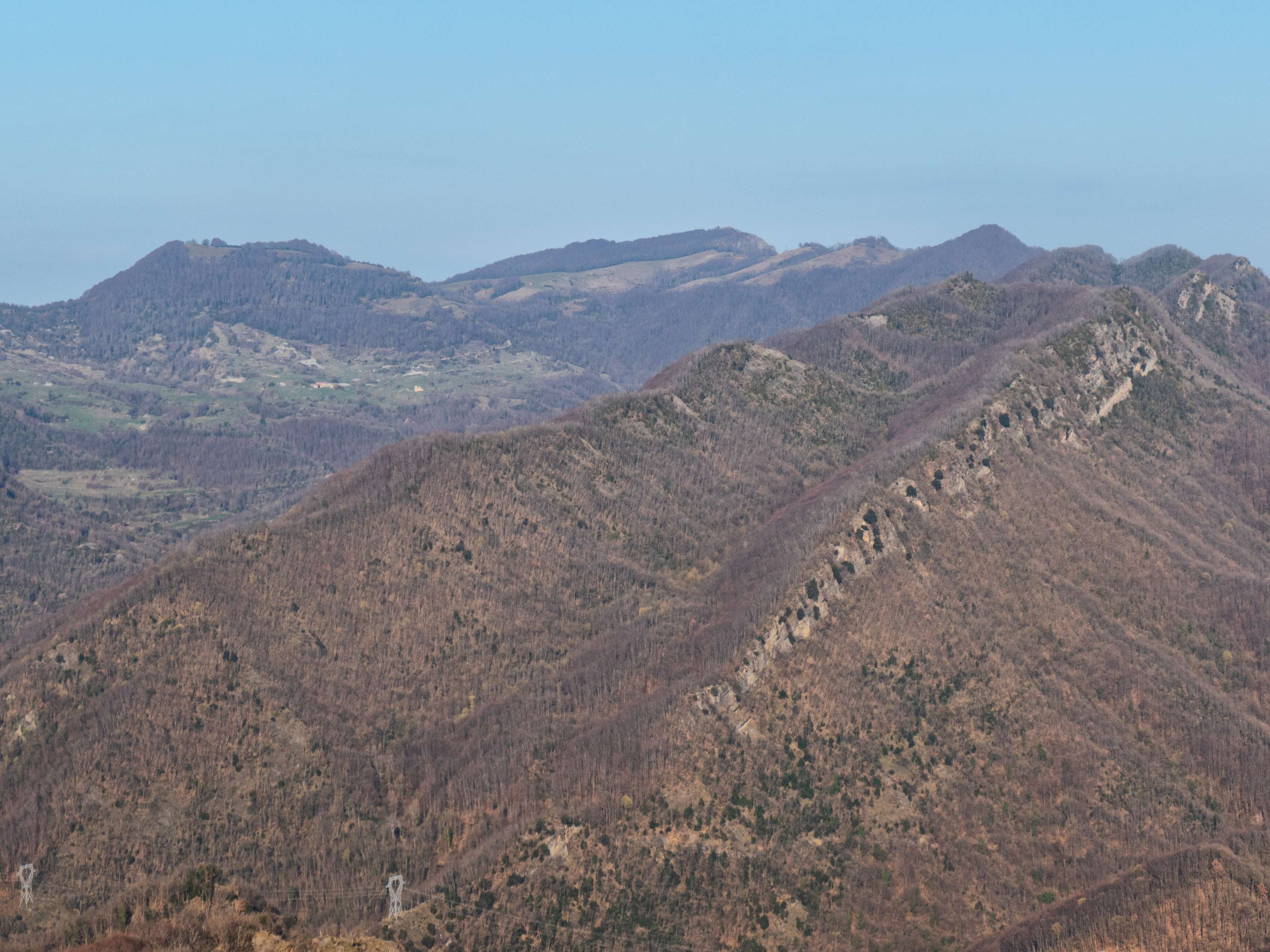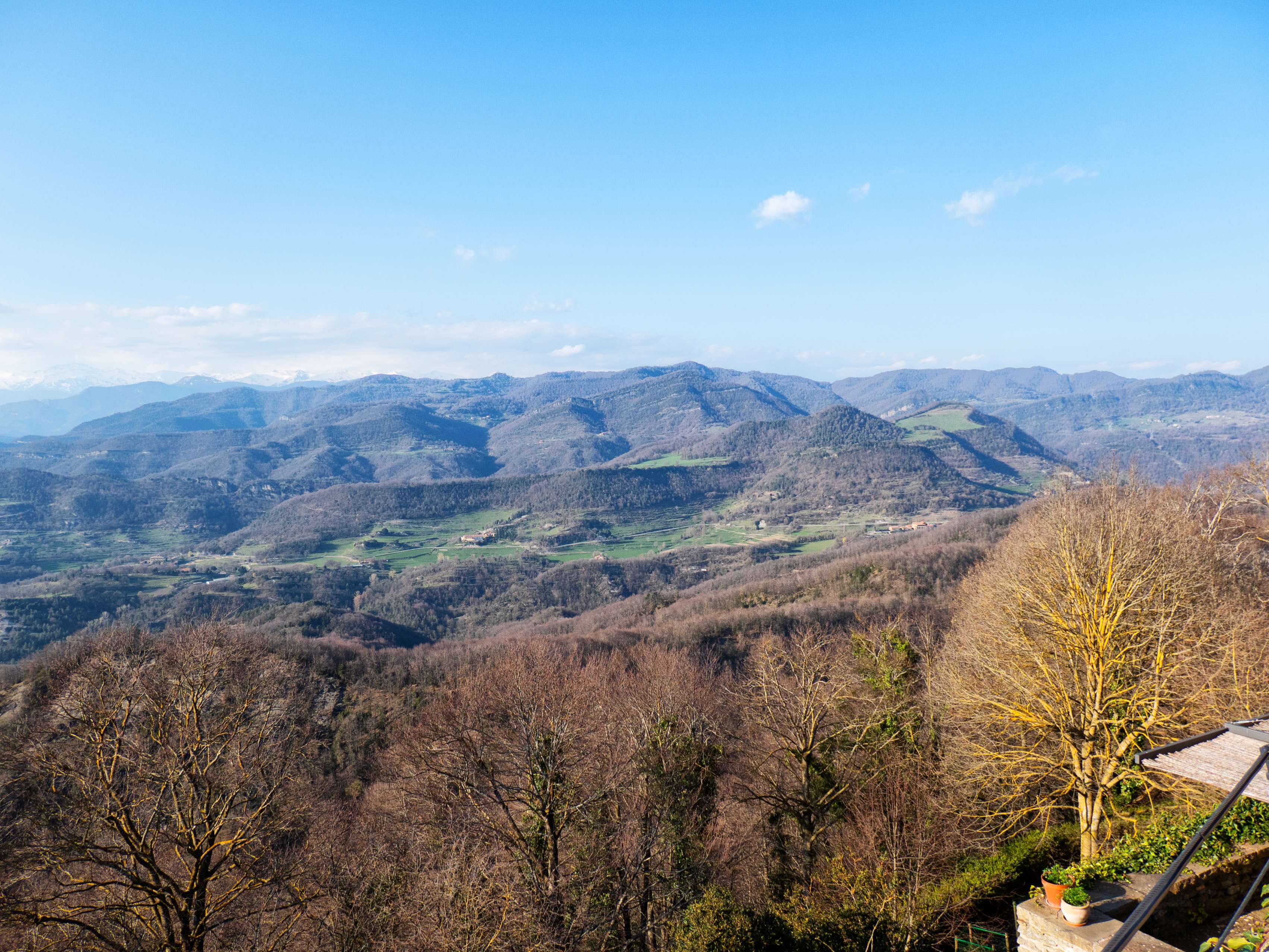 Retirando el zoom, el arco meridional se ve casi enteramente ocupado por las cimas mayores de este boscoso macizo de Santa Magdalena, del que distinguimos sus tres cimas principales (dejando aparte el Puigsacalm): el Milany, el Puig de l'Obiol y, a la derecha del collado de la Creu de l'Espinal, la cima principal del macizo y de toda la región, Santa Magdalena de Cambrils.