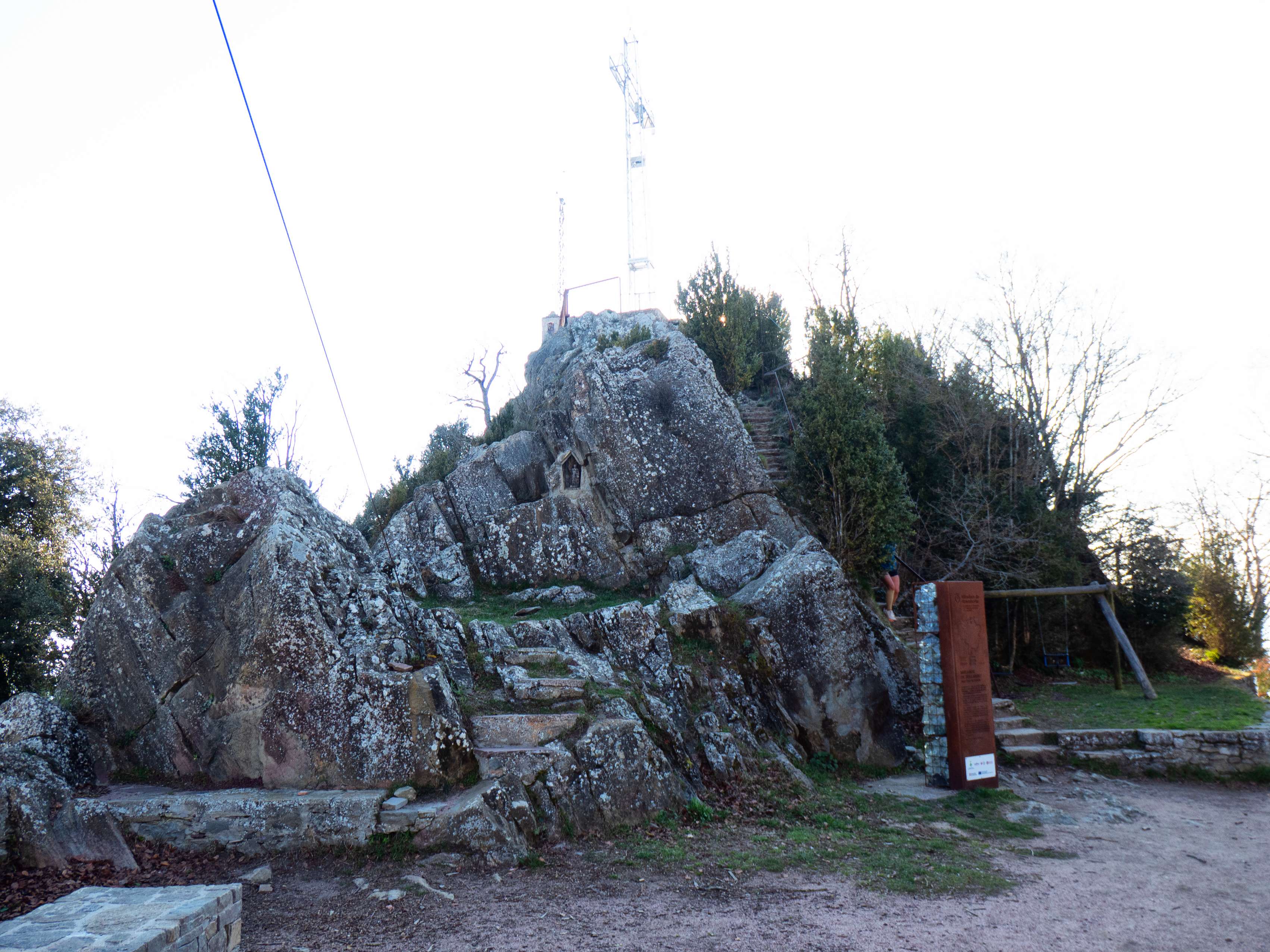 ...el collado entre la doble cima de Bellmunt. Porque, aunque muchos puedan pensar lo contrario, la cumbre principal no es el risco donde se alza el santuario, sino el situado inmediatamente al oeste, donde hay la cruz y una antena. Así pues, nos disponemos a ascender la escalinata que salva los últimos 15 metros de desnivel que nos quedan para...