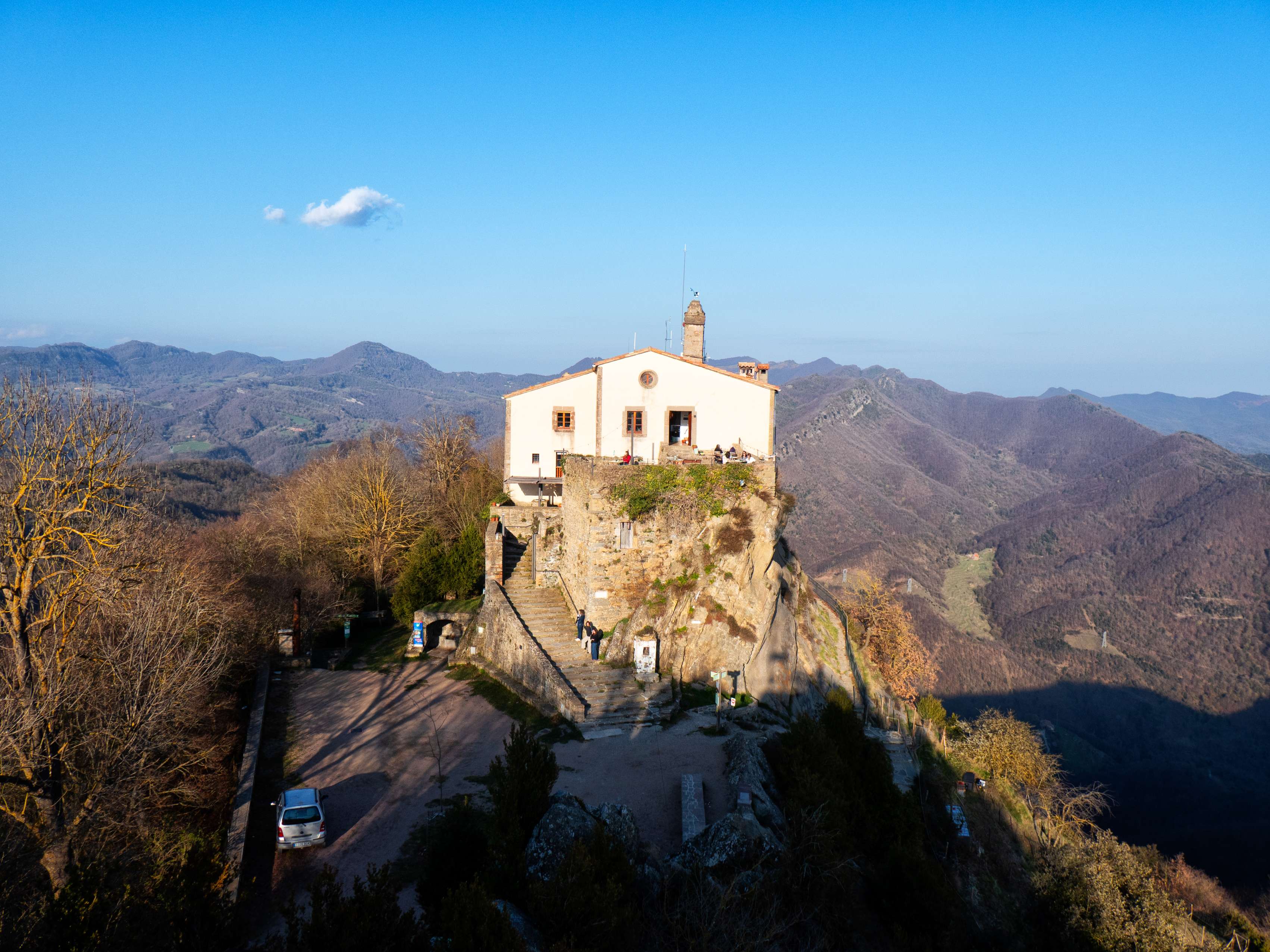...culminar la Serra de Bellmunt, desde donde se obtiene la imagen más icónica de toda la sierra y, me atrevería a decir, una de las más reconocibles del nordeste catalán: el Santuari de la Mare de Déu de Bellmunt "suspendido en el cielo", rodeado del resto de montañas de la Cordillera Transversal. El edificio del santuario alberga también un restaurante (donde preparan buenos arroces) y una hospedería donde se puede dormir, ideal para quienes quieran alargar la experiencia y disfrutar del entorno con más calma.