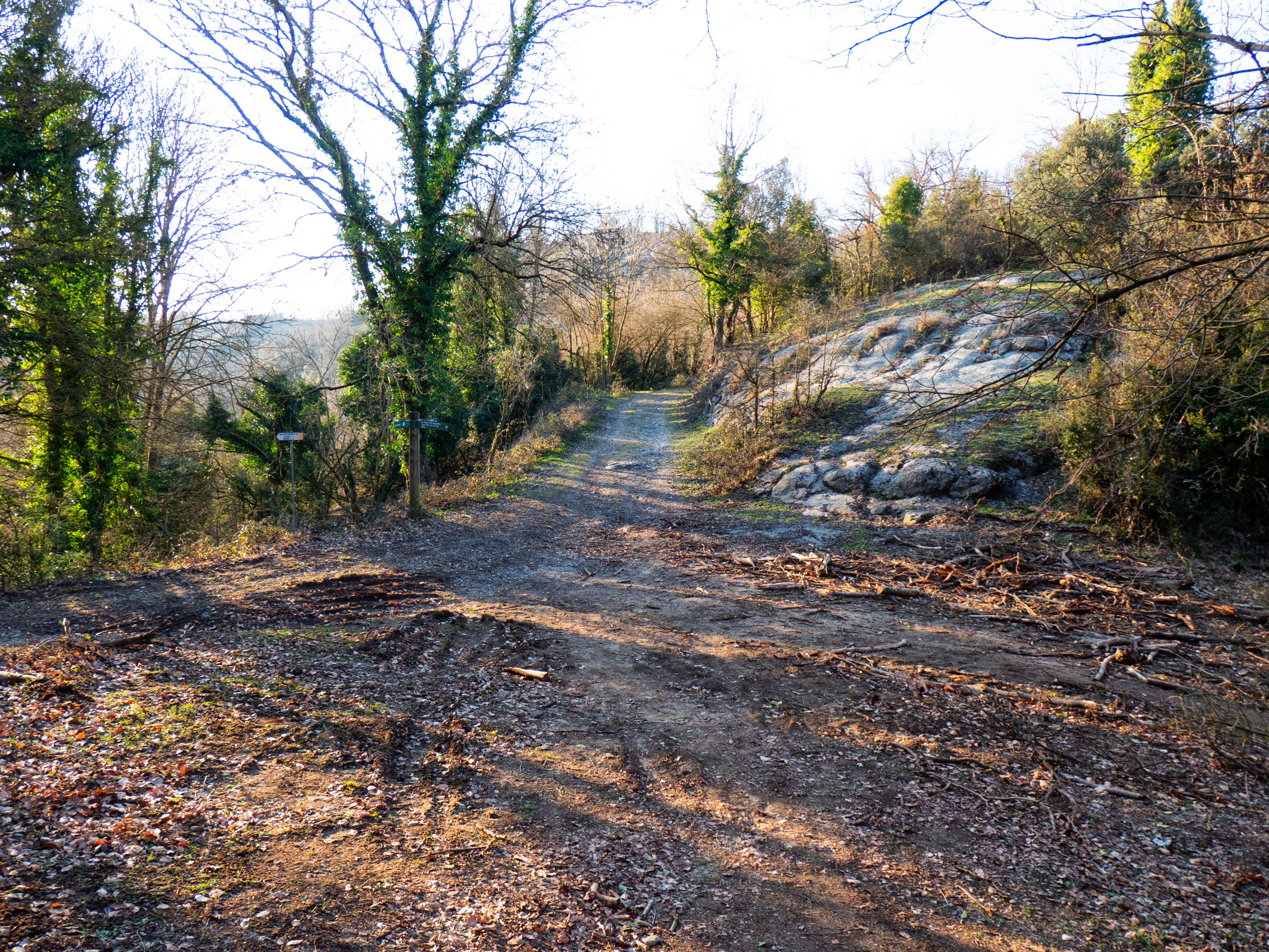 Después de una diagonal ascendente por el bosque, recuperamos por tercera y última vez la pista que ahora debemos seguir en sentido ascendente. Primero se dirige hacia el sur para, poco después, cambiar bruscamente de dirección y girar hacia el noroeste.