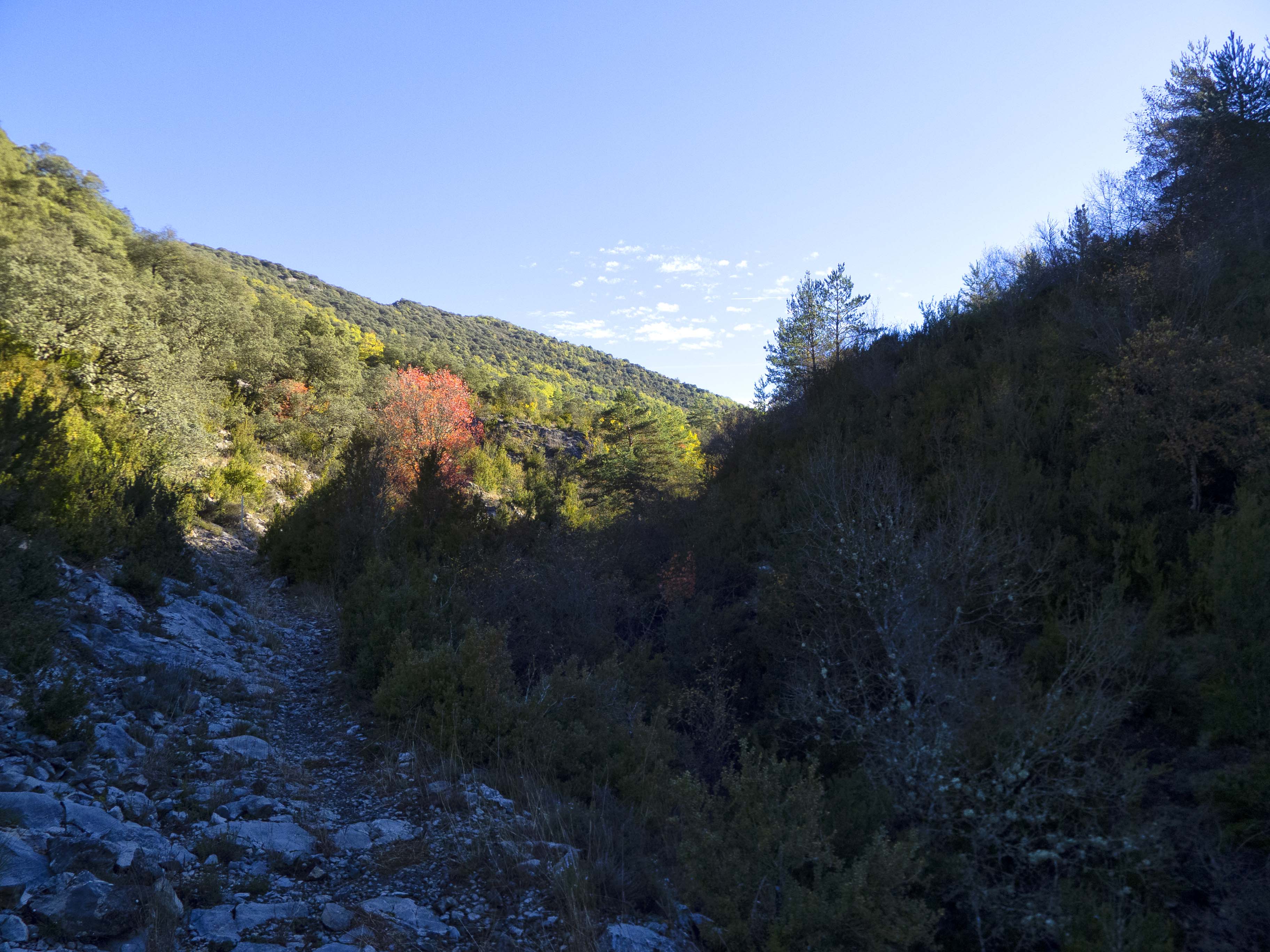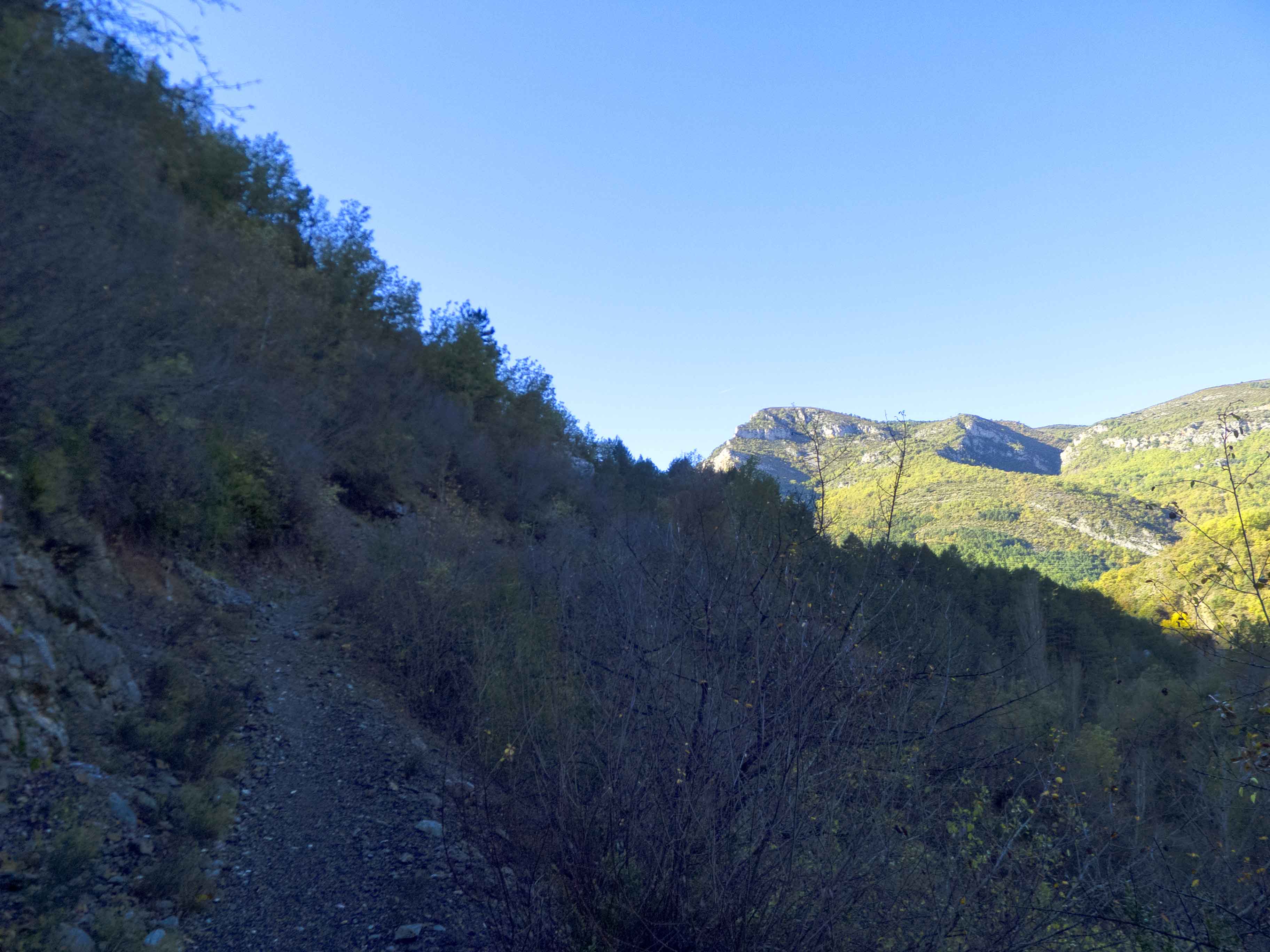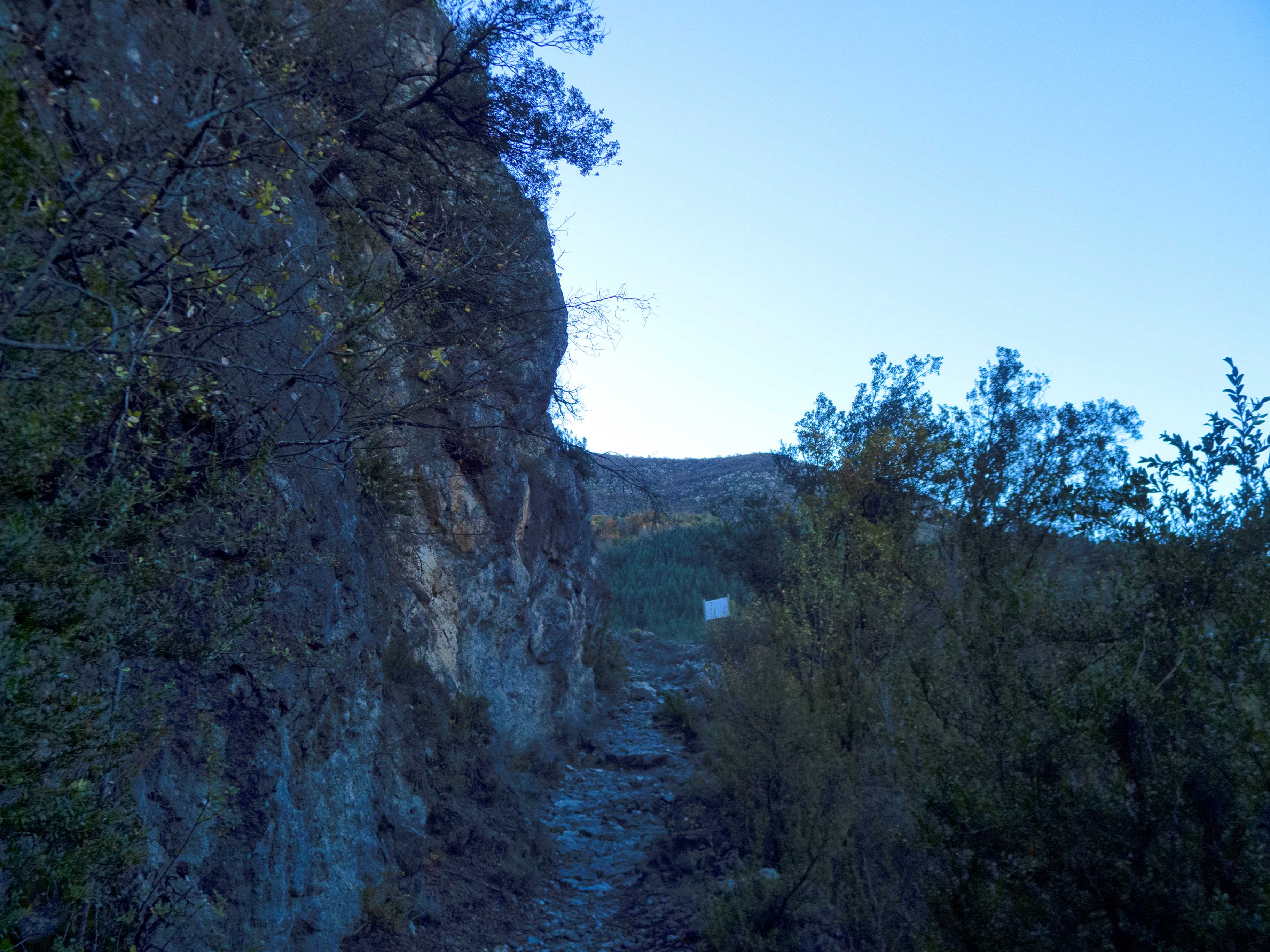 Con el Cap de la Faiada apareciendo por primera vez en la jornada, aún muy arriba, empezamos a remontar el Barranc de Montiberri en dirección al pueblo, que se encuentra en su parte alta.