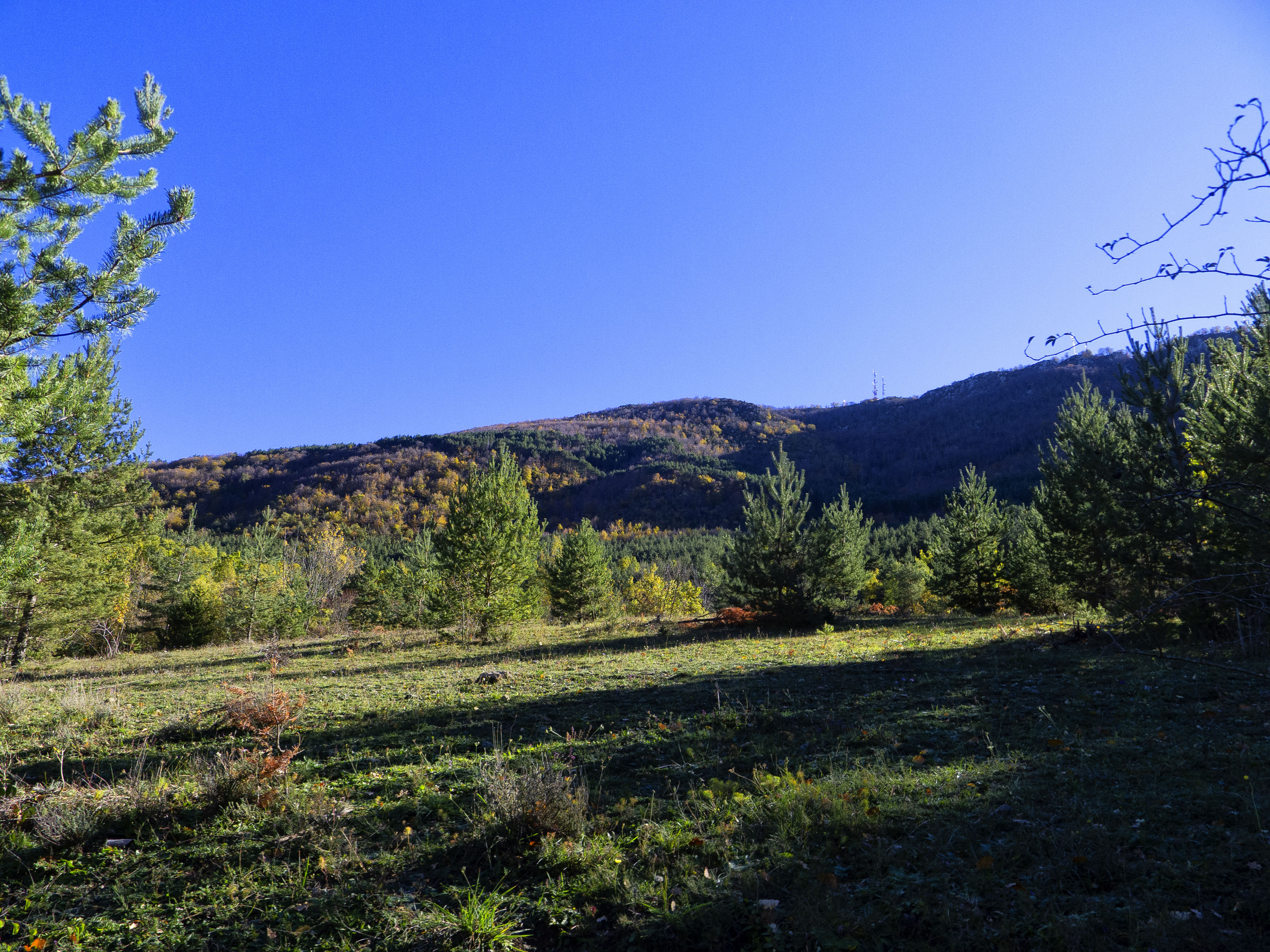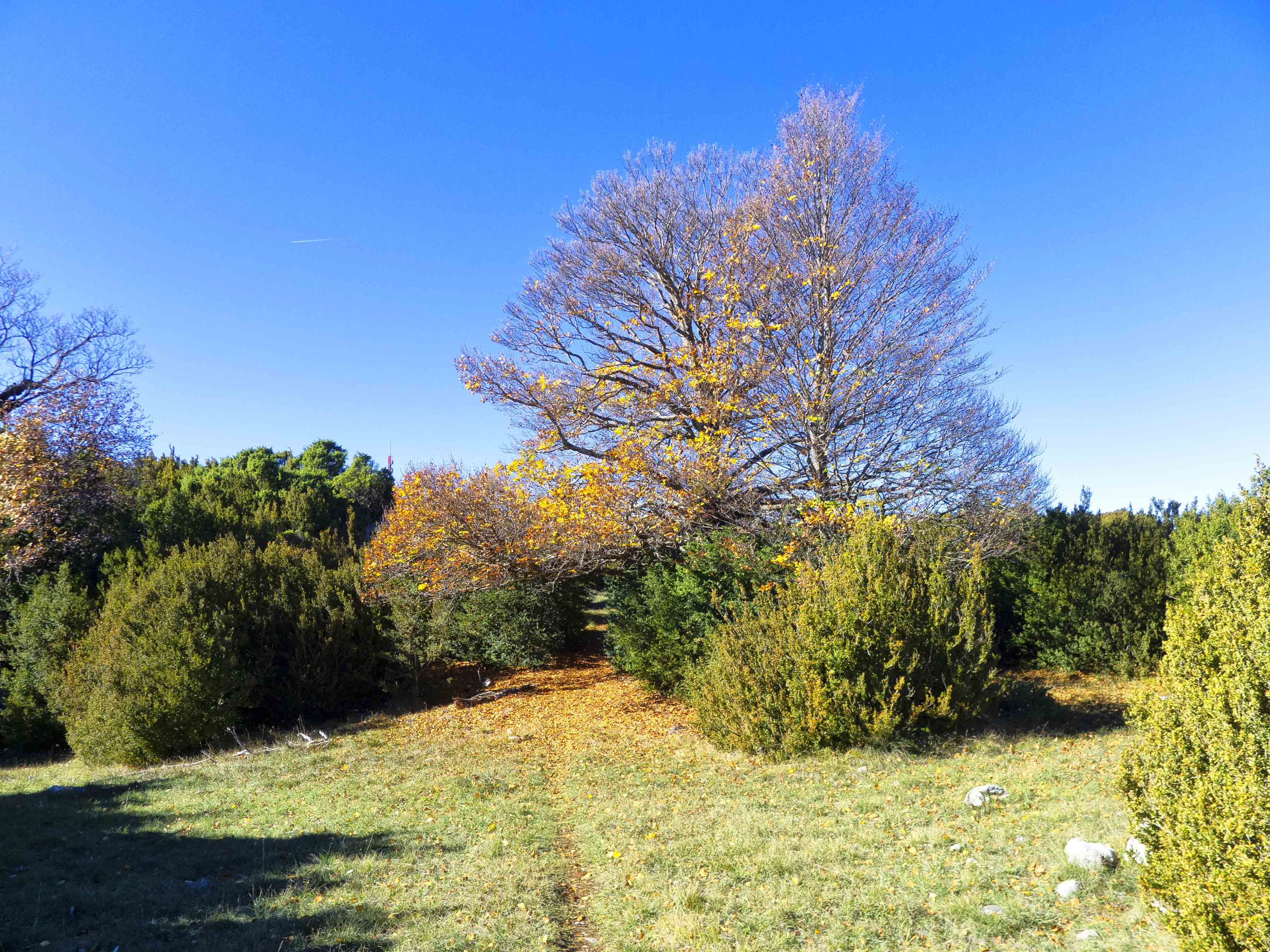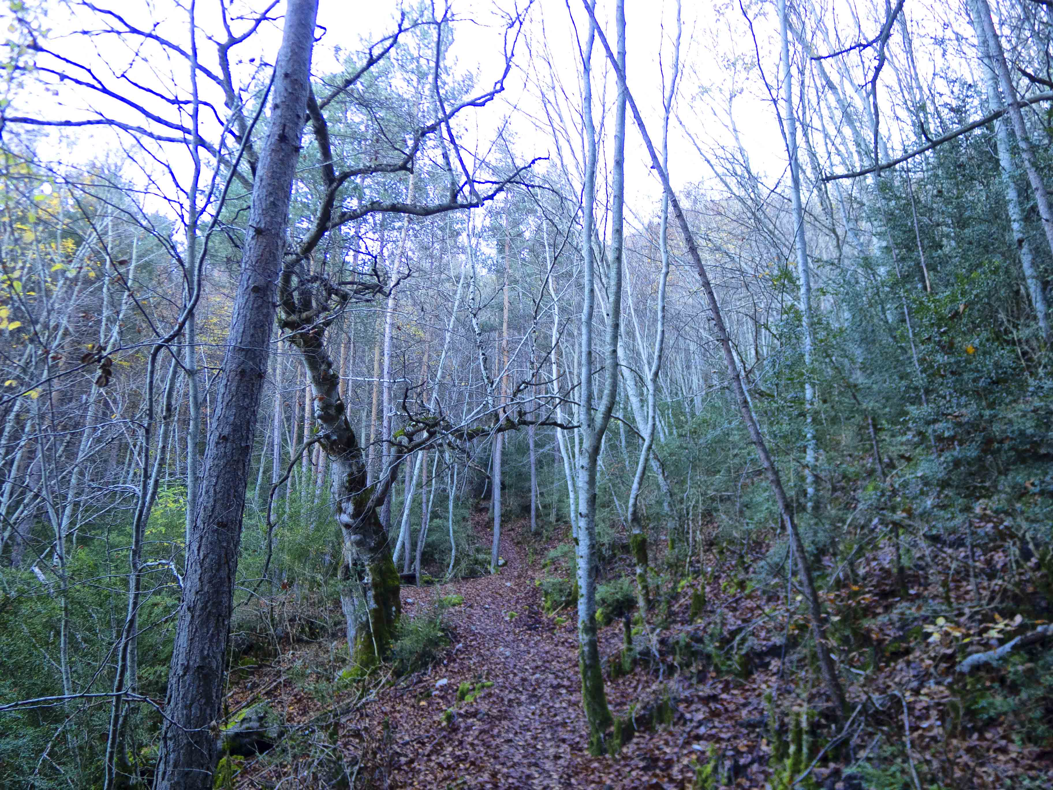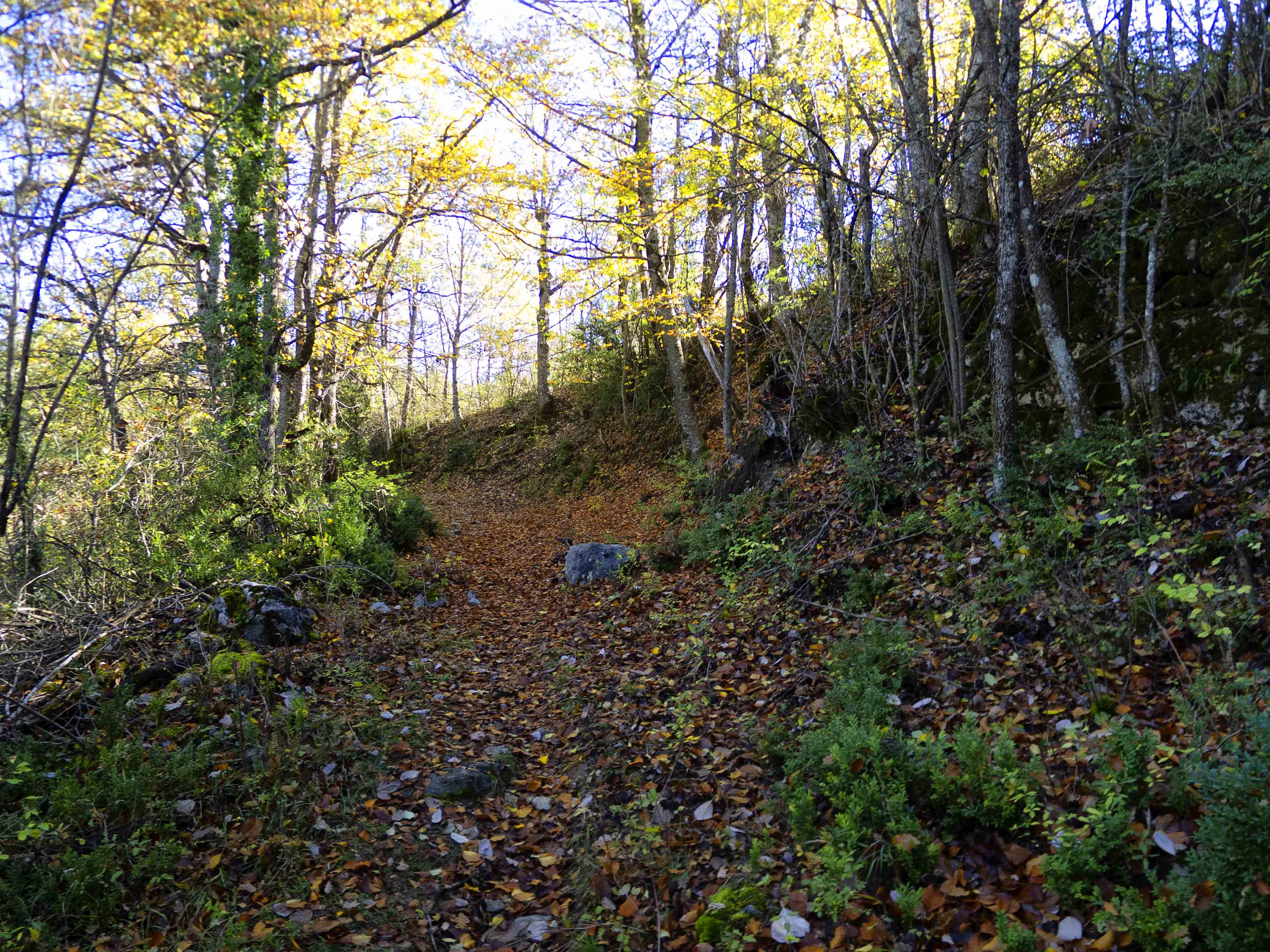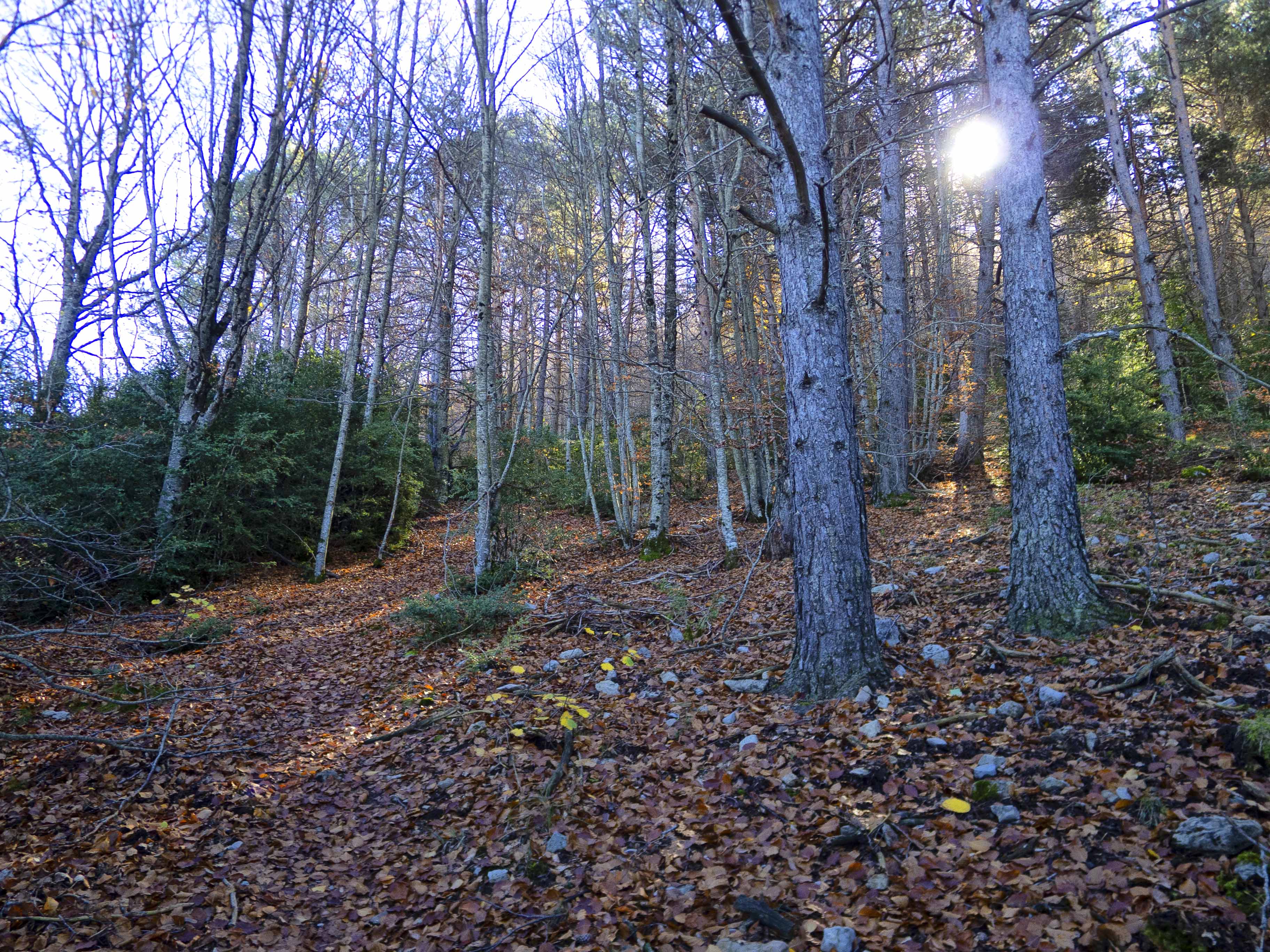 Desde allí, tenemos una bonita vista sobre la gran masa forestal que cubre la mayor parte del Cap de la Faiada, con el añadido de la luz solar que esta mañana aún estaba ausente, y que ilumina las copas doradas de las escasas hayas que resisten con sus hojas.