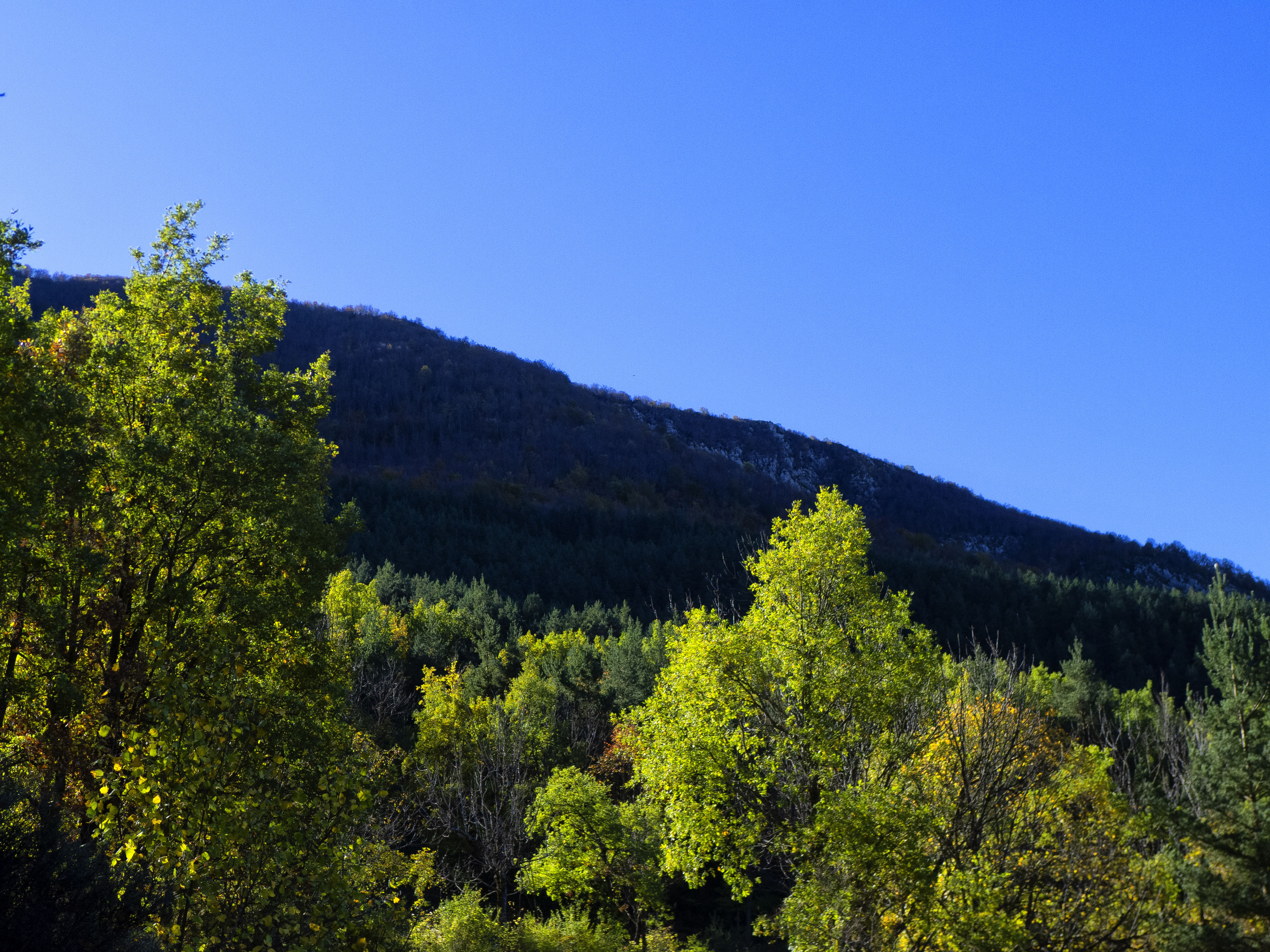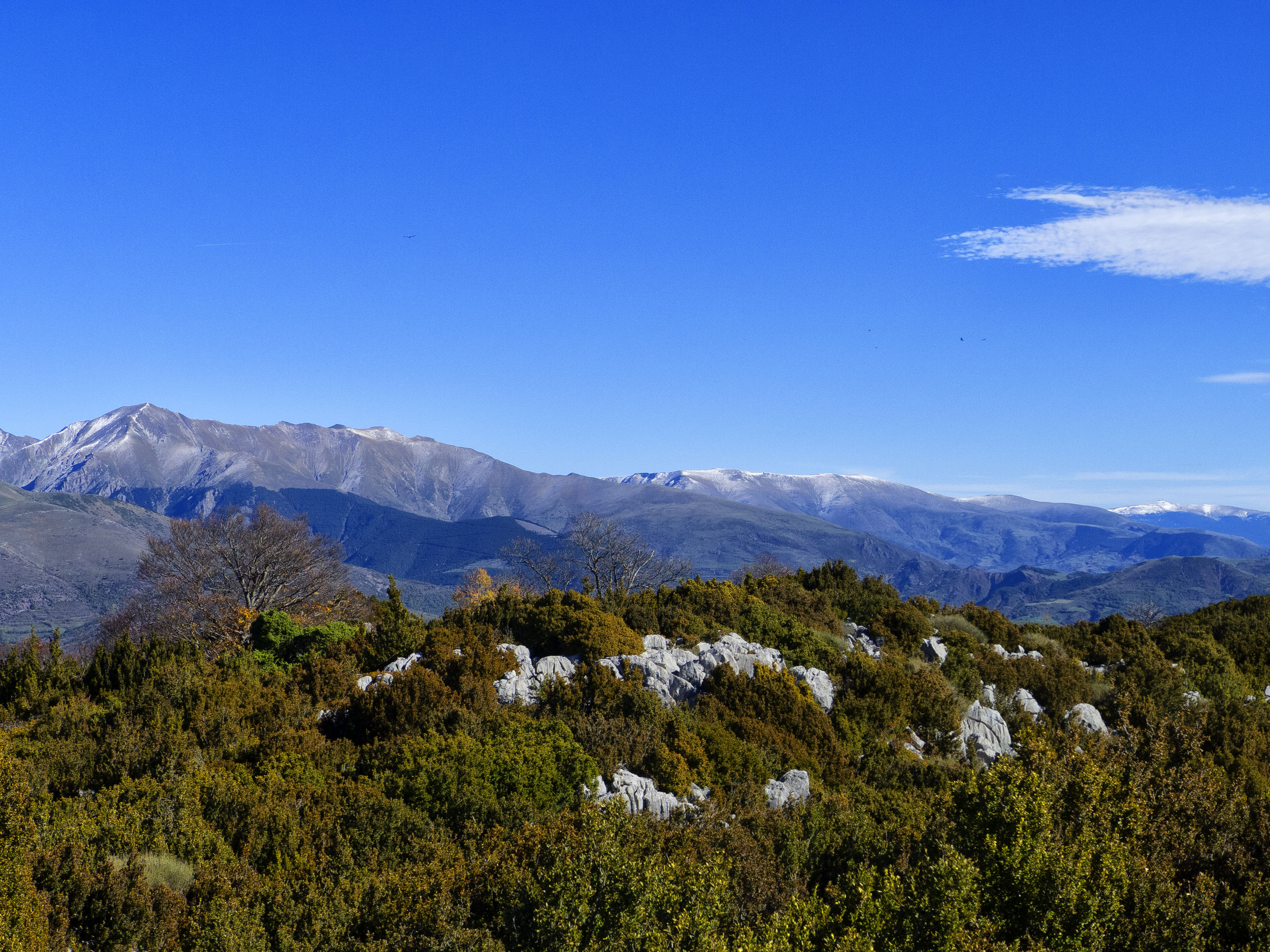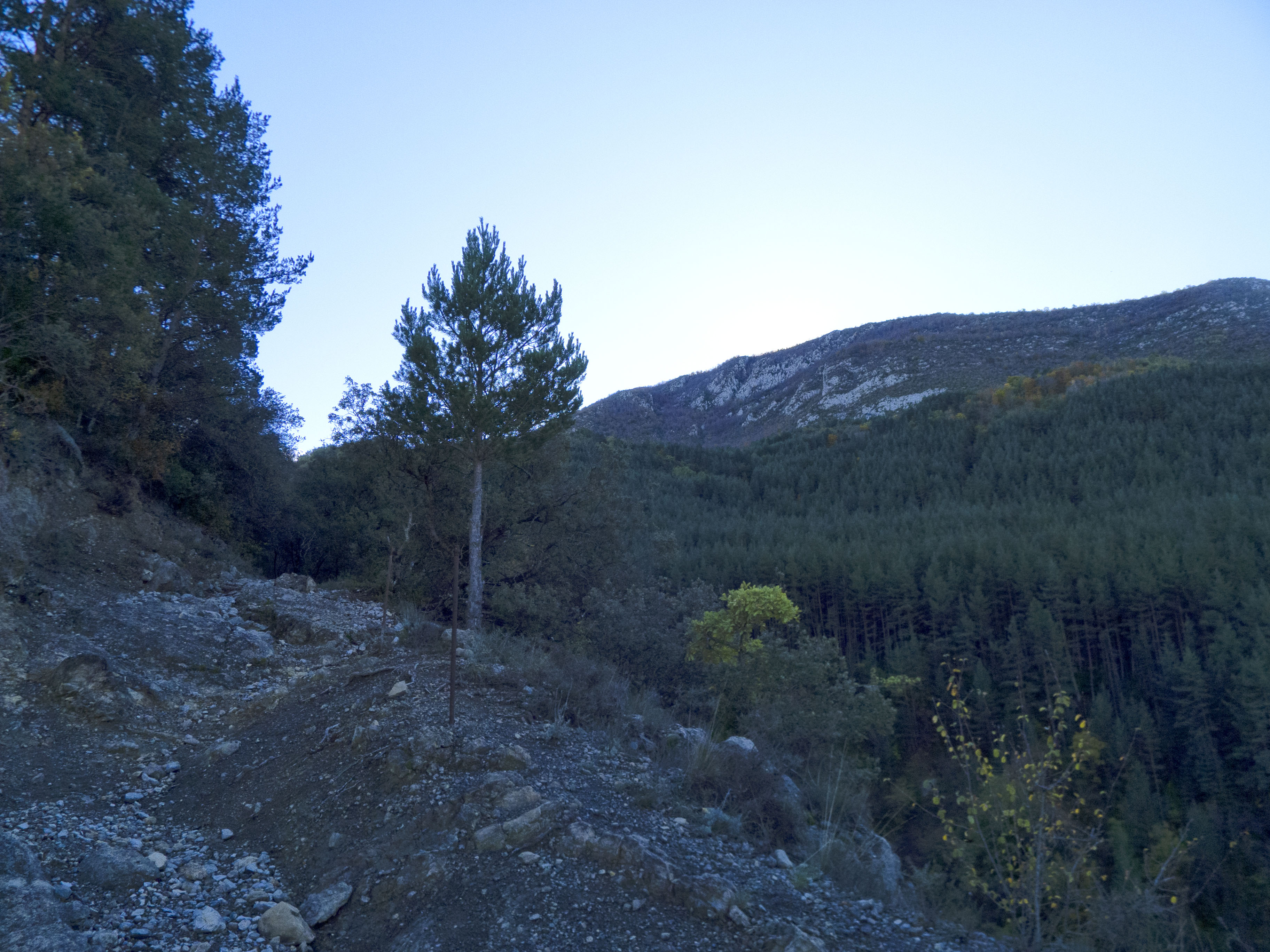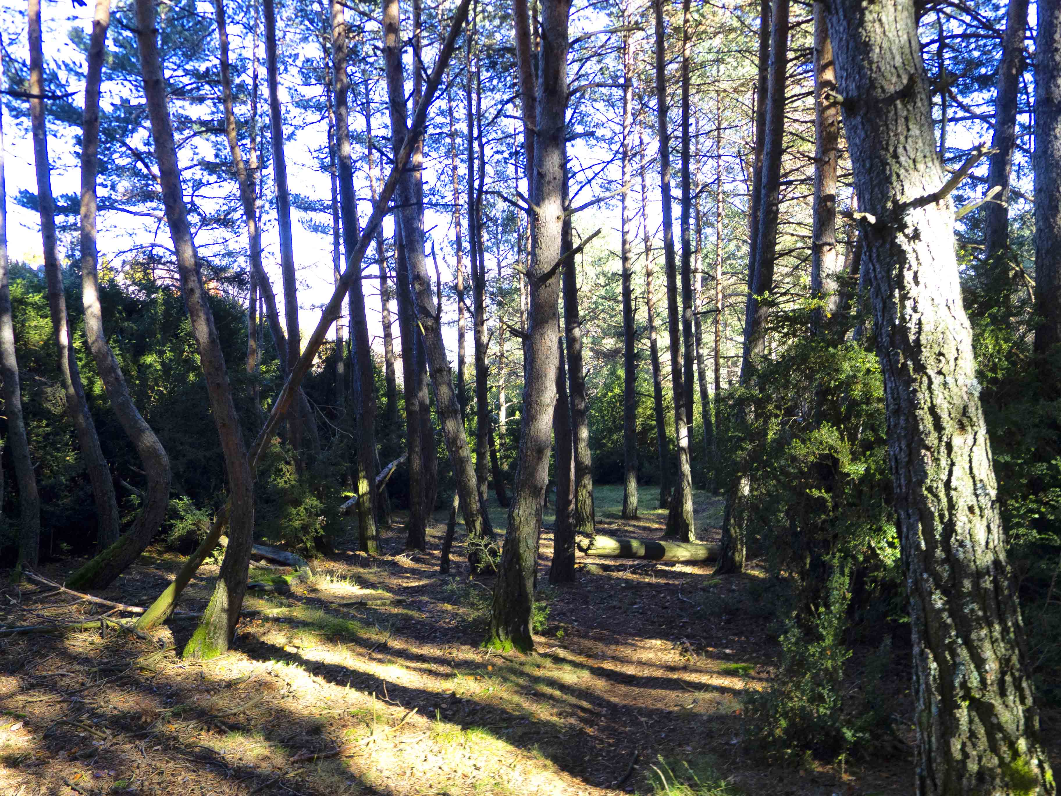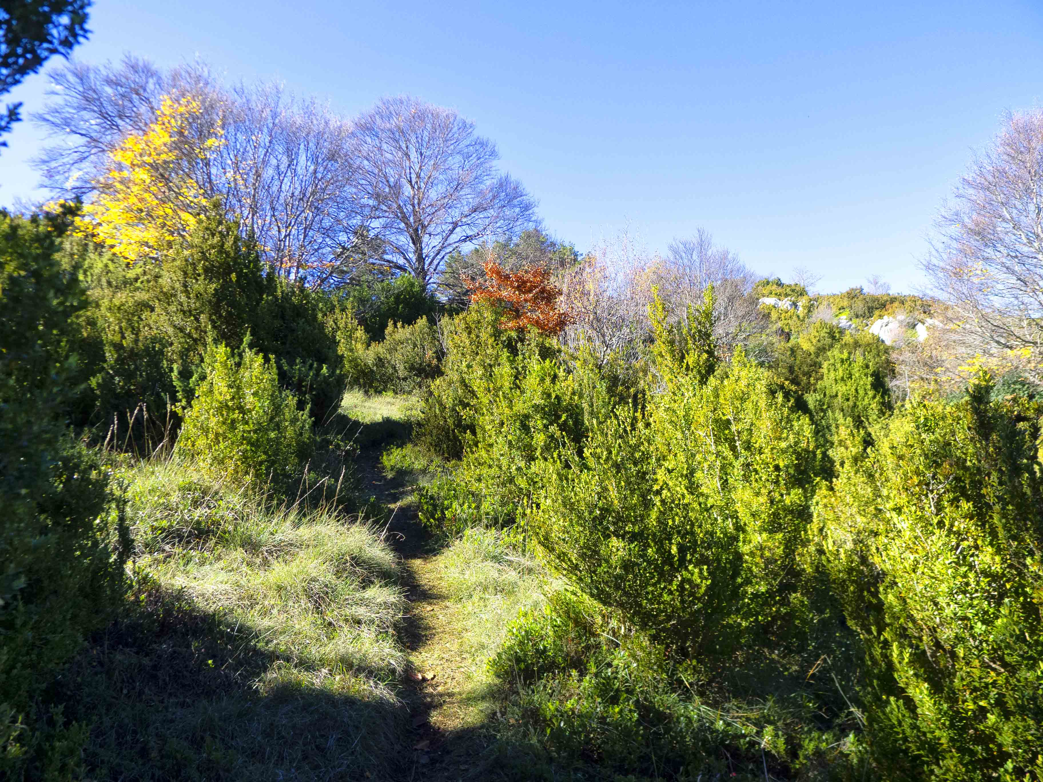 Desde allí, tenemos una bonita vista sobre la gran masa forestal que cubre la mayor parte del Cap de la Faiada, con el añadido de la luz solar que esta mañana aún estaba ausente, y que ilumina las copas doradas de las escasas hayas que resisten con sus hojas.