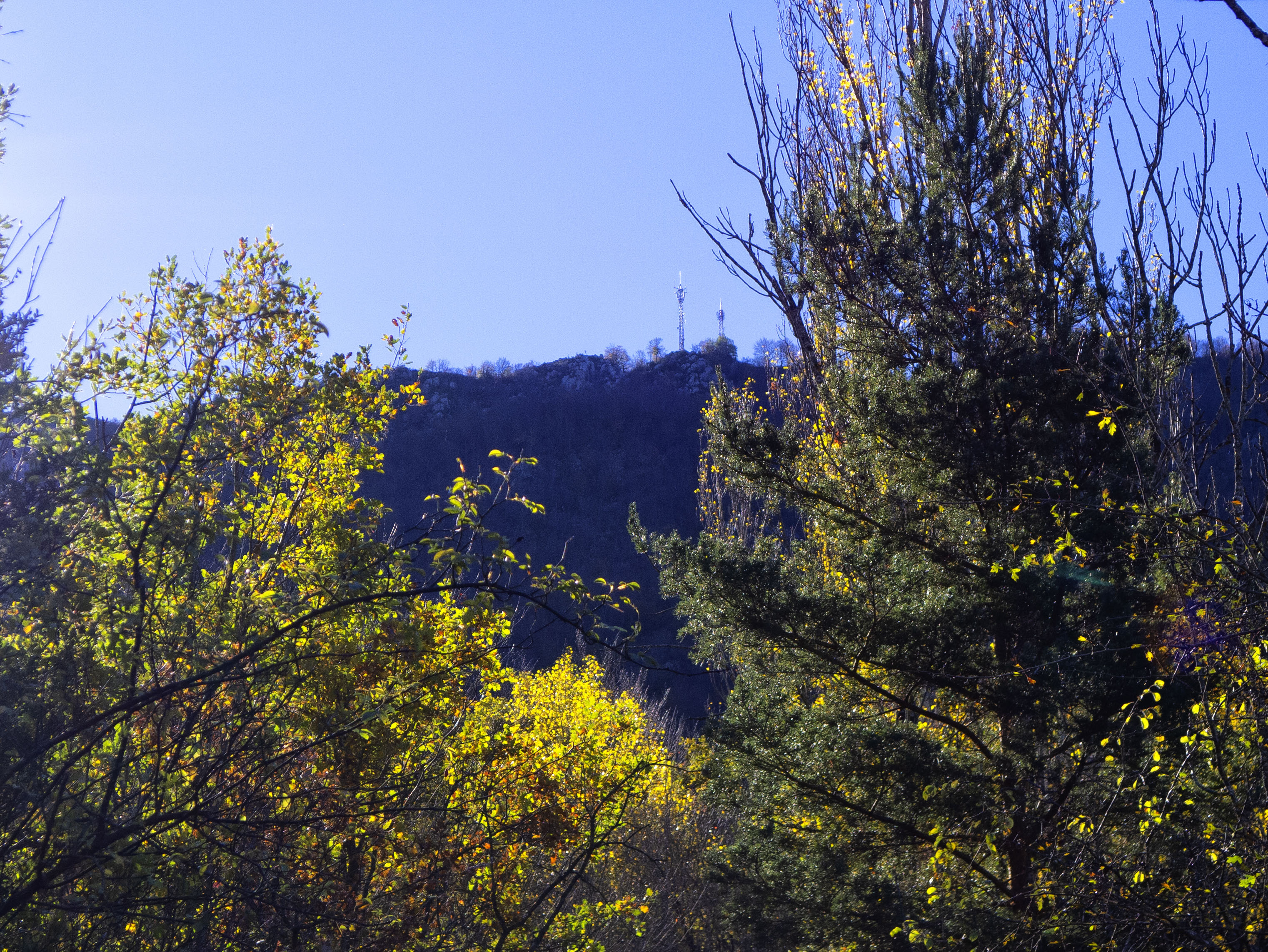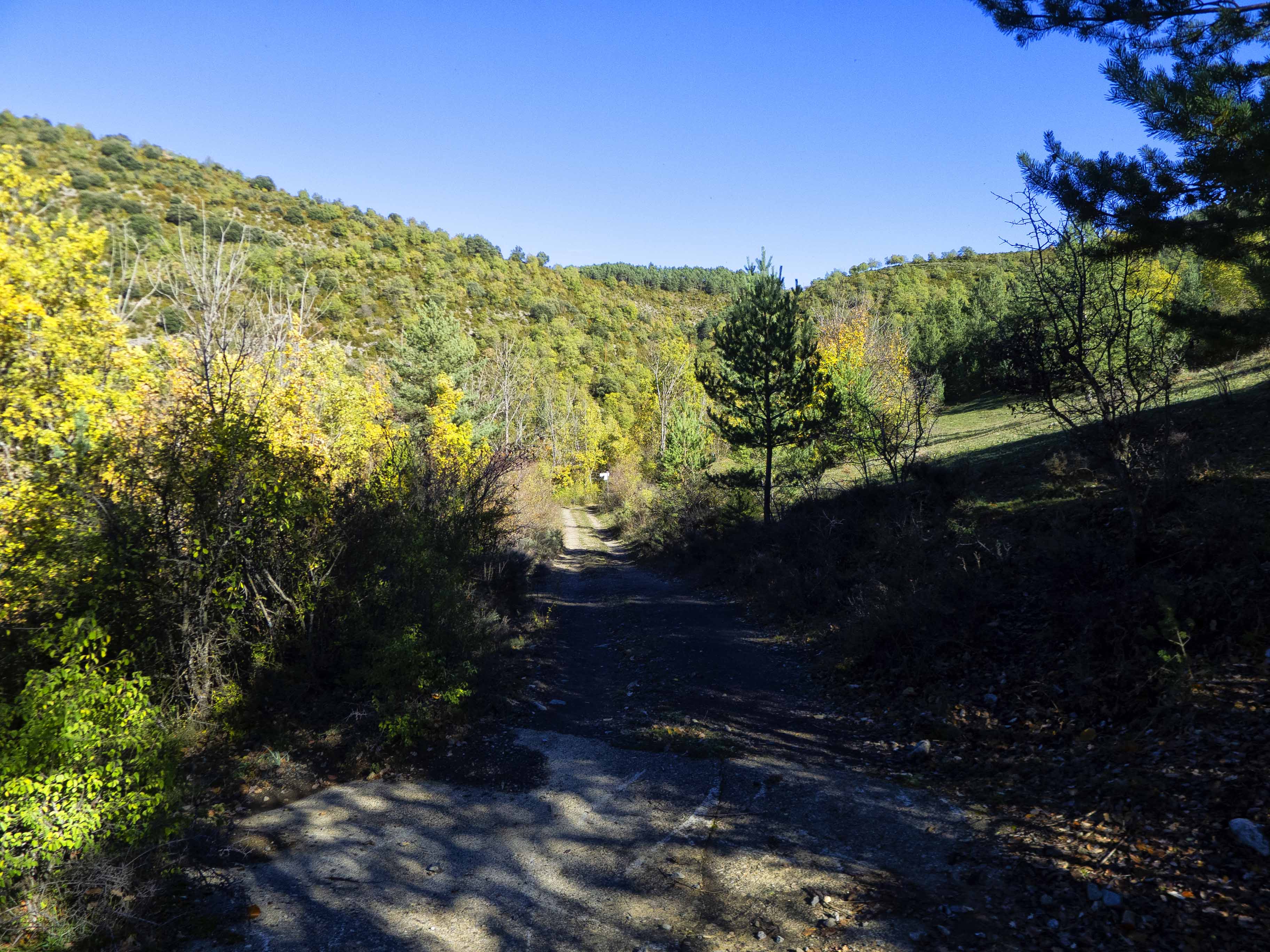 Atrás dejamos Montiberri, en mitad de un bosque plenamente otoñal, con la Roca de la Savina en segundo plano.