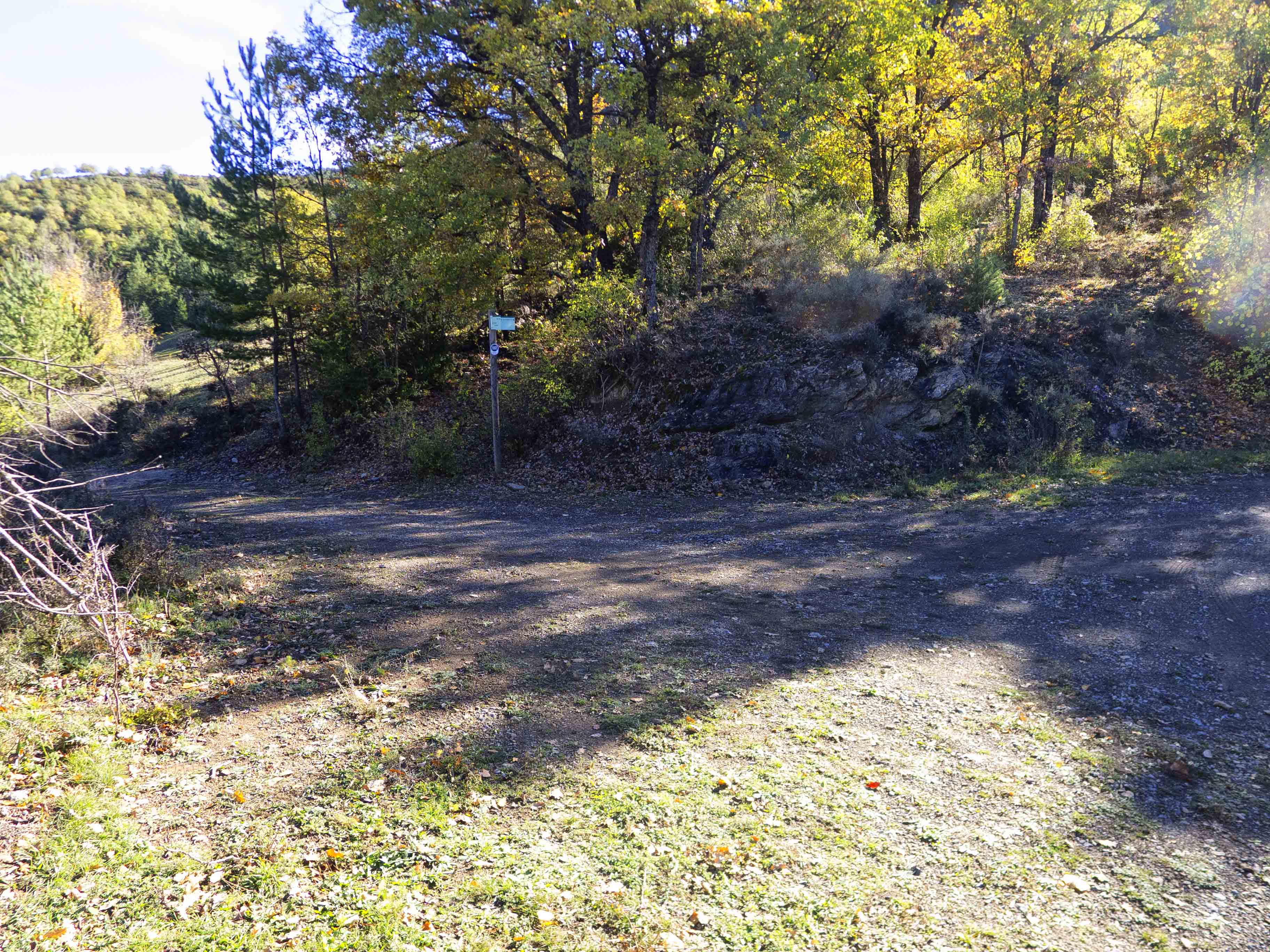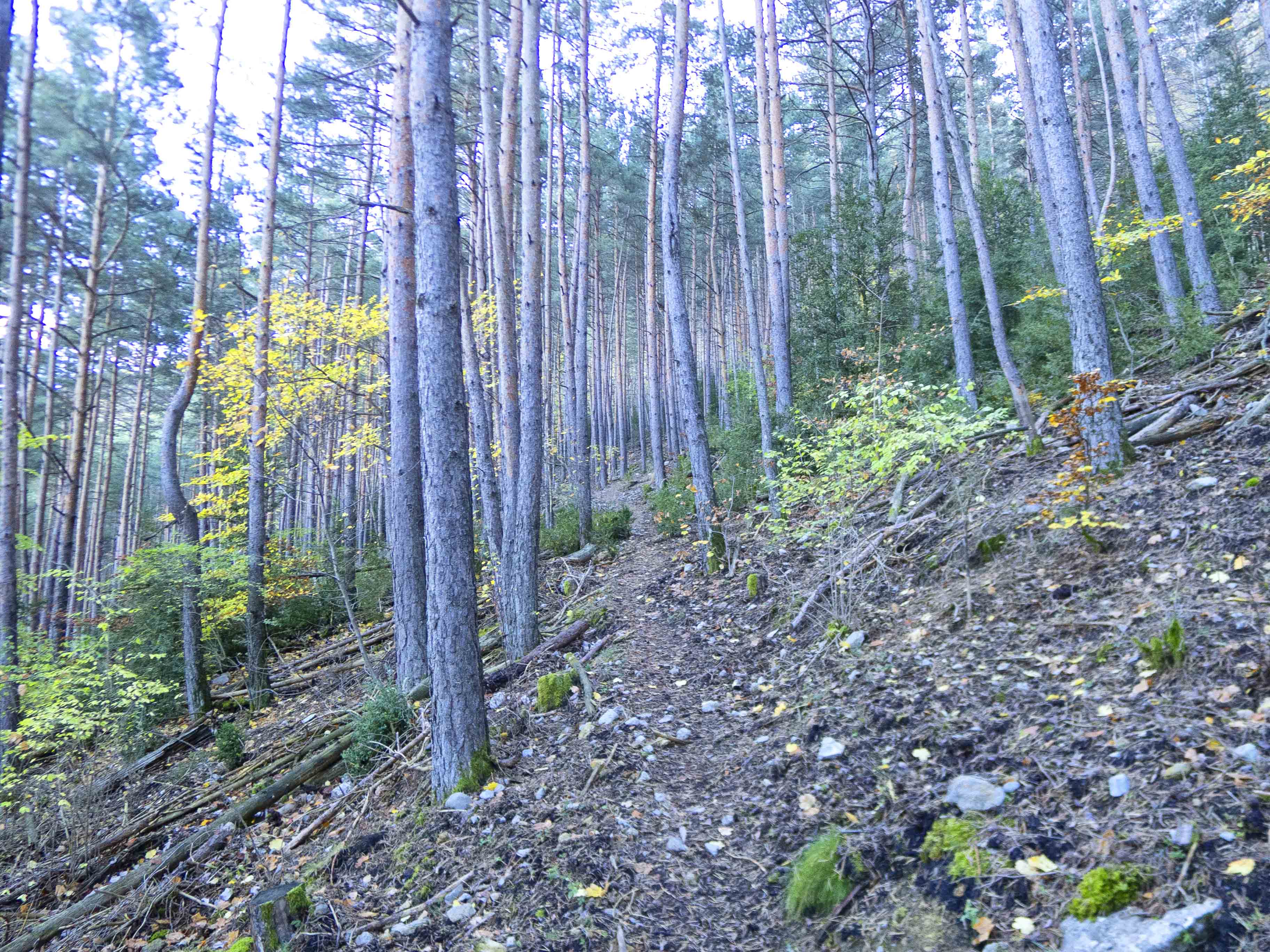 La diagonal finaliza en un ancho rellano donde el sendero queda camuflado entre la alfombra de hojas que cubre el suelo. Sin embargo, el camino a seguir es claro, y rápidamente el trazo vuelve a marcarse.