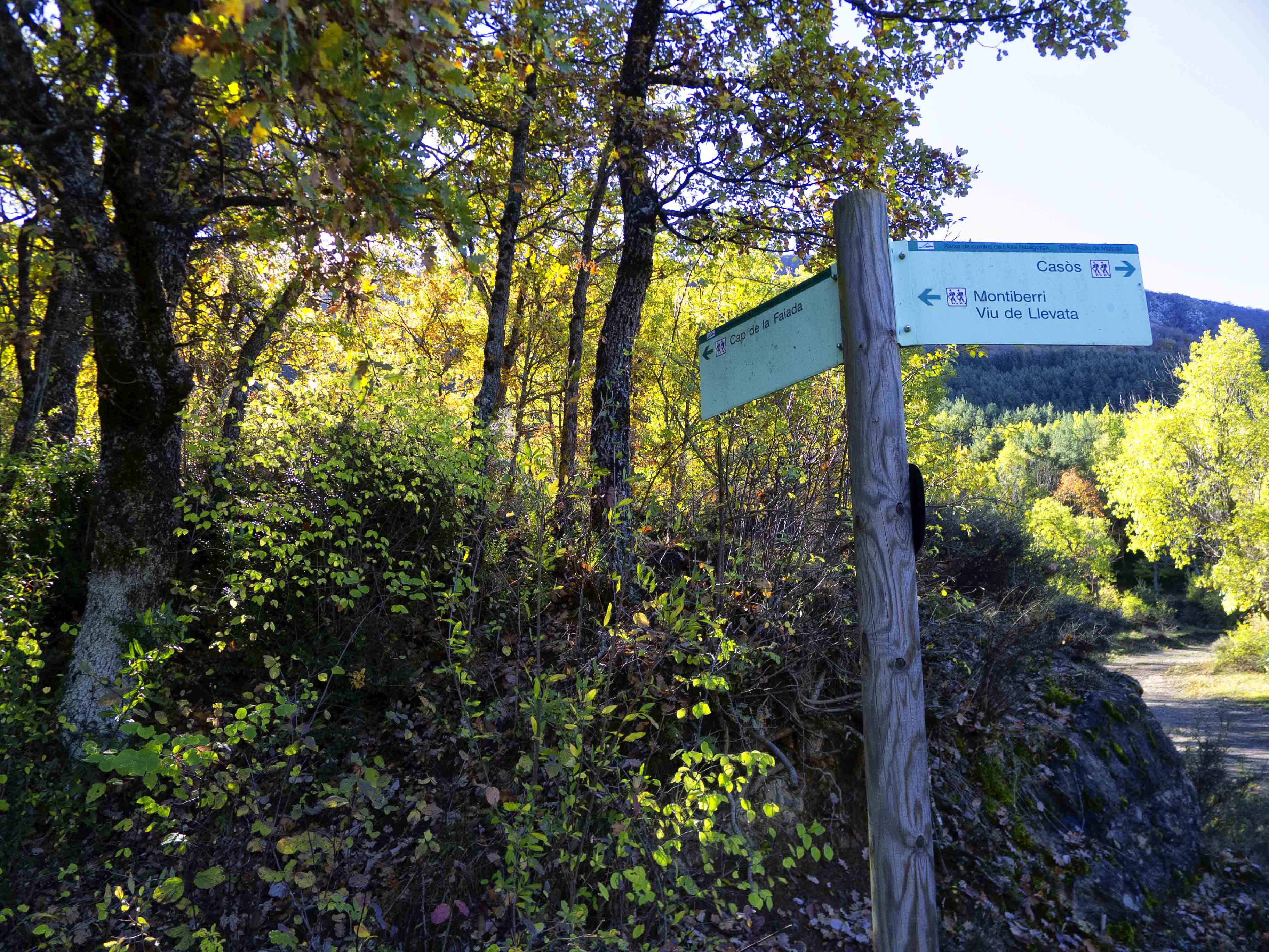 El camino nos deja en la pista que proviene de Viu de Llevata. Al otro lado de la pista aparece otro cartel donde se retoma el sendero al Cap de la Faiada.